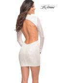 Create a confident pose as you arrive wearing this stunning cocktail dress from La Femme 29406. Featuring a chic high neckline and long, slender sleeves, the dress adds a touch of allure with a mirrored cut-out side panel along the waist, extending to the captivating open back. This figure-flattering piece is adorned with iridescent sequins that cover its entire body, creating a mesmerizing mid-thigh length look. Be prepared to ignite a spark and capture attention in this La Femme 29406 creation.