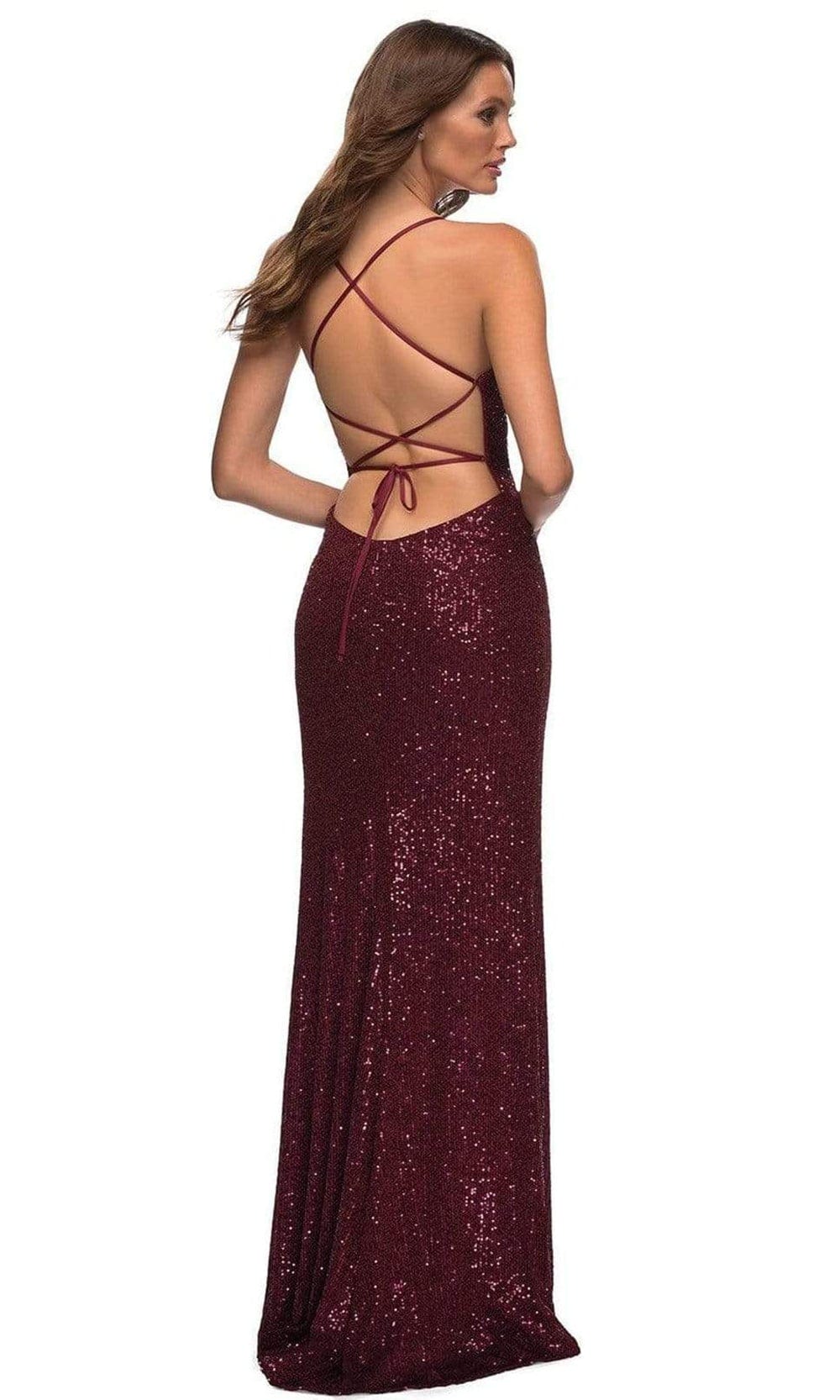 Grace the red carpet with style in this La Femme 29438 creation. Gleaming with iridescent sequins, this gown crafts a low v-neckline on a wrap bodice. Nipped with a lace up back, the sheath skirt parts with a slit and flows into a train. Shine among the stylish crowd in this La Femme masterpiece.