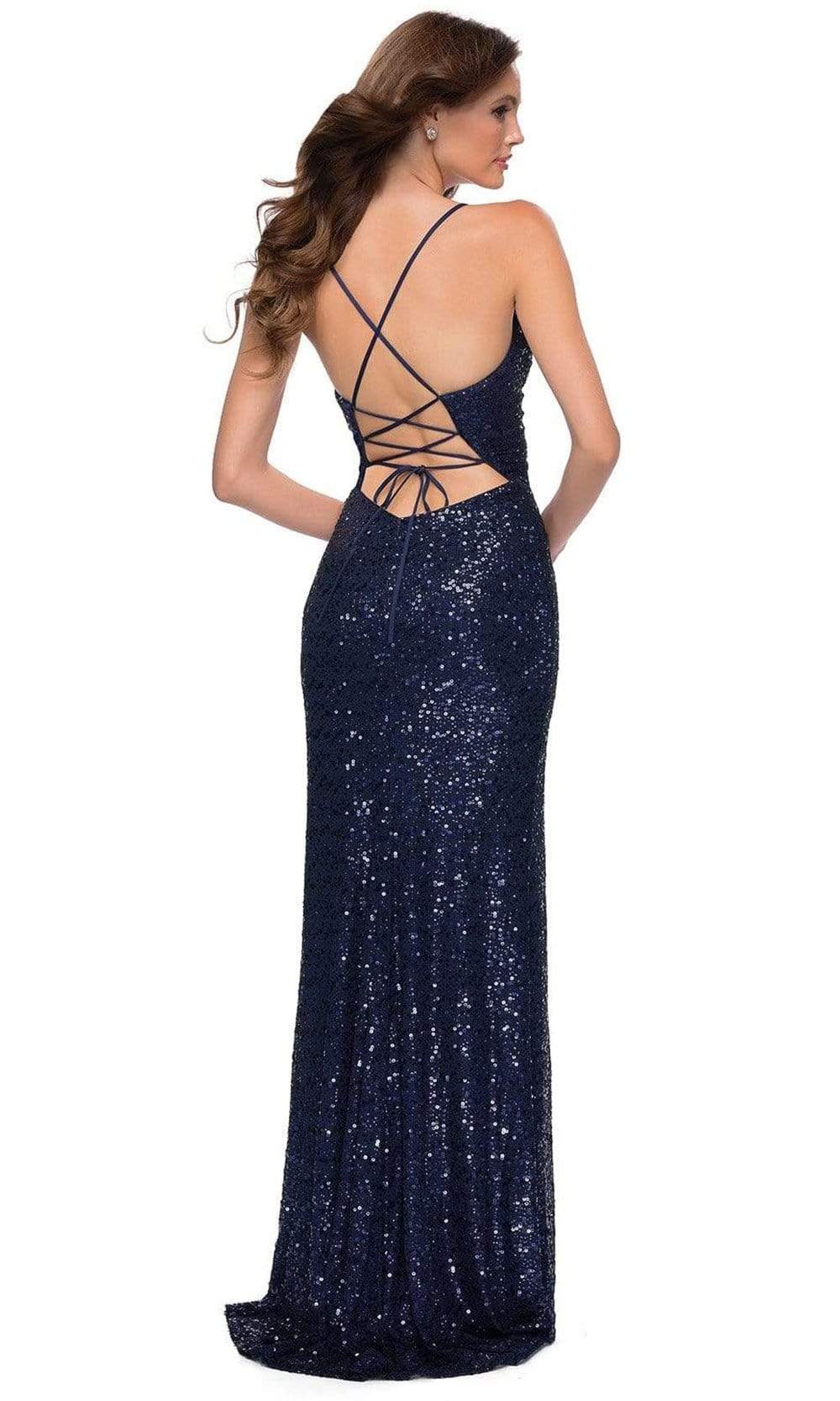 Make their eyes sparkle when you walk in in this La Femme 29657 creation. Embellished with sequins shimmering its length, this dress flaunts spaghetti straps stringing into a v-neckline with a cowl accent. The straps crisscross the open back. The sheath skirt parts with a slit as it flows to a train. Lavish in the iridescence of this La Femme masterpiece.