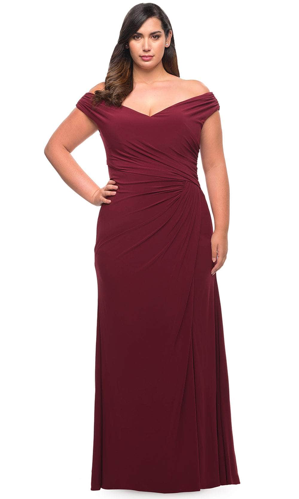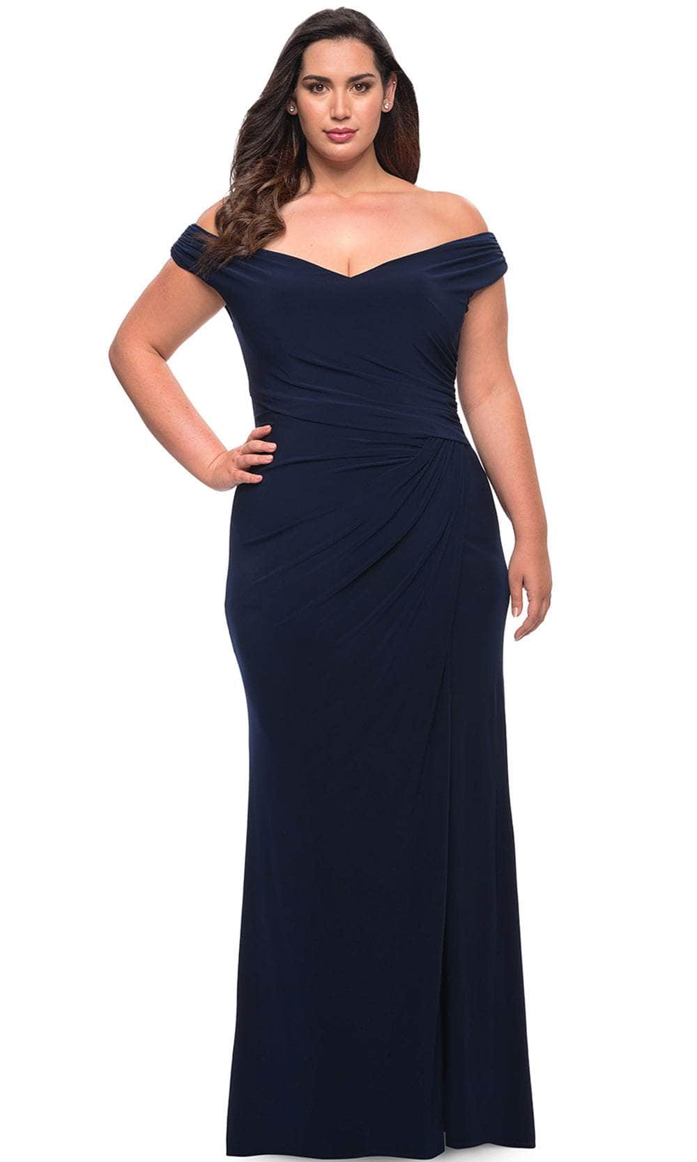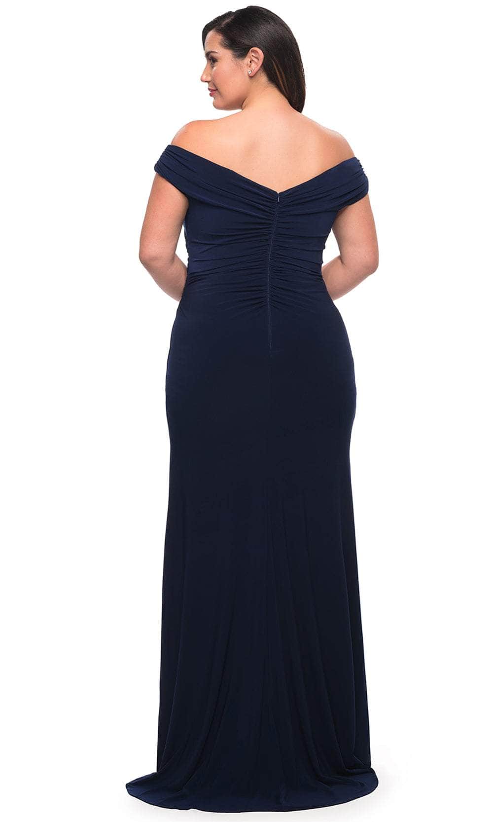 Your sensual self-assurance will soar as you fashion in this La Femme 29663 ensemble to that exciting event. The elegant ruching on the fitting bodice of this stunning gown complements the sweetheart neckline and off-the-shoulder sleeves of this stunning gown perfectly. The skirt has a thigh-high slit and a brush train that tapers to a point at the hips. Wear this beautiful La Femme piece to your opulent soiree and revel in your inner fashionista. Model is wearing Black, Dark Emerald, Navy, and Wine colors.