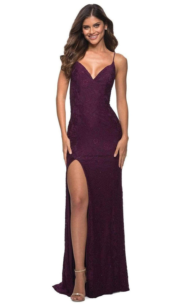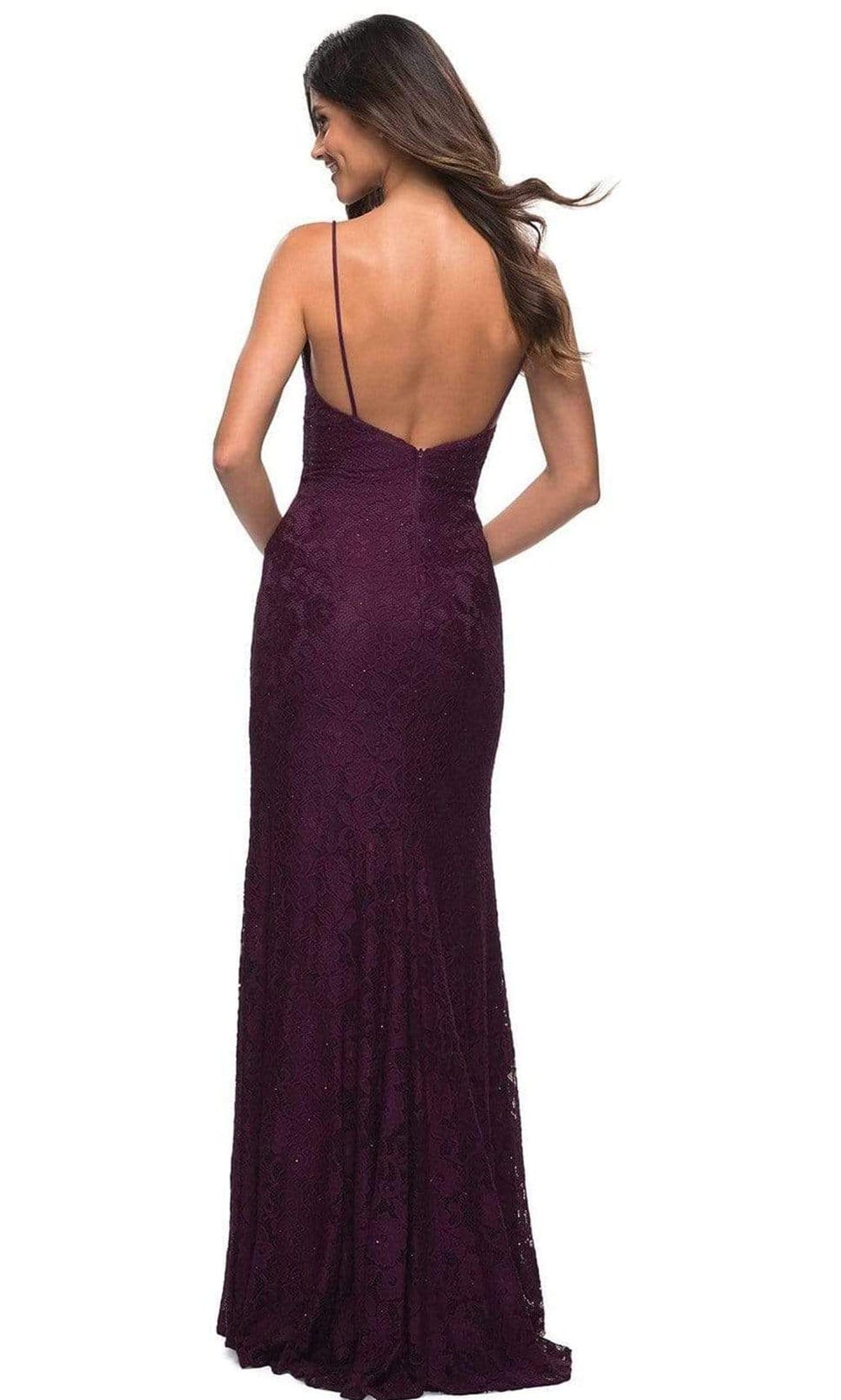 Be the lady of the night in this La Femme 29700 creation. This gown charms in a sleeveless and Low V-neckline with a fitted bodice made of stretch lace fabric and has a glitter accent. Spaghetti straps lend support to the top as it leads to the low open back enclosed with a center zipper closure. The full-length sheath skirt finishes in a sweep train. This La Femme evening gown is a classic look that works for many special occasions. Model is wearing Dark Berry color.