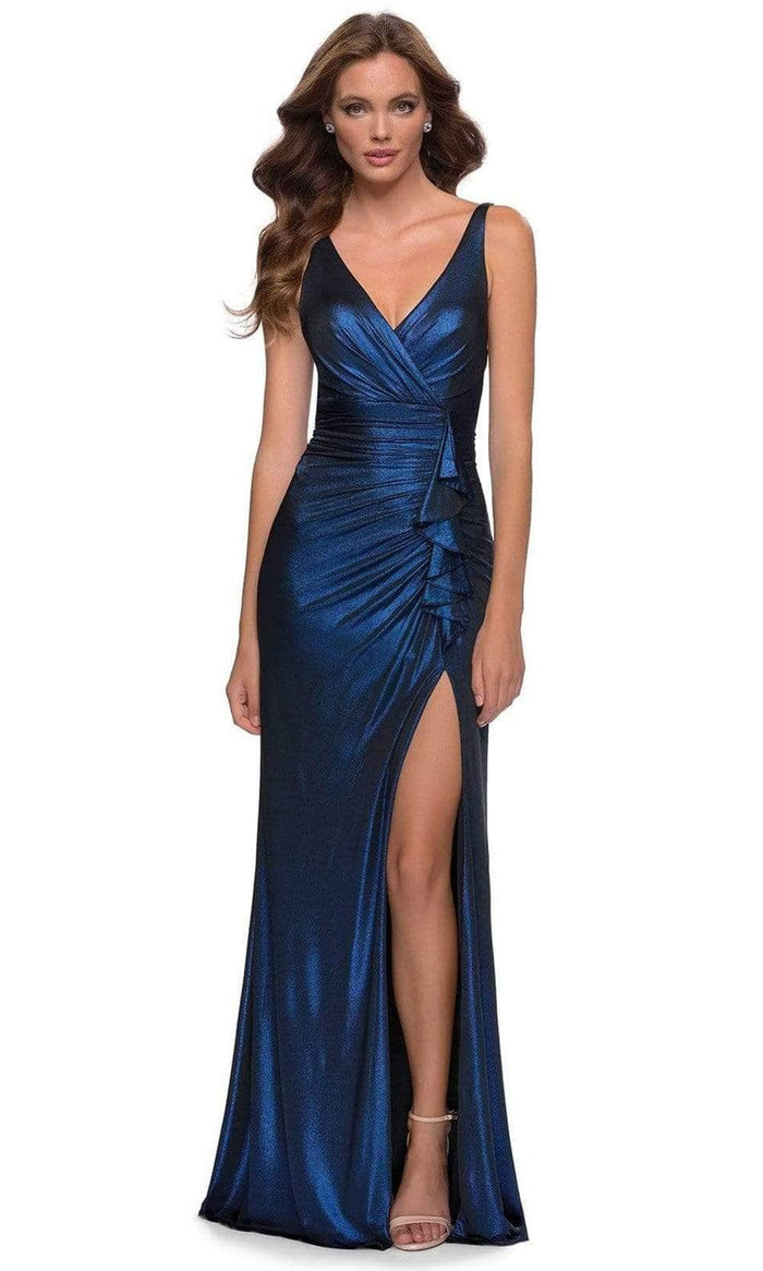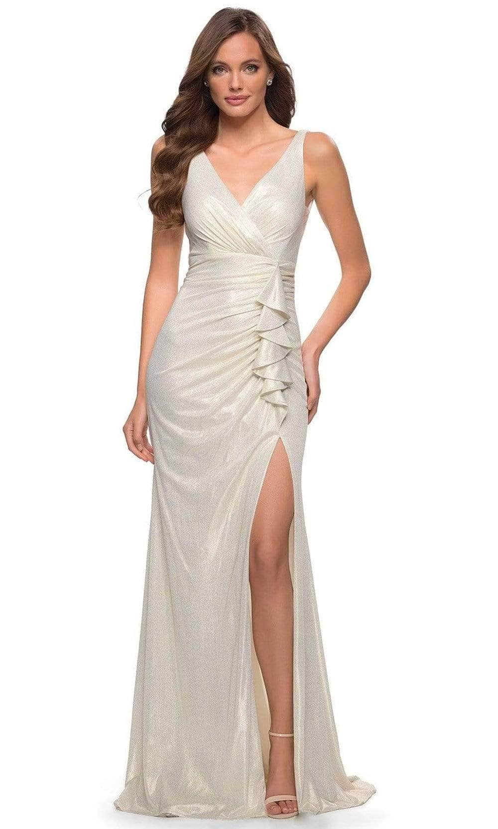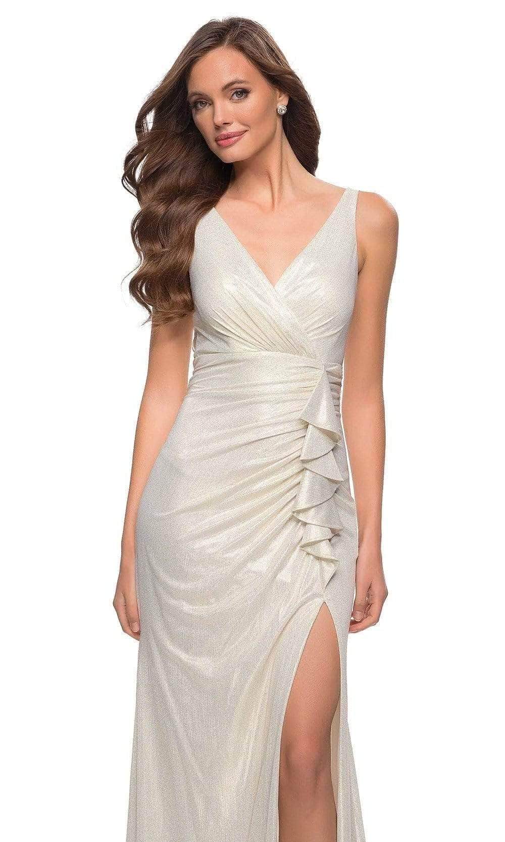 Showcase your best features and enthrall the crowd in this La Femme 29759SC outfit. This statuesque dress is fascinatingly made from shimmer jersey fabric and has a sleeveless design that keeps you comfortable. With wide straps that offer support, it flaunts a surplice deep v-neckline and low V-shaped back. The fine ruching and ruffle drapes show an extra level of glamour. The skirt glides to the sweep train in a flattering sheath silhouette and has a thigh-high leg slit on the side for a sexy finish. Create enchanting moments as you dazzle in this La Femme 29759SC masterpiece.