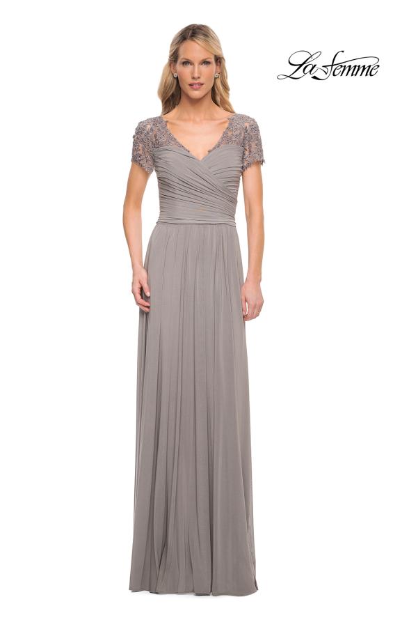 Express your unique persona classic sophistication in this La Femme 29772 evening dress. This dress fashions a V-neckline supported by sheer lace short sleeves in a ruched bodice. Revealing an A-line silhouette, this also displays a full back with back zipper closure. Appear in elegance as you wear this La Femme creation.