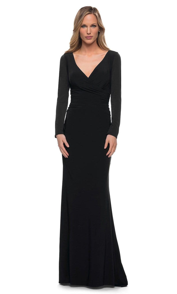 Be strikingly gorgeous in this elegant La Femme 29924 evening dress. This dress fashions a V-neckline supported by long sleeves in a fitted and ruched bodice. The skirt reveals a sheath silhouette while the back shows a full back with back zipper closure. You will be an enchanting beauty in this La Femme creation. Model is wearing Black color.