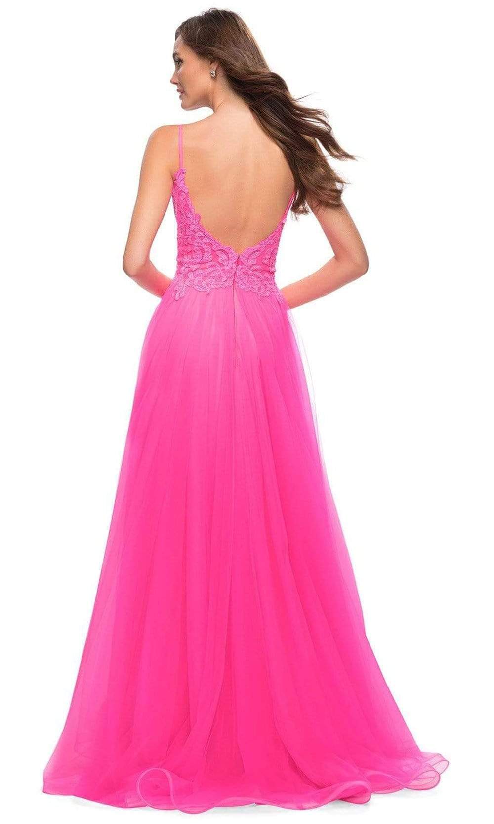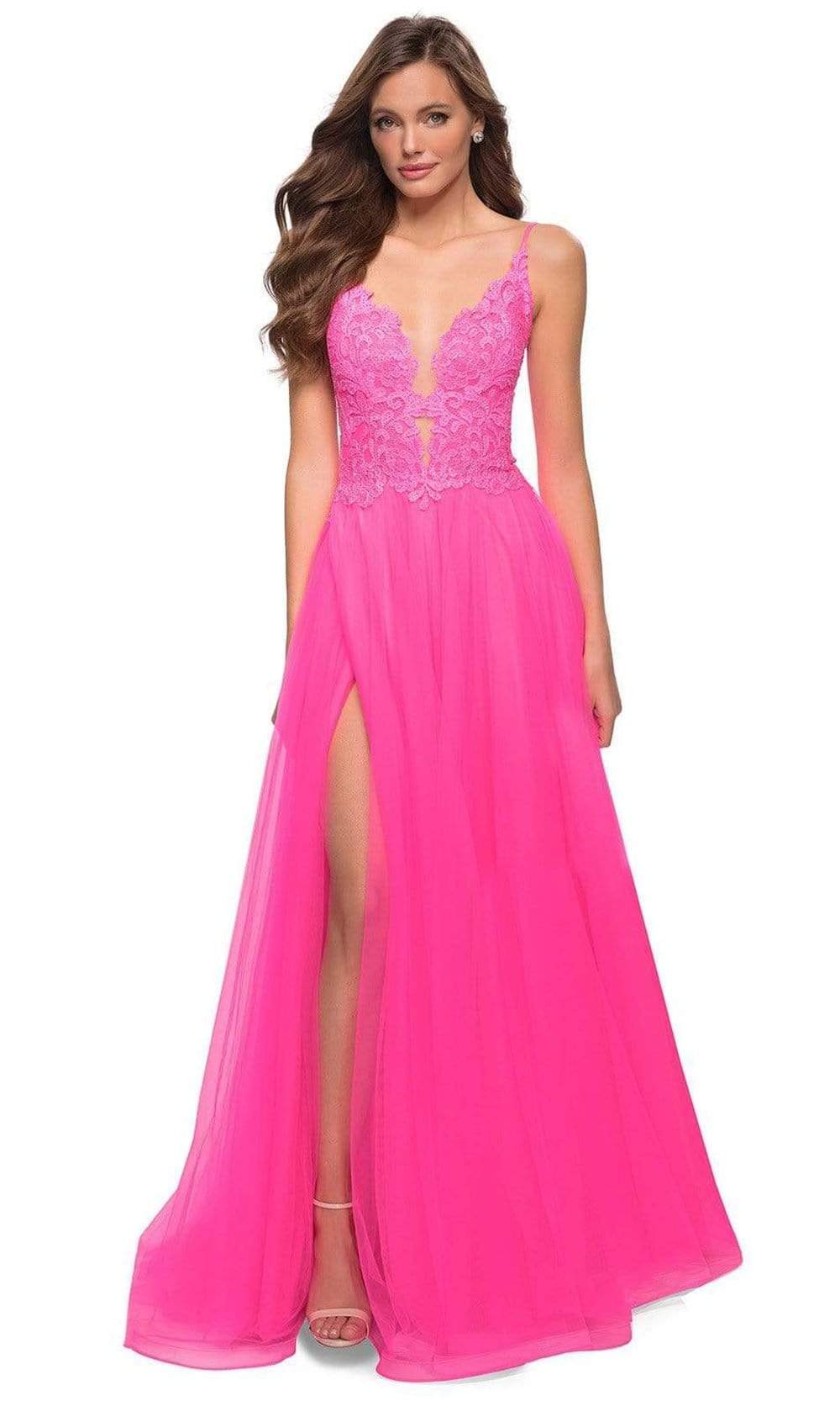 Be a woman of style and beauty with this La Femme 29964 evening dress. This line tulle gown features a slit and lace bodice with sheer illusion net covered in lace applique. This has a low V back and deep illusion V front with zipper closure. Embrace a style that is immaculately sultry as you glam up for your event in this La Femme creation.