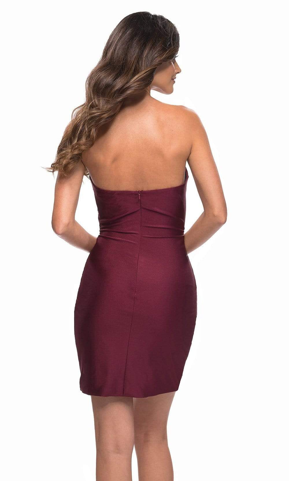 Have all eyes on you in this inspired La Femme 30076 creation. . Accented with shirring on a wrap style jersey silhouette, this dress flatters with a sweetheart neckline and a midrise back. The skirt sculpts into a short peaked hemline. Dare to flaunt those stunning curves in this La Femme masterpiece.