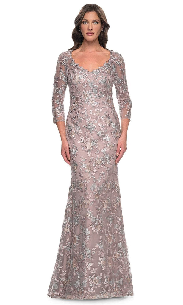 Look effortlessly stylish in this La Femme 30081, a beautiful lace dress with charm and sophistication. Intricate floral embroideries create a captivating visual impact. With a mermaid-style skirt, a V-neckline adds a touch of allure to the design, while sheer three-quarter sleeves provide an elegant and modest look. A back zipper closure ensures a seamless fit, completing this enchanting ensemble. La Femme 30081 is the epitome of grace, making it an ideal choice for any special occasion. Model is wearing Mauve color.