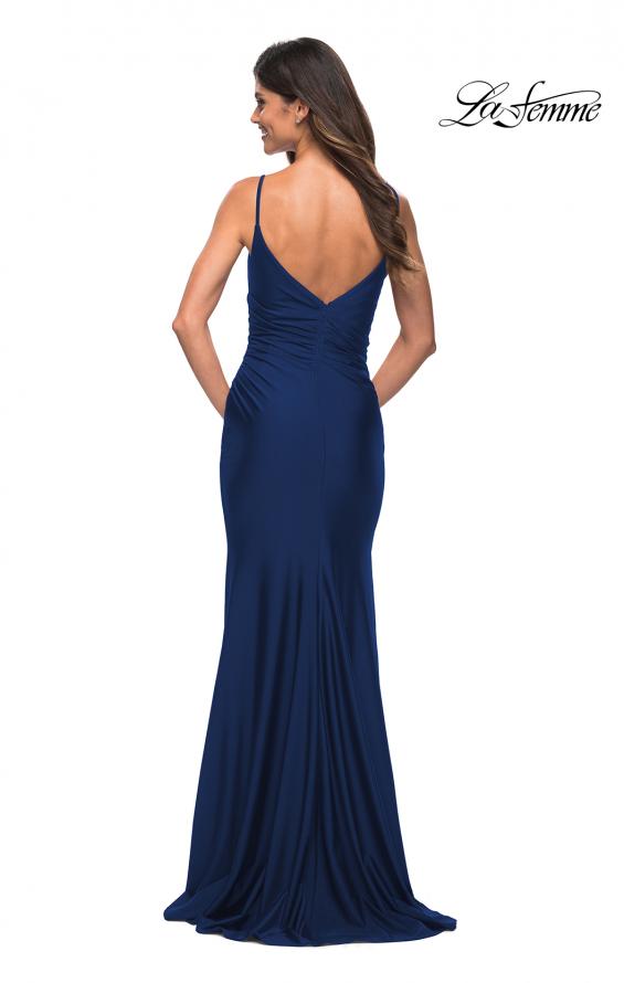 Get ready to show off your glamorous side in La Femme 30095 creation. The jersey gown showcases a sleeveless and Low V neckline supported by spaghetti straps that lead to the V open back and secured by a zipper closure. This gown highlights a diagonal ruching on the fitted bodice while the sheath skirt is designed with a high slit as it flows into a sweep train. Stand out among the fabulous crowd as all eyes focus on you in this glamorous La Femme evening gown. Models are wearing Dark Berry, Navy and Dark Emerald colors.
