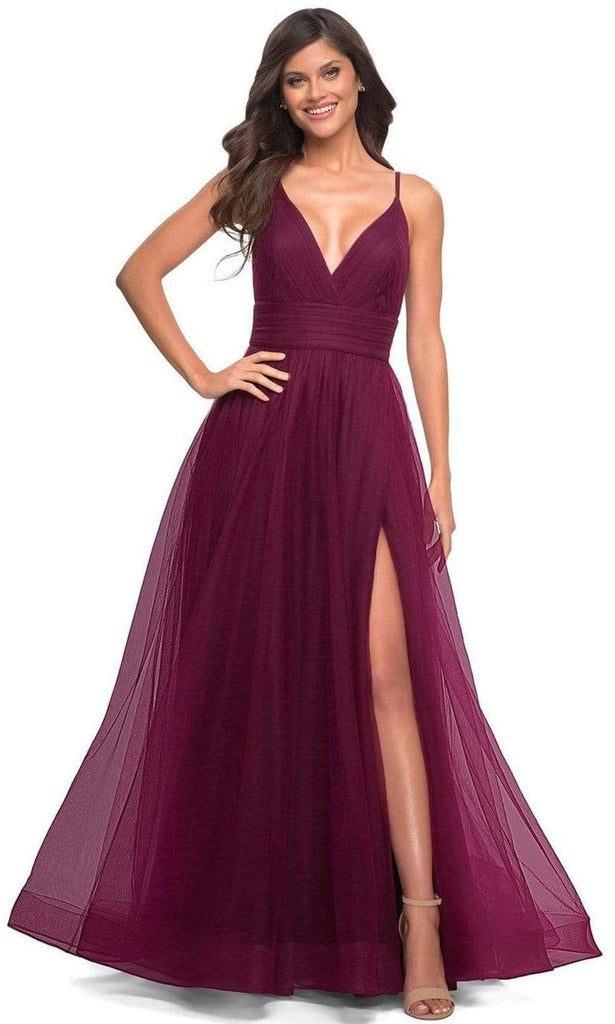 Enter that spectacular event in style in this La Femme 30180 creation. Ornamented with fine ruching on the bodice, this gown features spaghetti straps leading into a deep v-neckline with a v-open back. Nipped with a pleated waist, a high slit flows into an A-line silhouette and train. Convey a style that speaks of beauty in this La Femme masterpiece. Models are wearing the Dark Berry, Dark Emerald and Dusty Mauve colors.