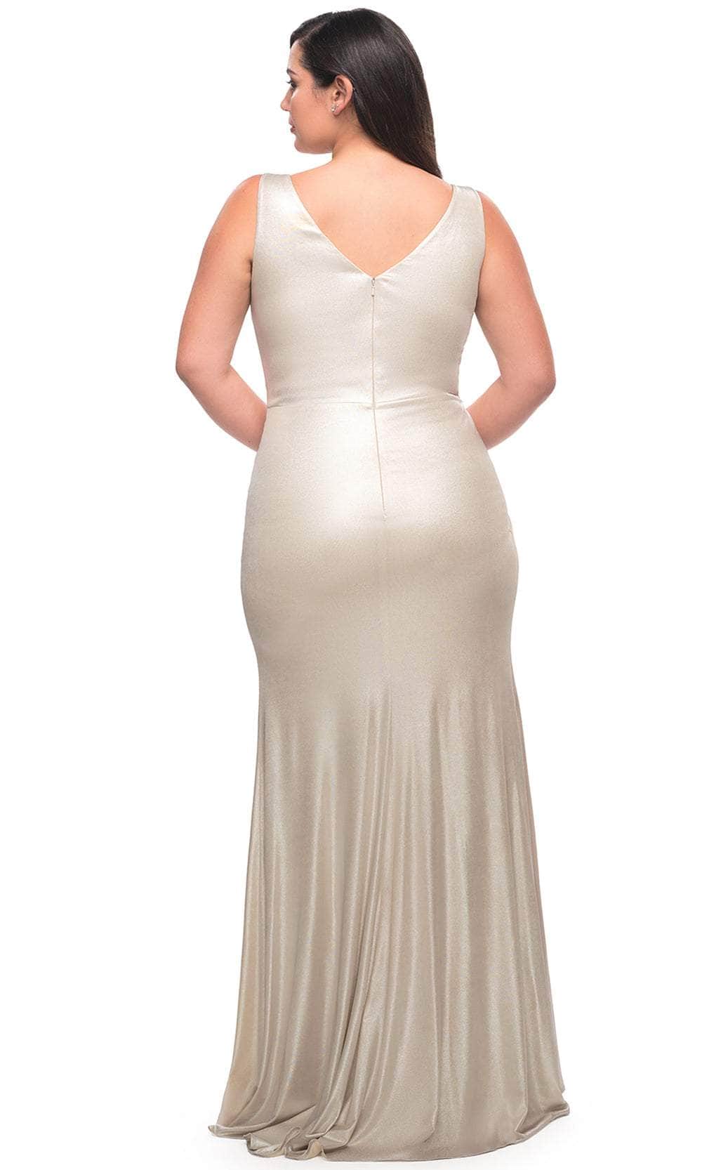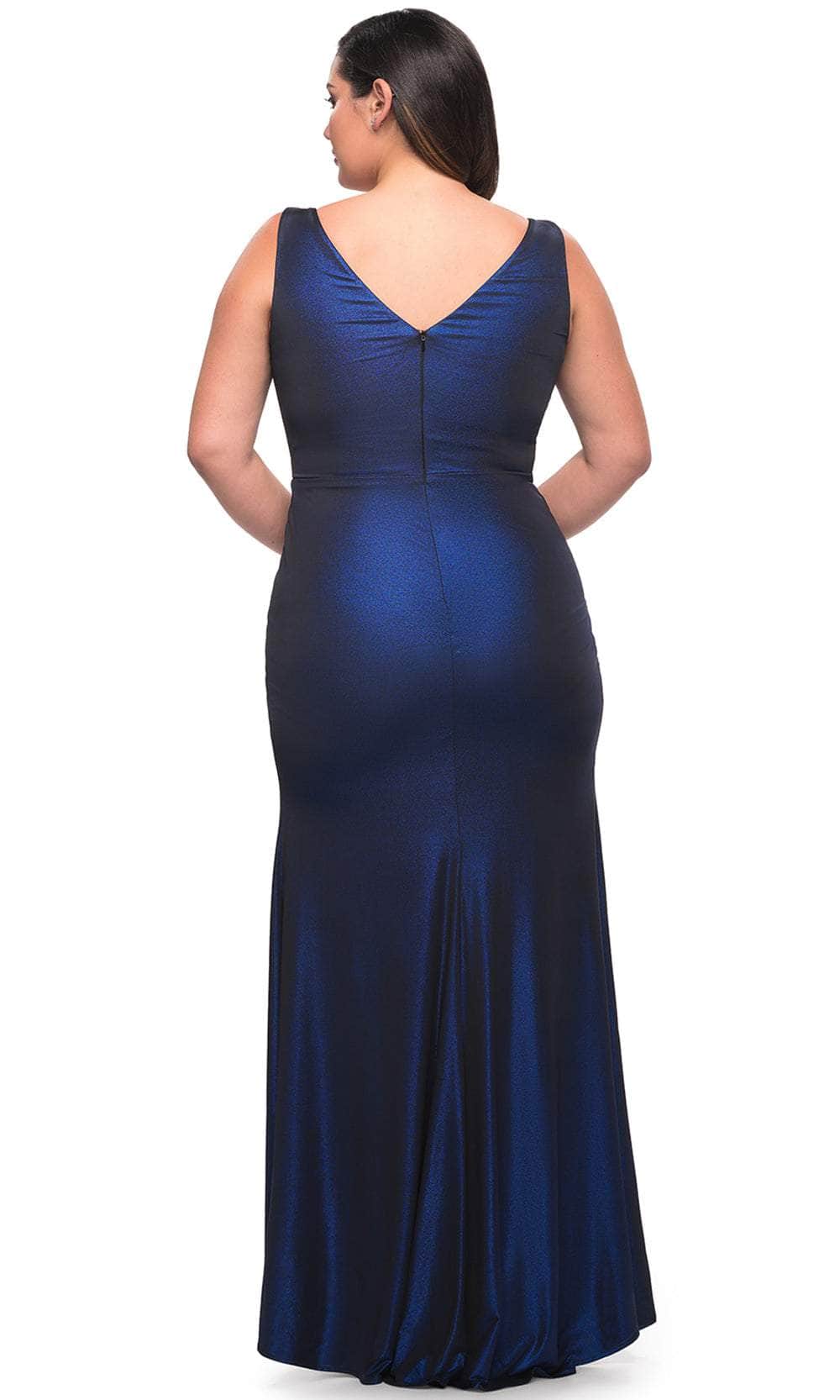 Get glamorous underneath the modern and classic detailing on the column silhouette of La Femme 30267 .This simple yet a perfect eye catching sleeveless dress lavishly encrusted on a shiny metallic jersey fabric with amazing ruched bodice and showcases a V neckline and a v shaped back. Perfectly secured with a back zipper closure. Make that event an unforgettable one as everyone will notice how beautiful you are. Be the spotlight wearing this extravagant La Femme. Models are wearing Navy and Silver color.