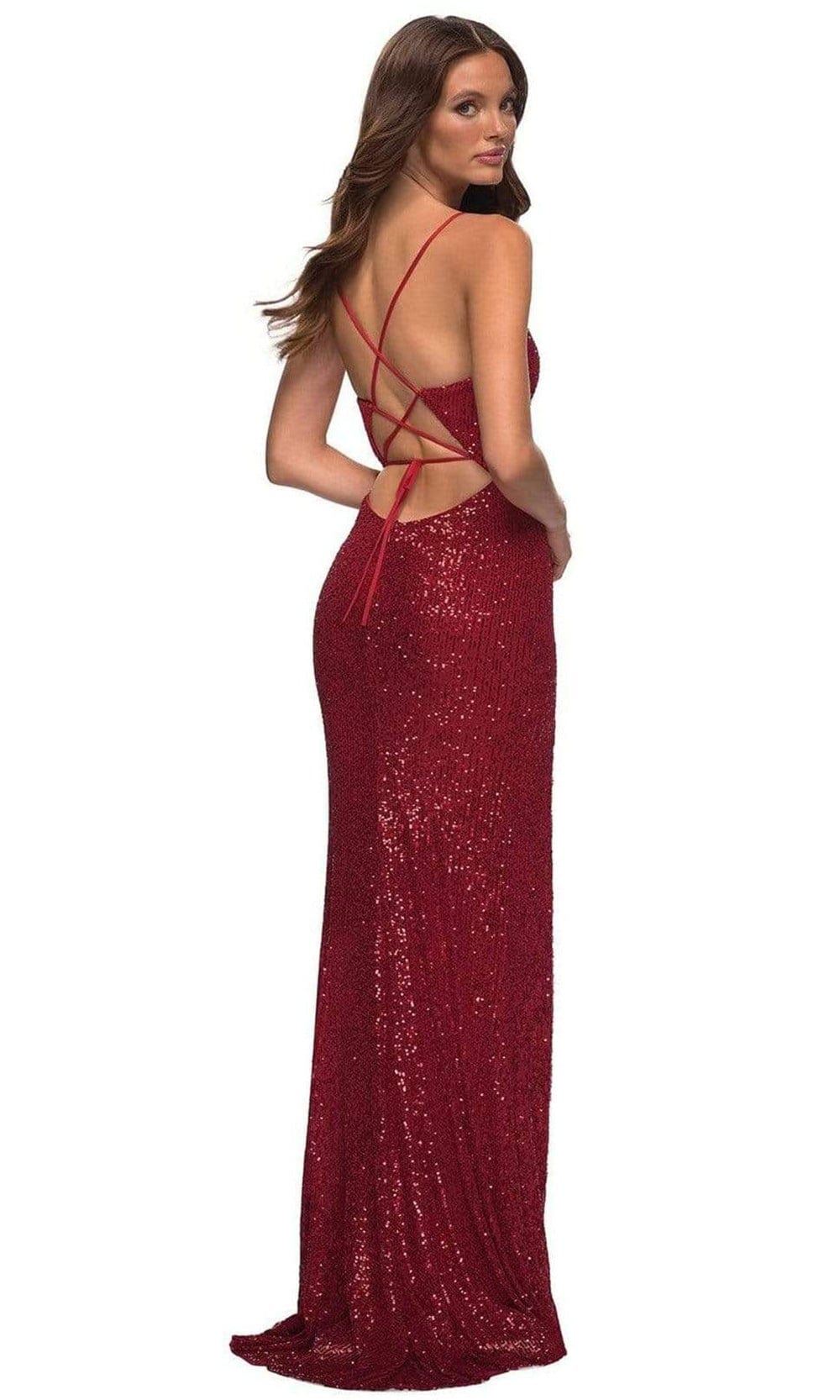 Fall in love with the exquisite style of this La Femme 30388 creation. This sequin ornate gown flourishes a spaghetti strap bodice with a plunging v-neckline. Stringed with a lace up accent, the high slit skirt spills into a sheath silhouette. Promote sterling sophistication in this La Femme masterpiece.