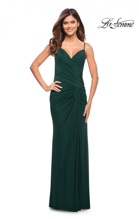 Be ready to fascinate everyone with La Femme 30393 creation. Made of net jersey fabric, this dress flaunts a curved hugging and directionally ruched bodice with a V neckline. The back is cinched with a bandeau lace-up design. The sheath skirt adds an alluring leg slit and dramatic sweep train finish. This La Femme dress is perfect for the girl who wants to look both sexy and sophisticated. Models are wearing Red Emerald and Navy colors.