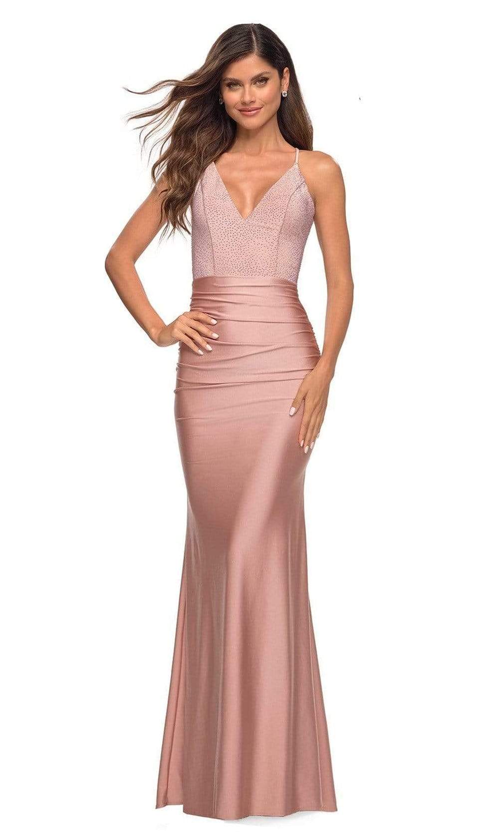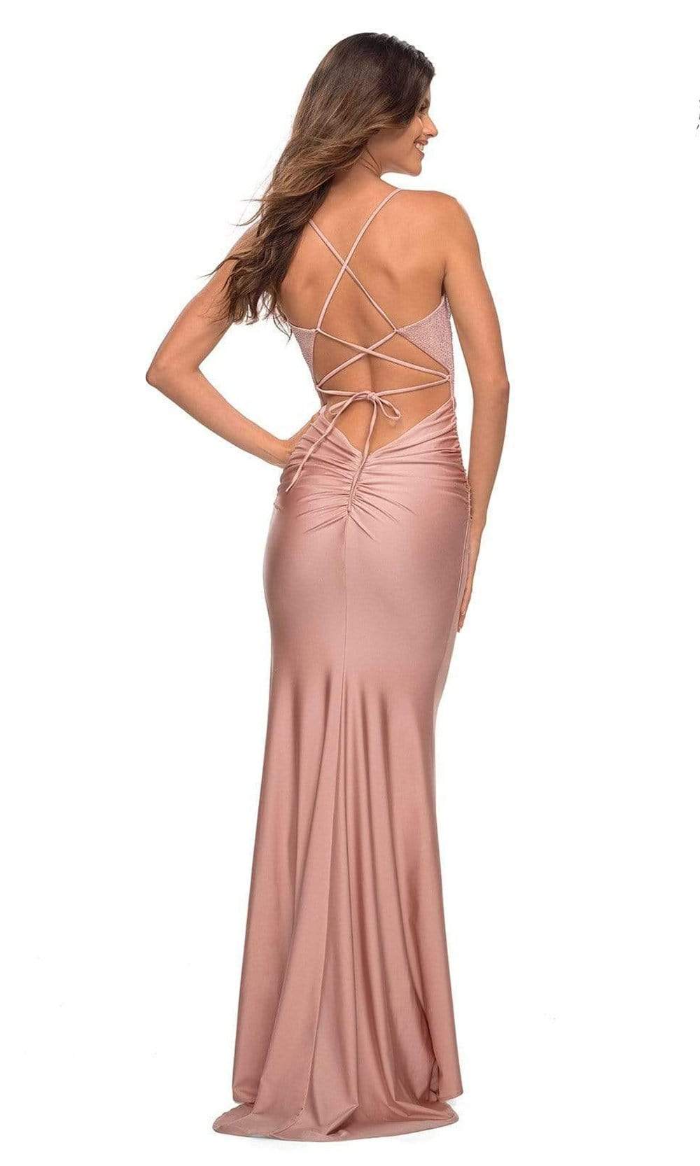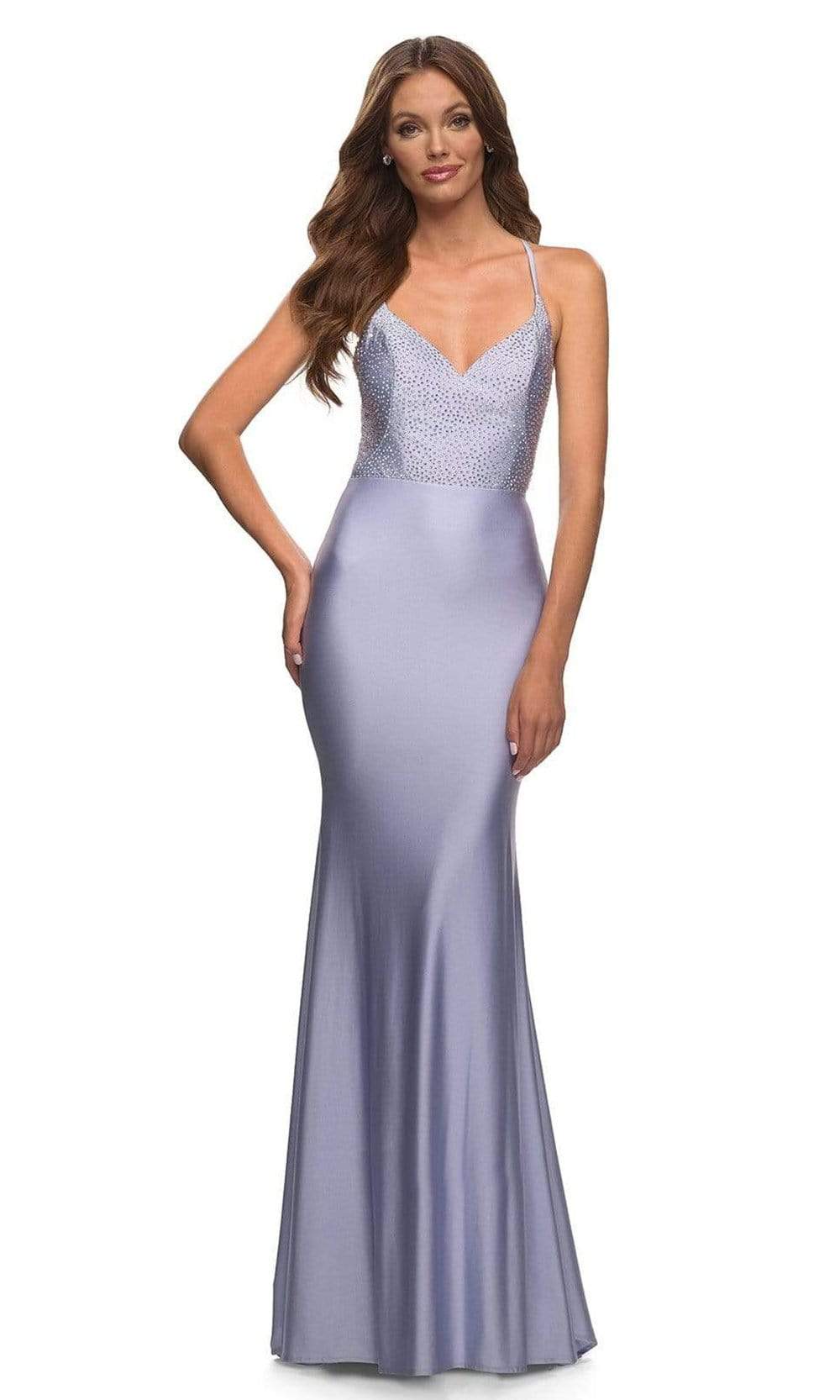 Debut in a stunning luminescence in this La Femme 30432 creation. Embellished with glimmering beads on a spaghetti strap bodice, this gown charms with a low v-neckline. Rendered with a lace up back, the sleek skirt pools into a train. Bask under the adoration of many in this La Femme masterpiece.