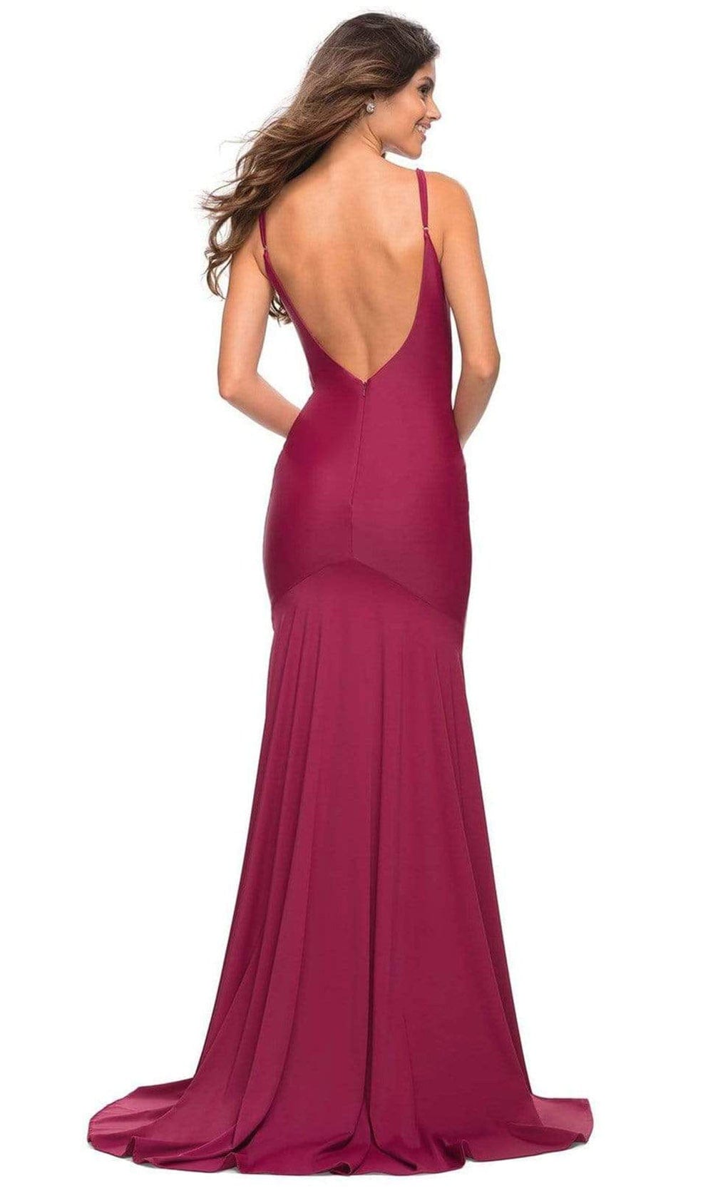 Capture the attention in this gorgeous La Femme 30458 creation. Sculpted in a luxe jersey silhouette, this gown has a scoop neckline with spaghetti straps. Rendered with a low v-open back, the mermaid skirt flares into a train. . Charm everyone with the impeccable style of this La Femme masterpiece. Models are wearing the Berry, Emerald, Navy and White colors. Find more Mermaid Prom Dresses.