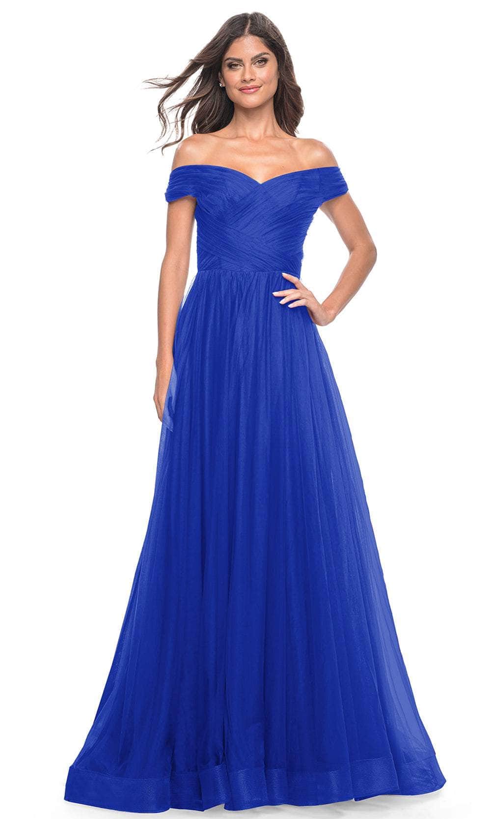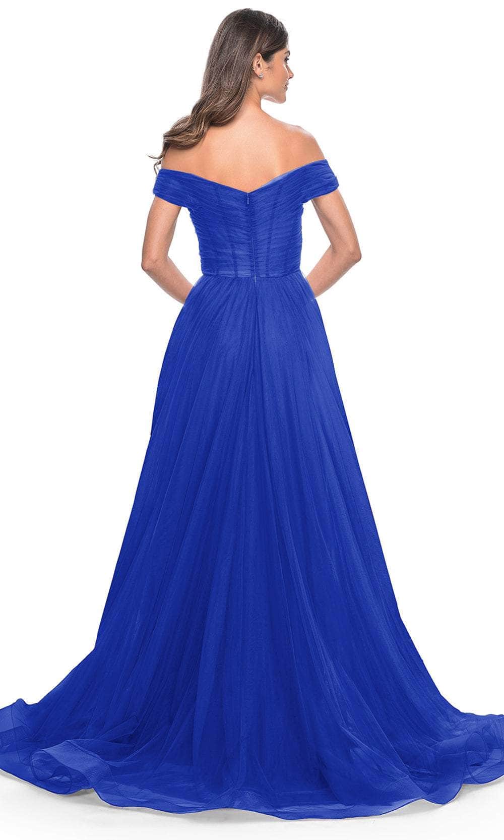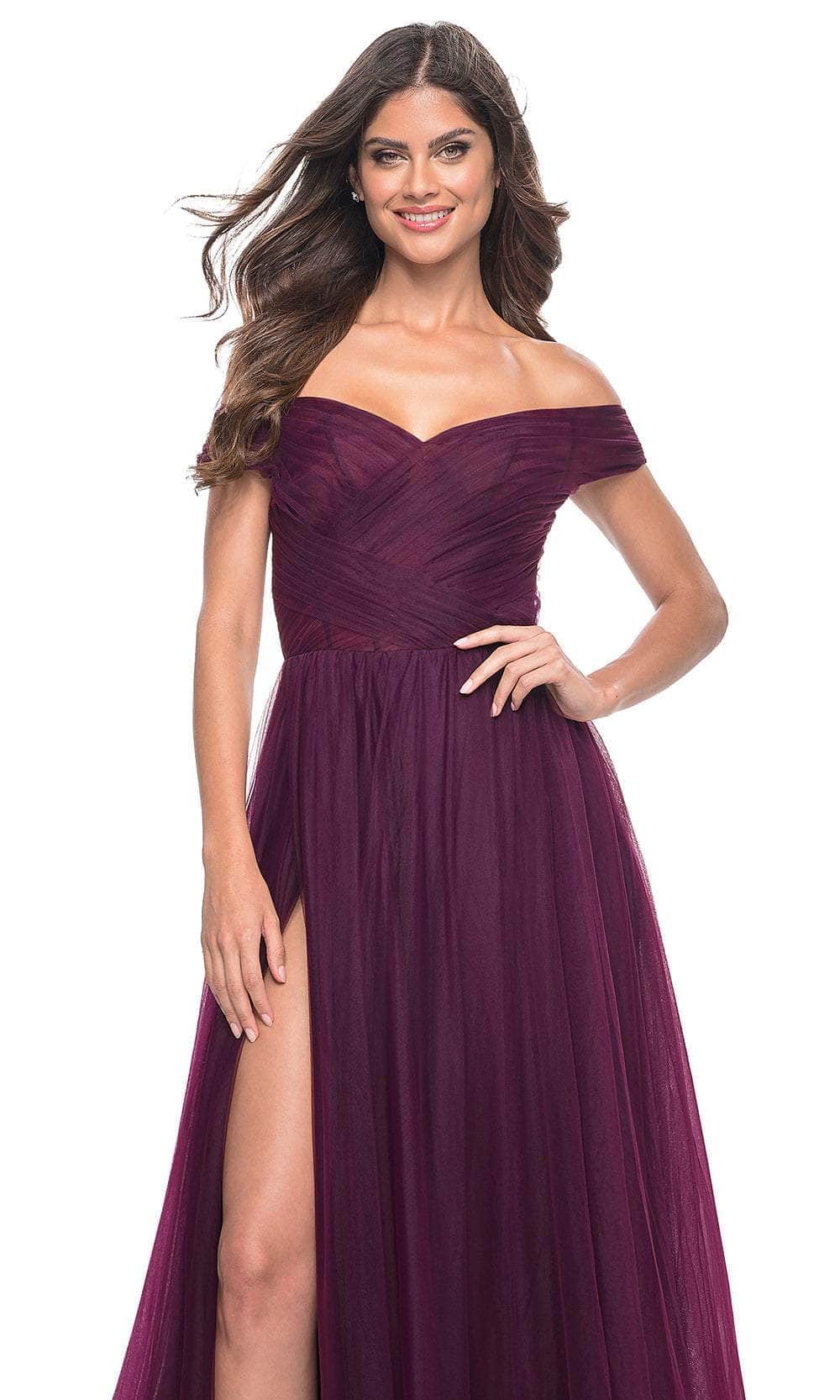 Make a captivating entrance in the La Femme 30498SC dress, designed to steal hearts. This ensemble features a romantic off-shoulder neckline and a beautifully woven crisscross bodice that highlights your figure. Draped off-shoulder cap sleeves add a touch of grace, while the midrise back with a concealed zipper ensures a seamless fit. The ruched tulle creates a mesmerizing effect, while the skirt is gathered at the waist before flowing into a stunning A-line silhouette. It ends in a high slit and a sweeping train for added drama. Shine effortlessly at any event in this ethereal La Femme 30498SC creation. Models are wearing the Black, Dark Berry, Dark Emerald, and Royal Blue colors.