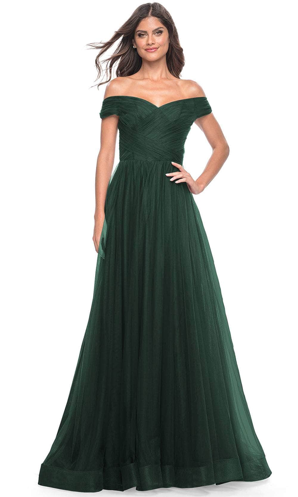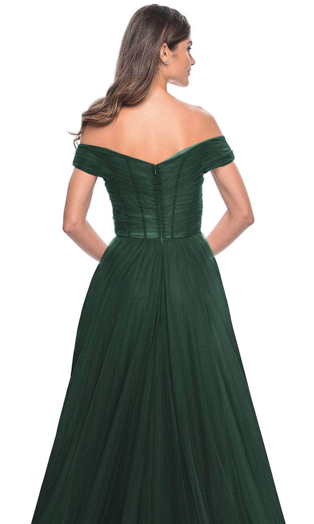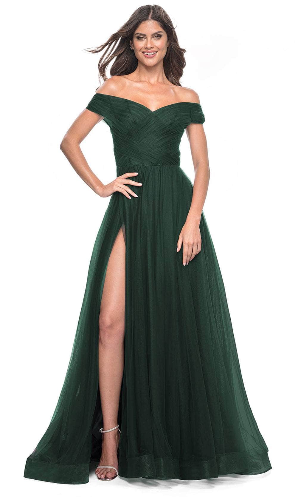 Make a captivating entrance in the La Femme 30498SC dress, designed to steal hearts. This ensemble features a romantic off-shoulder neckline and a beautifully woven crisscross bodice that highlights your figure. Draped off-shoulder cap sleeves add a touch of grace, while the midrise back with a concealed zipper ensures a seamless fit. The ruched tulle creates a mesmerizing effect, while the skirt is gathered at the waist before flowing into a stunning A-line silhouette. It ends in a high slit and a sweeping train for added drama. Shine effortlessly at any event in this ethereal La Femme 30498SC creation. Models are wearing the Black, Dark Berry, Dark Emerald, and Royal Blue colors.