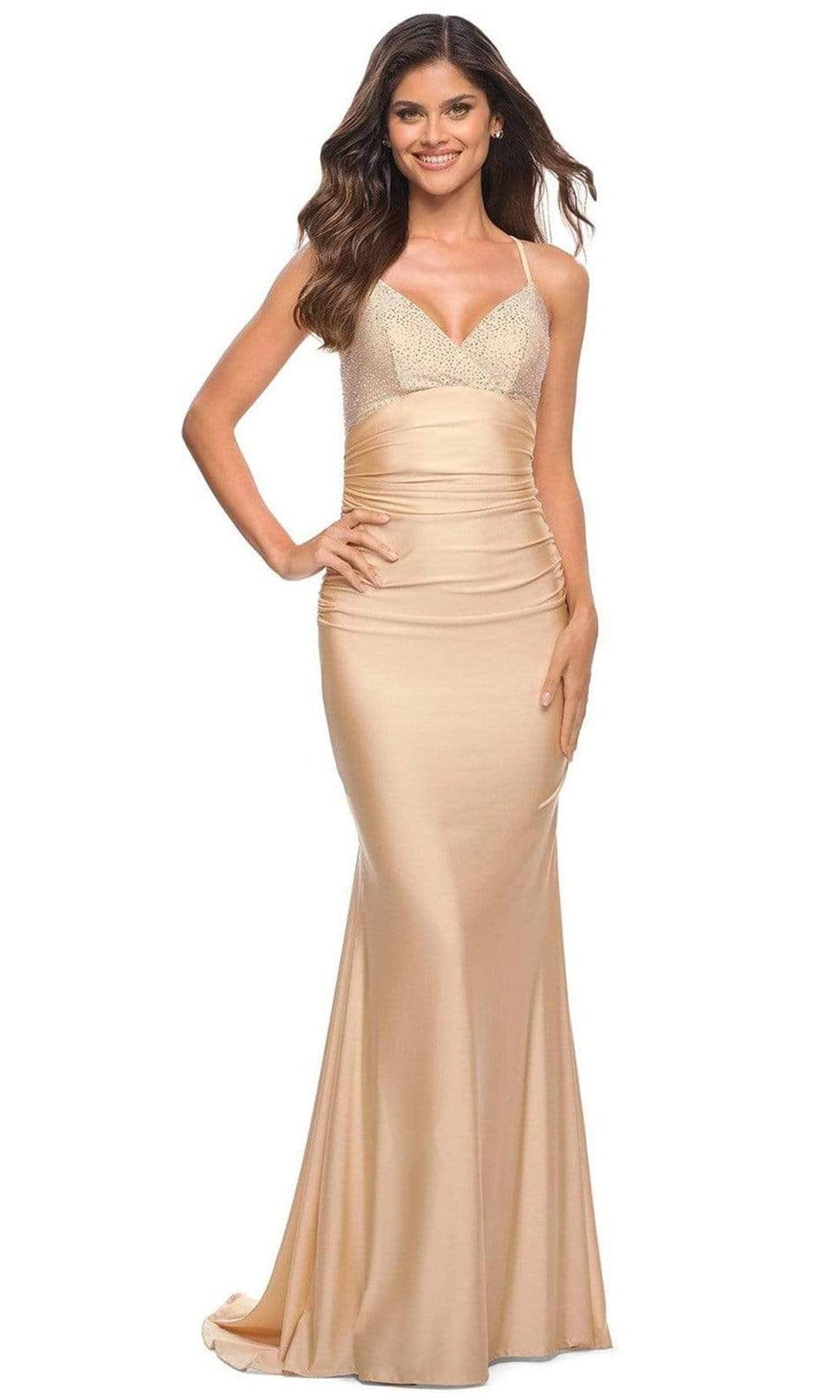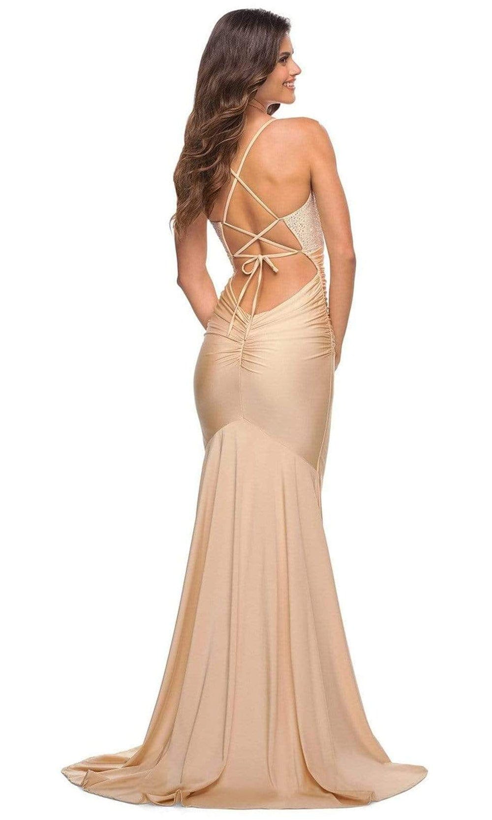Create a perfect evening wearing this elegant La Femme 30503 creation. This fitted ensemble made from soft jersey features a ruched bodice framed with sleeveless and Low V neckline. The top is dotted with tiny rhinestones, while the back is cinched with a lace up design. The skirt parades a trumpet silhouette which gracefully flares to the floor, completed with a sweep train. Fall in love when you slip on this La Femme gown.