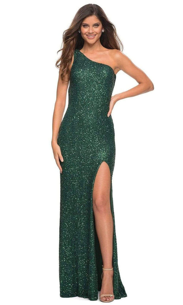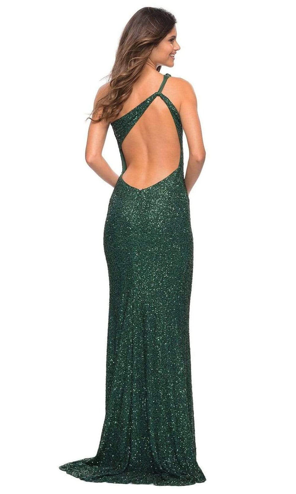 Shine through the night in this mesmerizing La Femme 30562 creation. Sculpted with a fitted bodice, this sleeveless gown shows an asymmetrical neckline complemented with an open back with a looped top strap and cutout detail. The entire gown is designed in sequins which provide the shimmering effect. A thigh-high slit accents this sheath silhouette and finished off with a sweep train. This La Femme masterpiece will make sure you turn heads all night long. Model is wearing Emerald color.