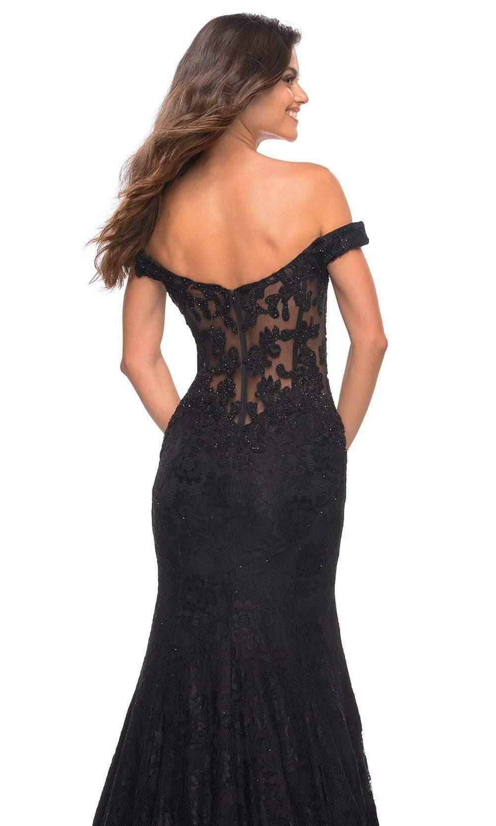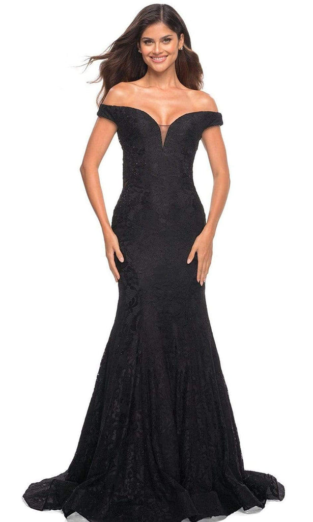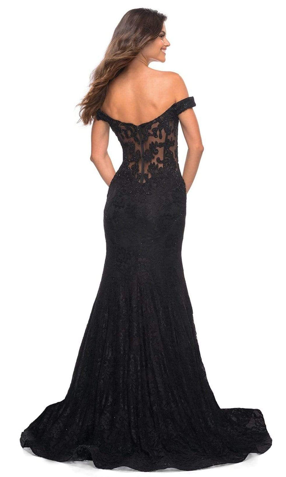 Envision the ideal evening in this evocative formal gown by La Femme 30564. An off shoulder and V neckline frame the fitted bodice is designed in embroidery and beads accent. The back highlights a sheer bodice with a scoop open cut and has a zipper closure. The skirt has a mermaid silhouette and finishes in a sweep train. Fall in love when you slip on this La Femme creation. Model is wearing Black color.