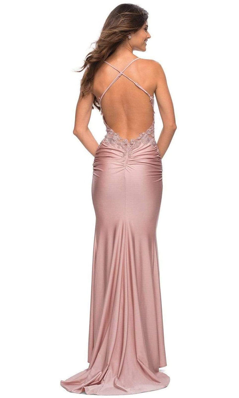 Envision the ideal evening in this evocative evening gown by La Femme 30596. Featuring a sultry open back, the bodice is trimmed with alluring lace and thin straps. The sheath silhouette is accented with ruching at the waist, adding curvaceous feel. Flatter your shape with a sculpted gown from La Femme. Model is wearing Mauve color.