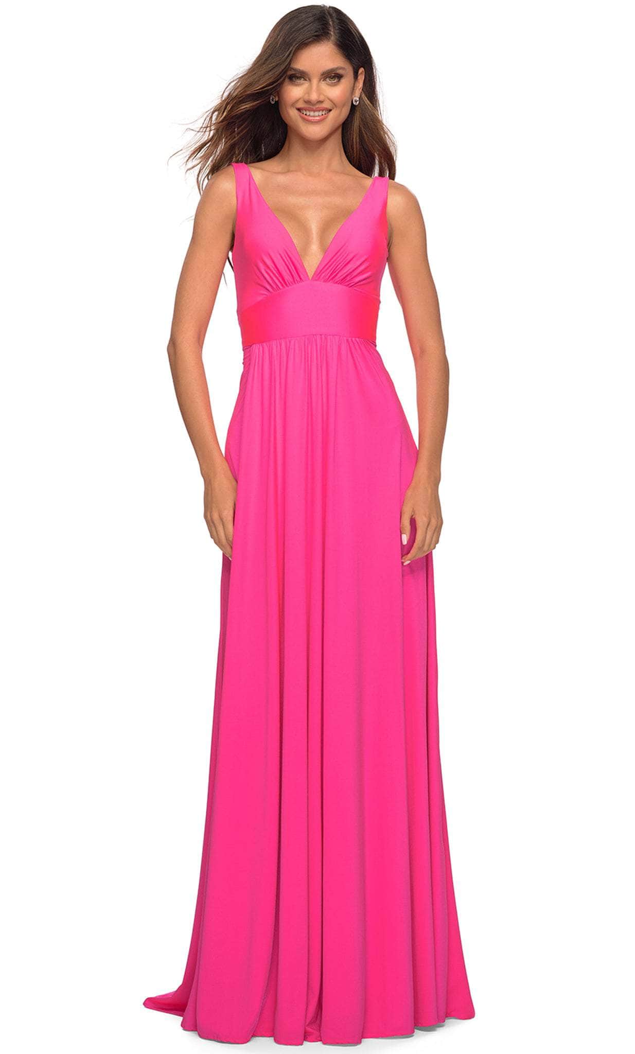 Capture the glamour as you walk on this stunning gorgeous La Femme 30669 creation. This simple yet remarkable gown is fashioned in jersey fabric and has ruched detailing. It shows off a sleeveless bodice crowned by a matching deep v-neckline and v-open back, with a wide band to emphasize your waist. The A-line skirt splits at the side to flaunt the toned legs before flaring down to the full length hem and sweeping train. This La Femme 30669 gown will sure to display your natural beauty and grace. Model is wearing the Neon Pink color.
