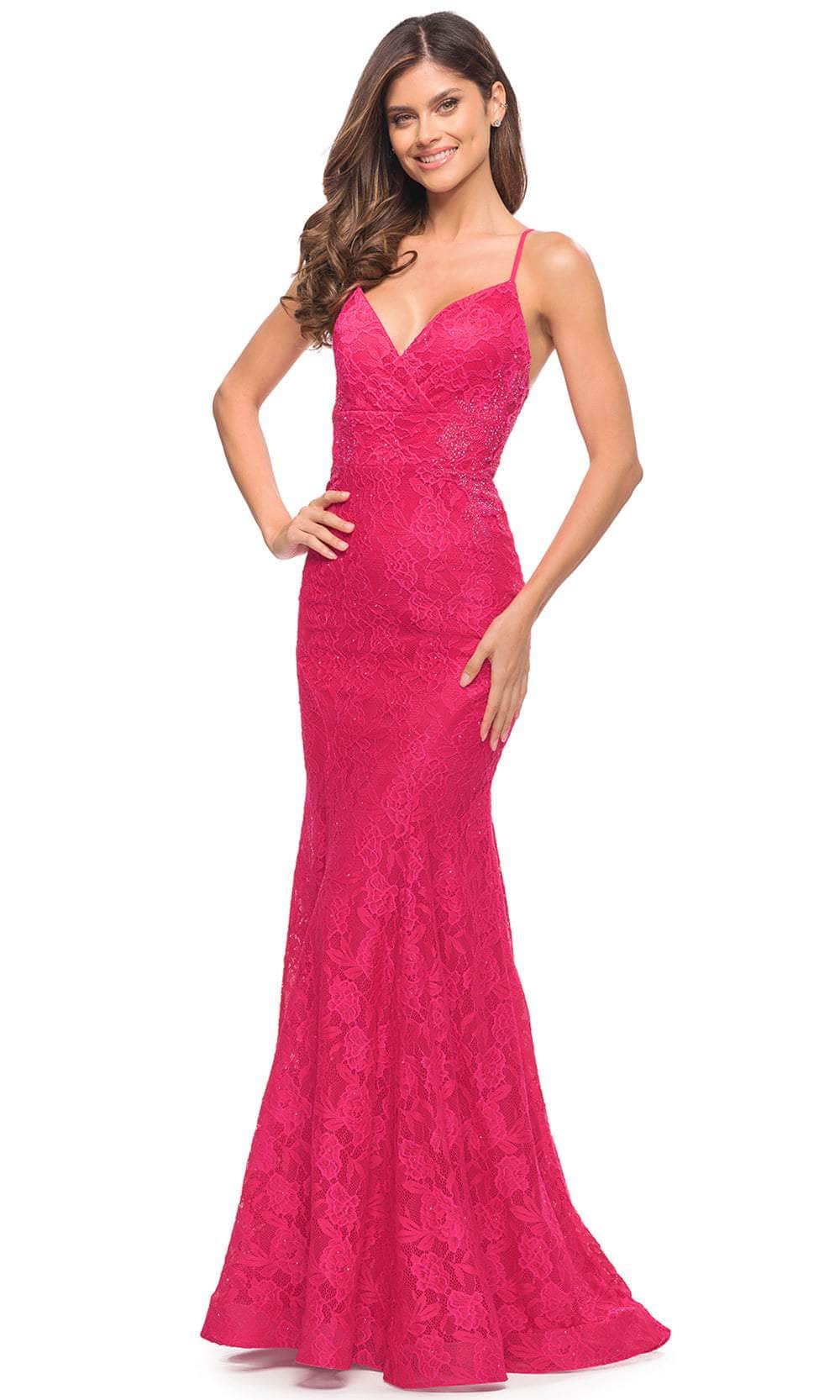 Bloom with loveliness in this floral dress from La Femme 30690. This appeals with sleeveless bodice that showcases a v neckline and is beautified by the floral embroidery. This dress is perfect in a semi-formal event as it parades a mermaid silhouette, added to be more alluring is the empire waistline that is designed with flattering seams across waist and skirt. Radiate a fresh style as you orchestrate a dramatic entrance in this radiant La Femme. Model is wearing hot pink color.
