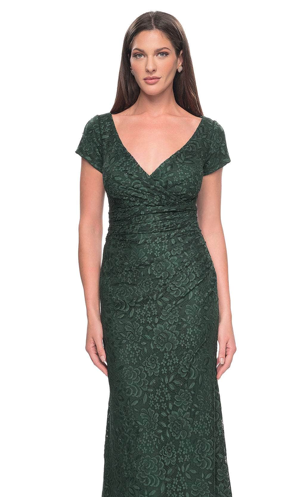 Make a striking impression with the La Femme 30797 creation. Designed with precision to highlight the feminine silhouette, the gown features a fitted stretch beaded lace on a figure-flattering form. Subtle ruching and intricate rhinestone details add a touch of elegance, while the evening gown incorporates flattering side ruching, accompanied by a v-neckline and short sleeves. The back reveals a complete design with a concealed zipper closure, and the sheath skirt elegantly cascades into a floor-length hemline. Indulge in the refined sophistication of this La Femme 30797 masterpiece and captivate with your sophisticated allure. Model is wearing the Emerald color.
