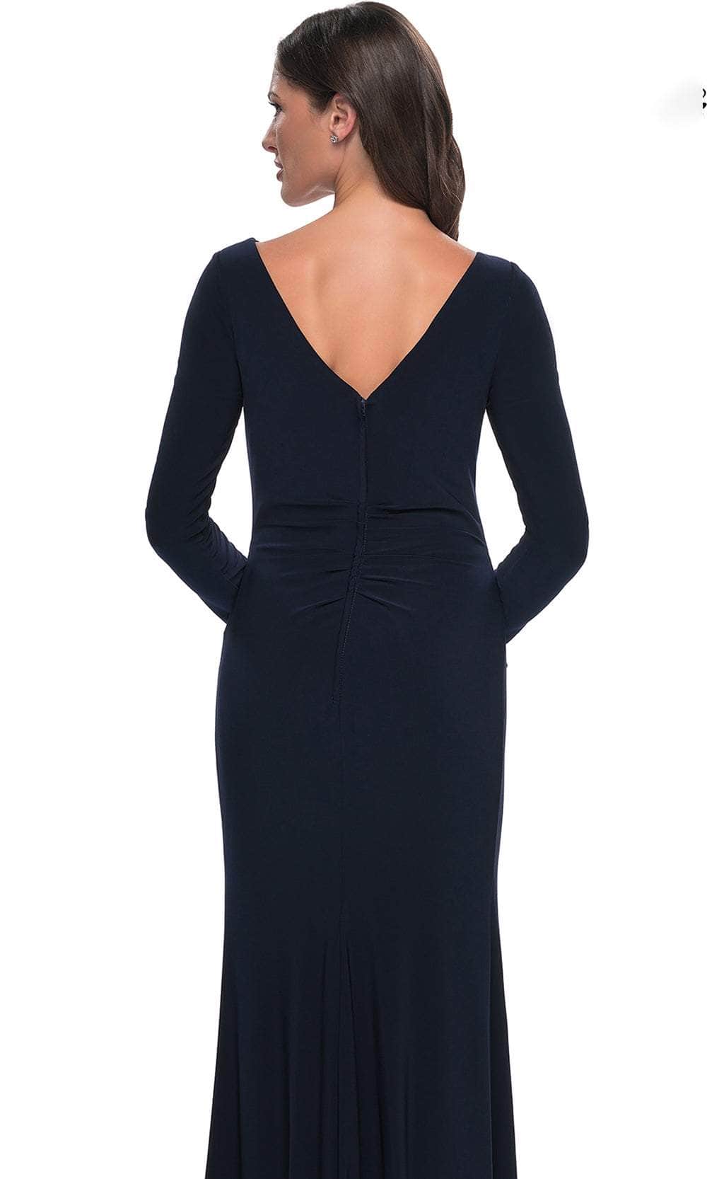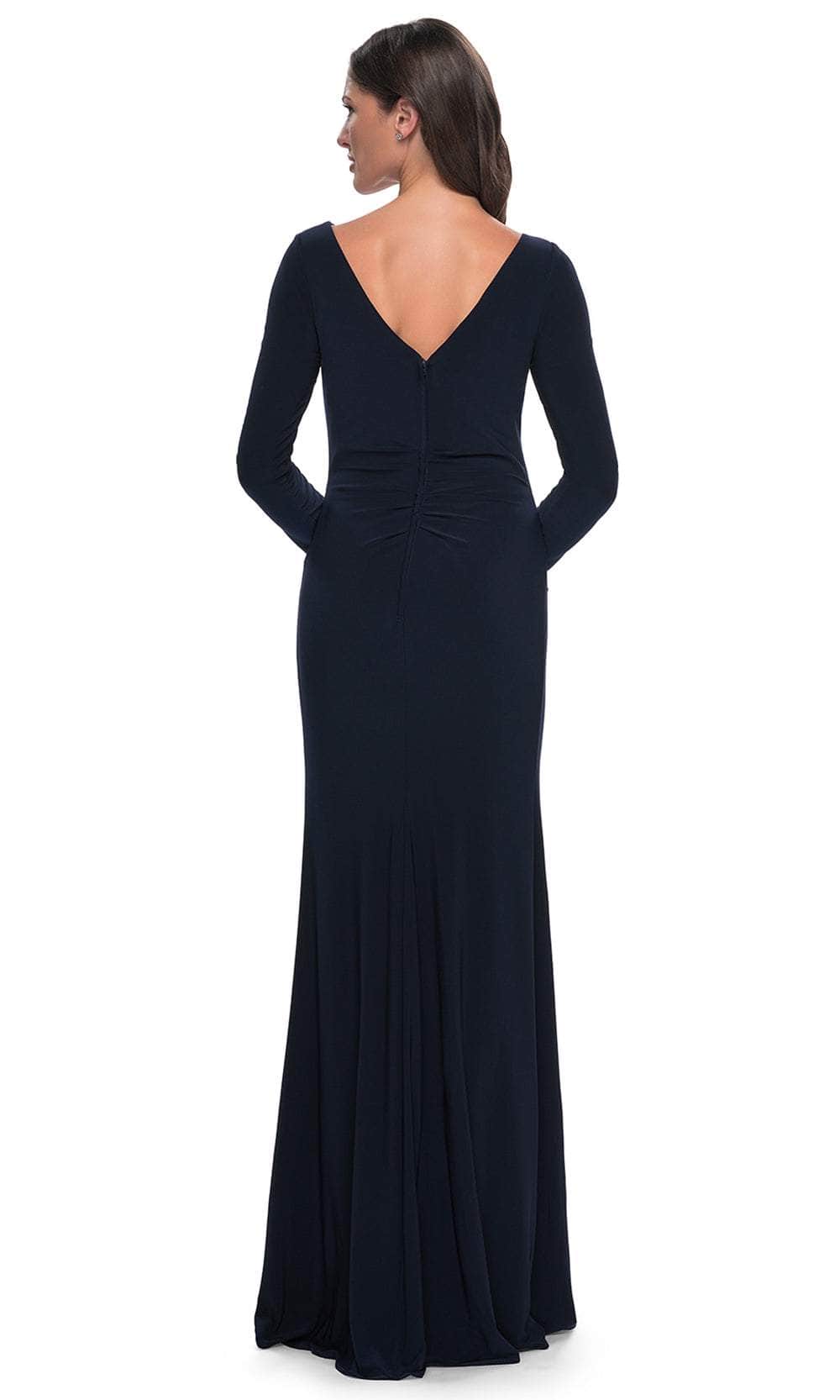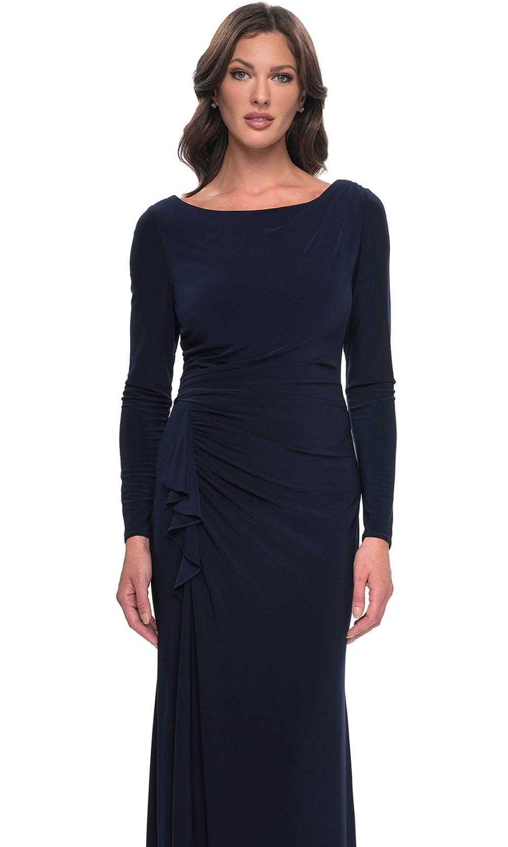 Exude timeless elegance in the La Femme 30881 gown, a creation that captivates with its refined simplicity. Tailoring details gracefully highlight the feminine form, shaping a bateau neckline adorned with long sleeves for a classic touch. Ruching textures the ensemble, adding depth and visual interest. The full back, complete with a concealed zipper closure, ensures a seamless and polished appearance. The sheath skirt gracefully falls to a floor-length hem, featuring a subtle yet sophisticated ruffle side accent. Dazzle everyone with this La Femme 30881 creation that embraces understated beauty and chic design. Model is wearing the Navy color.