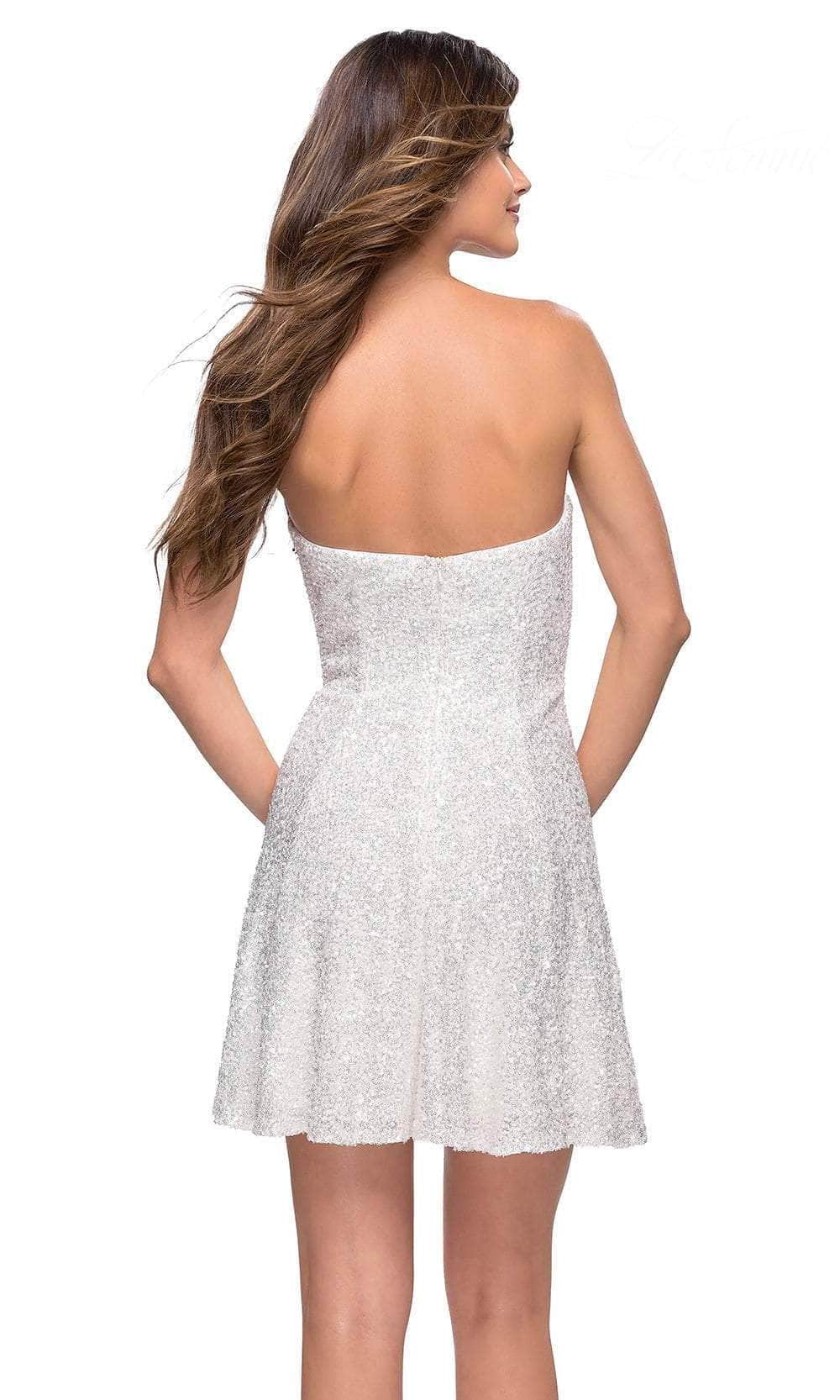 You will truly shine in this tantalizingly elegant La Femme 30957 creation. Festooned with a cascade of iridescent sequins allover its length, this piece features a sweetheart neckline on a strapless bodice with a midrise styled back and an invisible zipper closure. Flowing in waves, the skirt softly flares into a mini hemline that shows off those lovely legs. Be tailored to perfection in this iridescent La Femme masterpiece. Models are wearing the Emerald, Royal Blue and White colors.