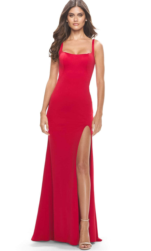Dress yourself in elegance from top to toe with this fascinatingly beautiful La Femme 31071SC creation. Sculpted with tailoring lines on a luxe jersey silhouette, this stunner parades a square neckline hanging from tank straps. Detailed a deep v-open styled back and a sexy high slit, the sheath skirt spills to the floor with a trailing train. Claim that look of sophistication wearing this classy and gorgeous La Femme masterpiece. Models are wearing the Black, Emerald, Red and Royal Blue colors.