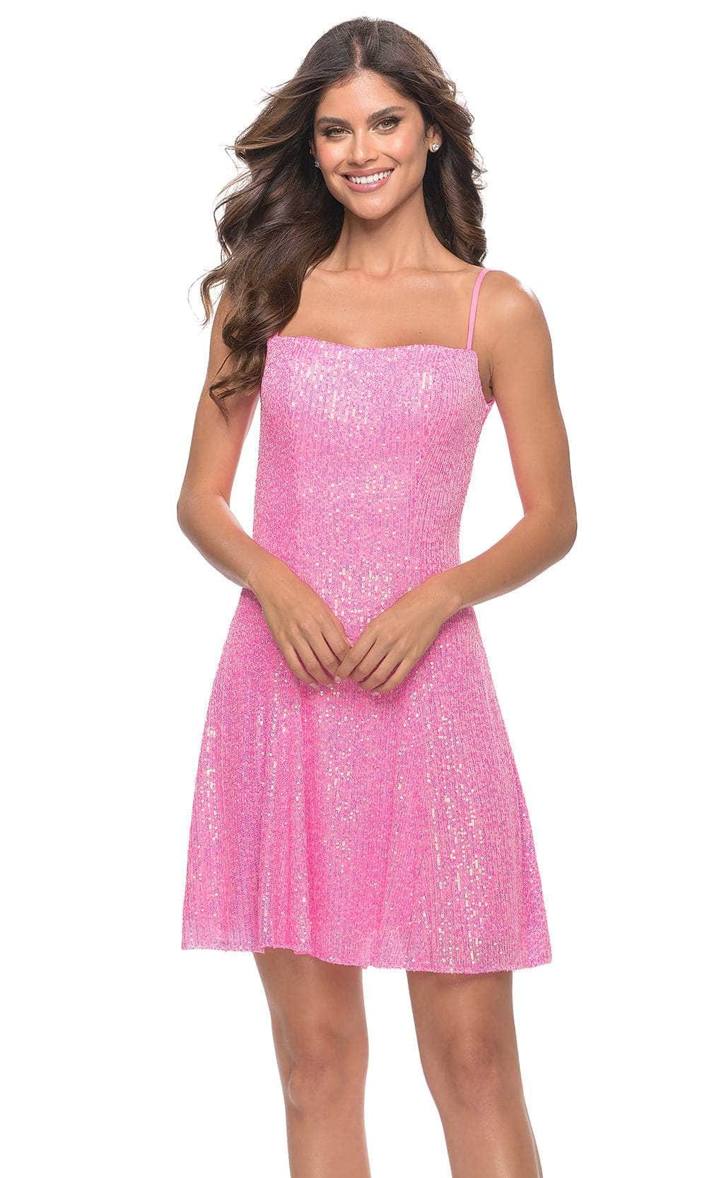In this sassy and chic dress by La Femme 31077, dance and enjoy your next party. Ornamented with sequins from top to bottom, this dress captures every glimmer of light and guarantees you will stand out from the crowd. It boasts spaghetti straps and a straight across neckline, perfectly emphasizing your decolletage. A seductive scoop back reveals a hint of skin, prettily secured by the concealed zipper closure. The skirt flares gently in an A-line silhouette and flows effortlessly to the short hemline. Leave them spellbound in this La Femme 31077 masterpiece. Models are wearing Light Periwinkle, Neon Pink, and Orange colors.