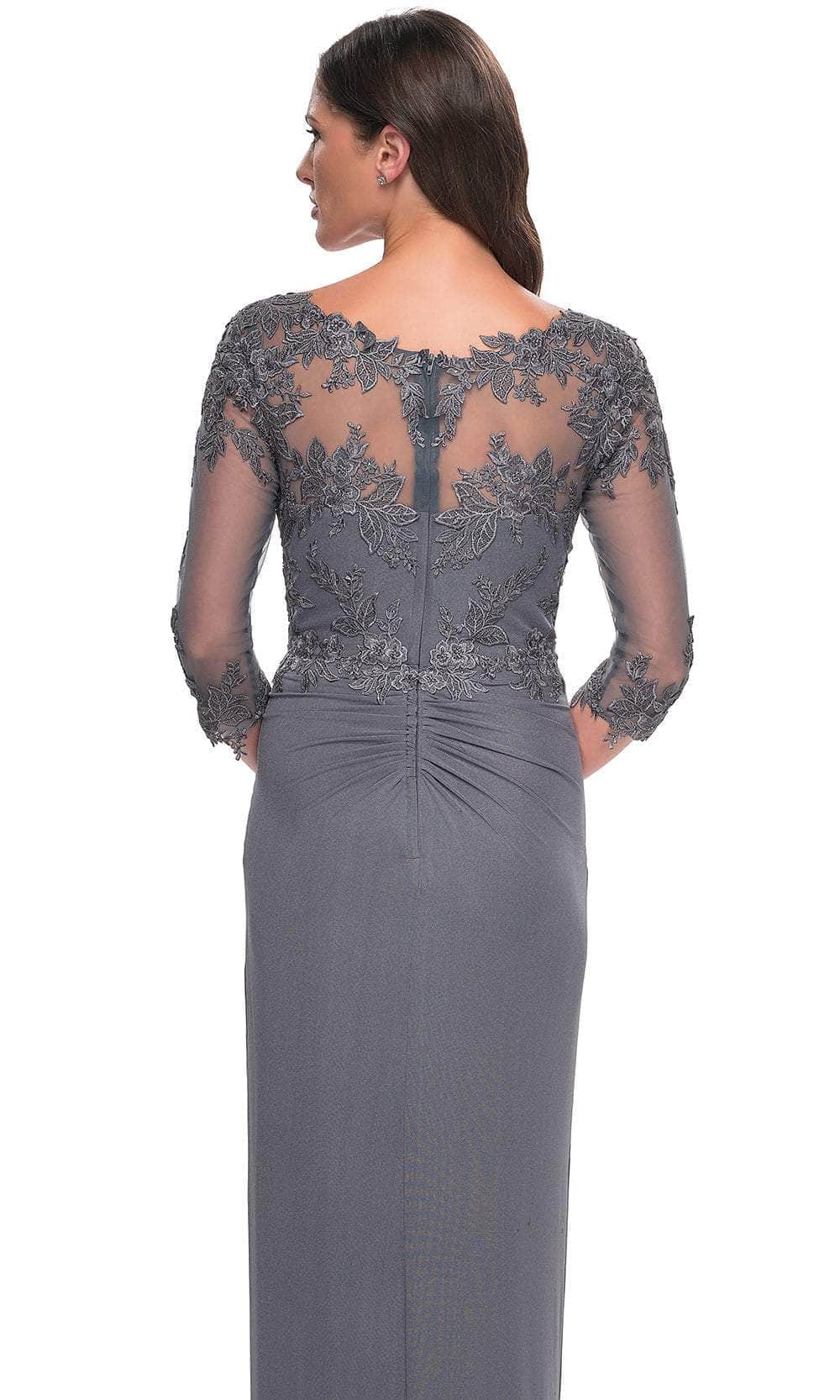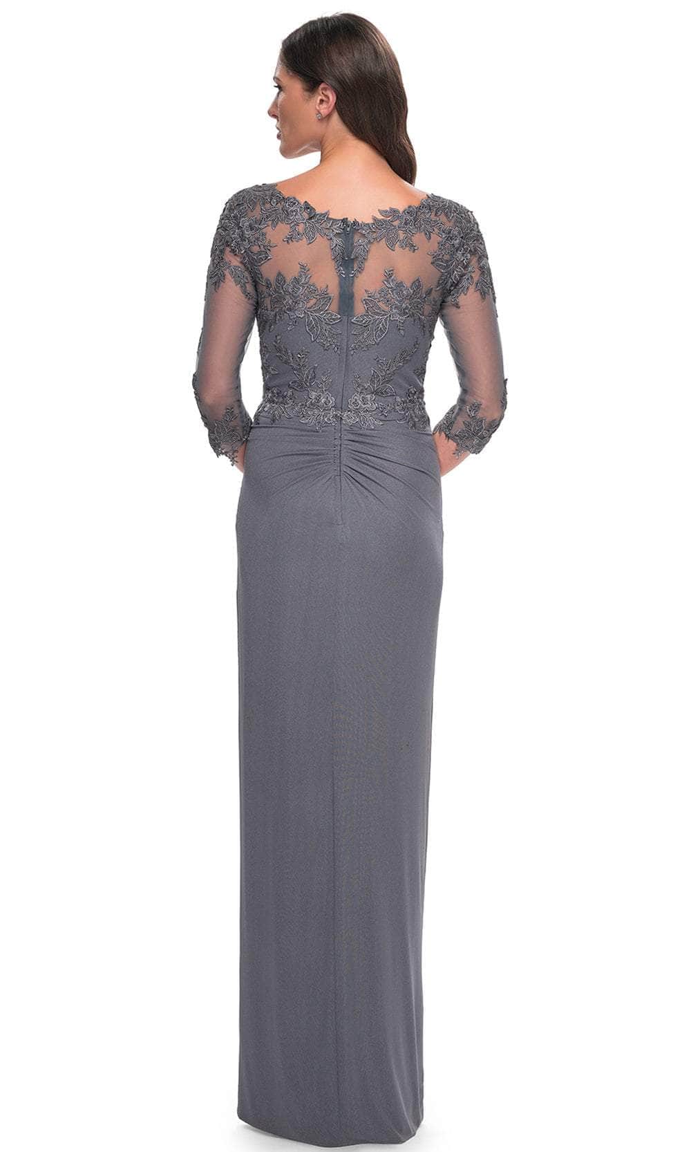 Radiate effortless grace in the La Femme 31093 gown, an enchanting sheath dress featuring floral lace appliques and delicate rhinestone accents. The illusion bateau neckline and sheer quarter sleeves add a touch of elegance, while the tulip hem provides a unique silhouette. Walk with confidence in this exquisite La Femme 31093 creation.