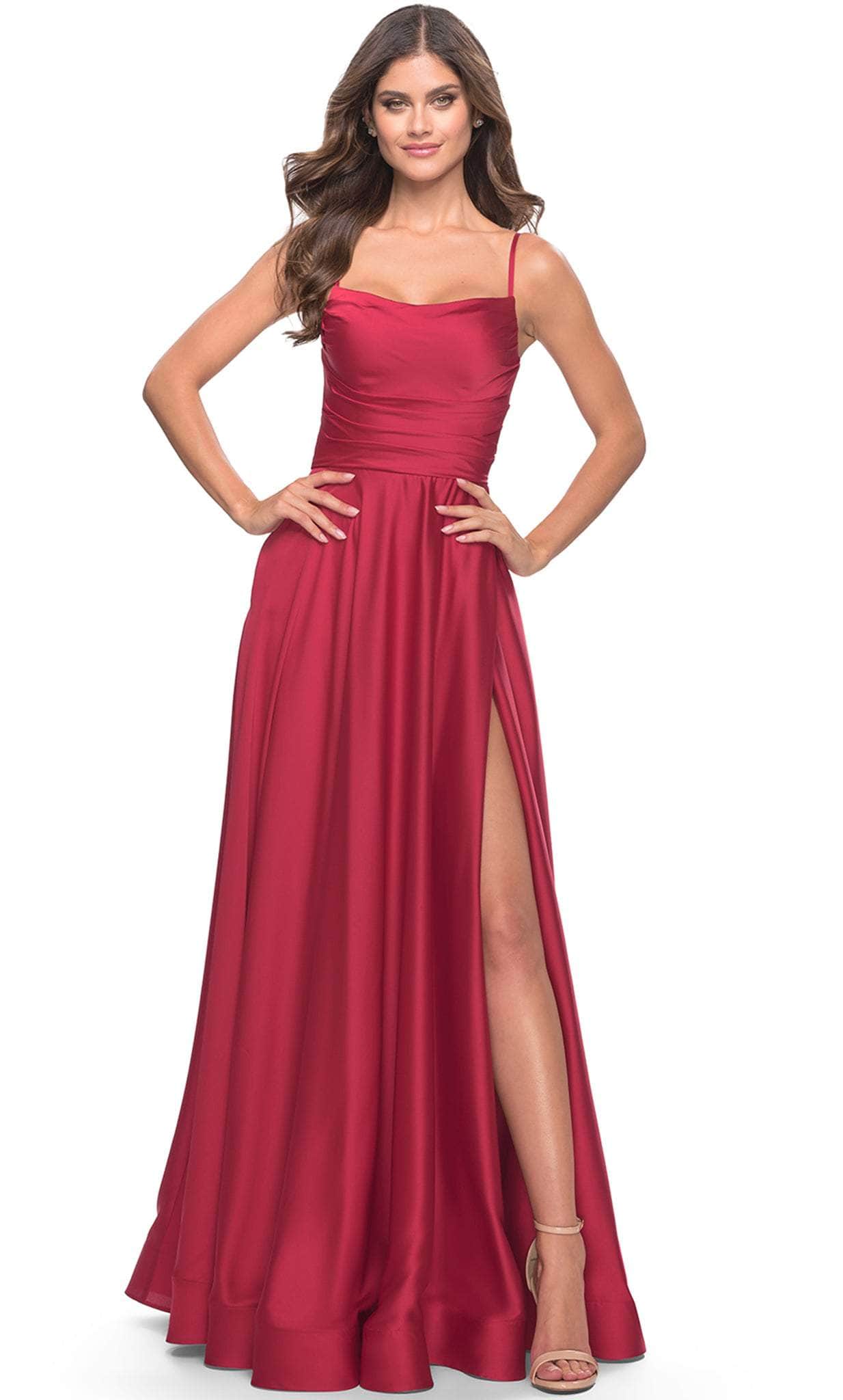 Enter the party and do that walk of a regal beauty in La Femme 31105. The notable feature of this fashionable satin dress is its square neckline and ruched fitted bodice, which is supported by the double thin straps that cross to the open lace up back. This A-Line silhouette dress has full length hemline with high side slit. The back has zipper closure to secure the fit. This La Femme 31105 is the perfect prom dress for the girl who wants to stand out from the crowd while looking glamorous. Models are wearing the Emerald, Navy, and Red colors.