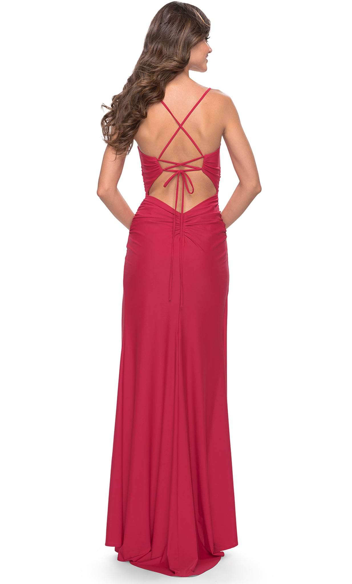 Go for a timeless and sophisticated look wearing this prominent creation by La Femme 31127. This sleeveless gown has beautiful ruching to highlight your natural curves. It offers a deep v-neckline, spaghetti straps and an open back secured with a lace-up tie. With a jaw dropping high leg slit, the skirt flows into a full length sheath silhouette. This La Femme 31127 gown is specially designed to make that special occasion worth reminiscing. Model is wearing the Red color.