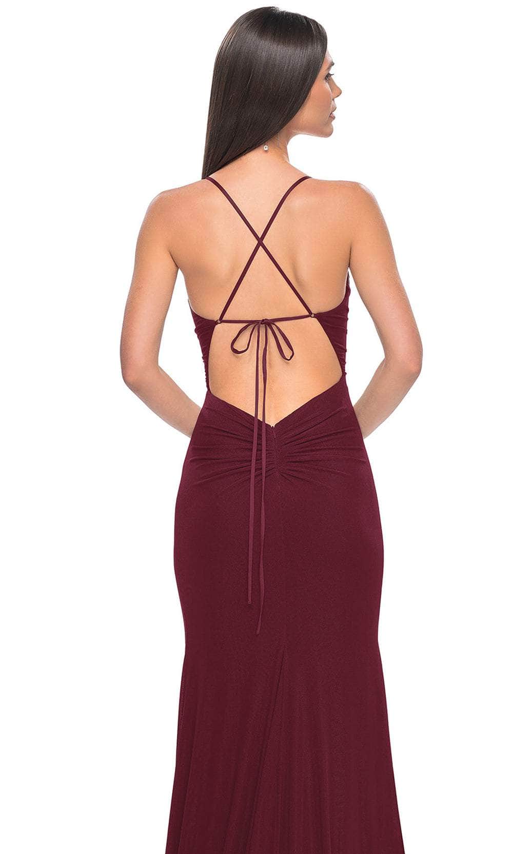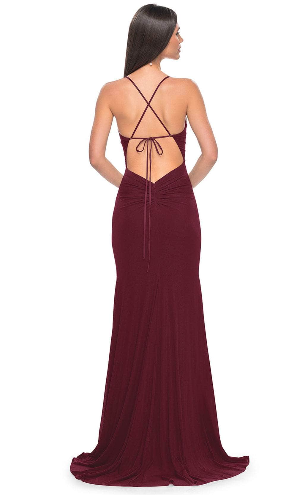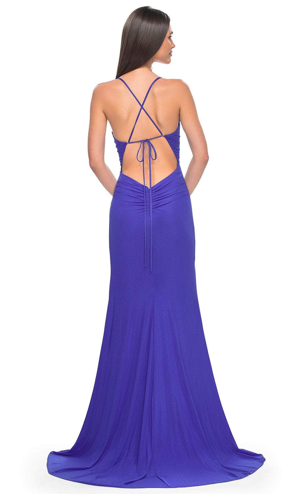 Glide into the ballroom like an ethereal vision wearing this La Femme 31151 creation. The gown's bodice boasts delicate spaghetti straps and a sheer fabric adorned with elegant, ruched details. Corset boning provides structure, while a draped V-neckline adds sophistication to the design. A gown featuring a plunging open back, intricately stringed into a crisscross design with delicate thin straps, offering a stunning and alluring silhouette from behind. The gown features a defined natural waist, flowing into an elegant A-line silhouette. It boasts a daring high slit, while a sweeping train completes its captivating silhouette. Don a style that will make everyone swoon in this La Femme 31151 masterpiece. Models are wearing the Black, Dark Berry, Dark Emerald, and Royal Blue colors.