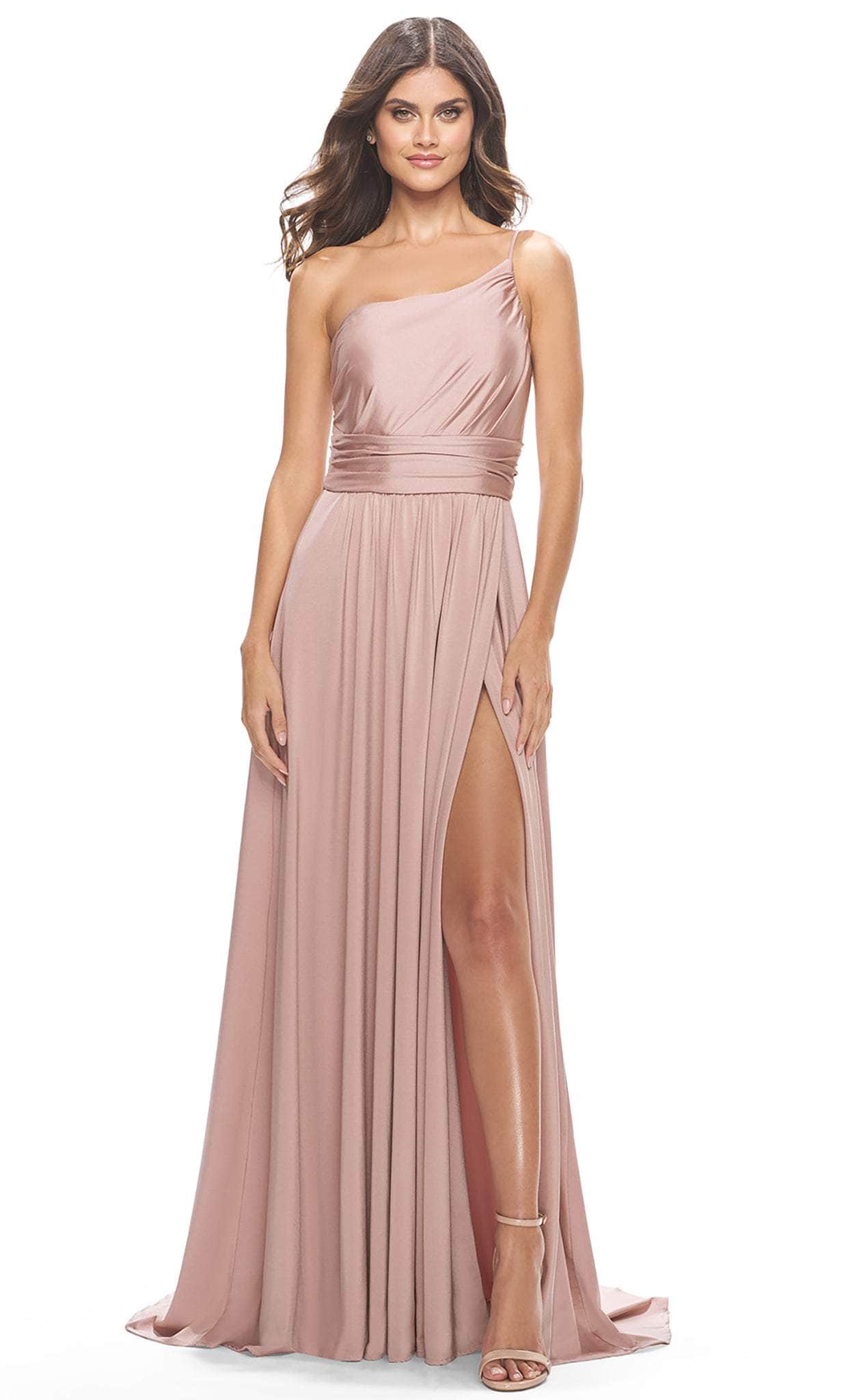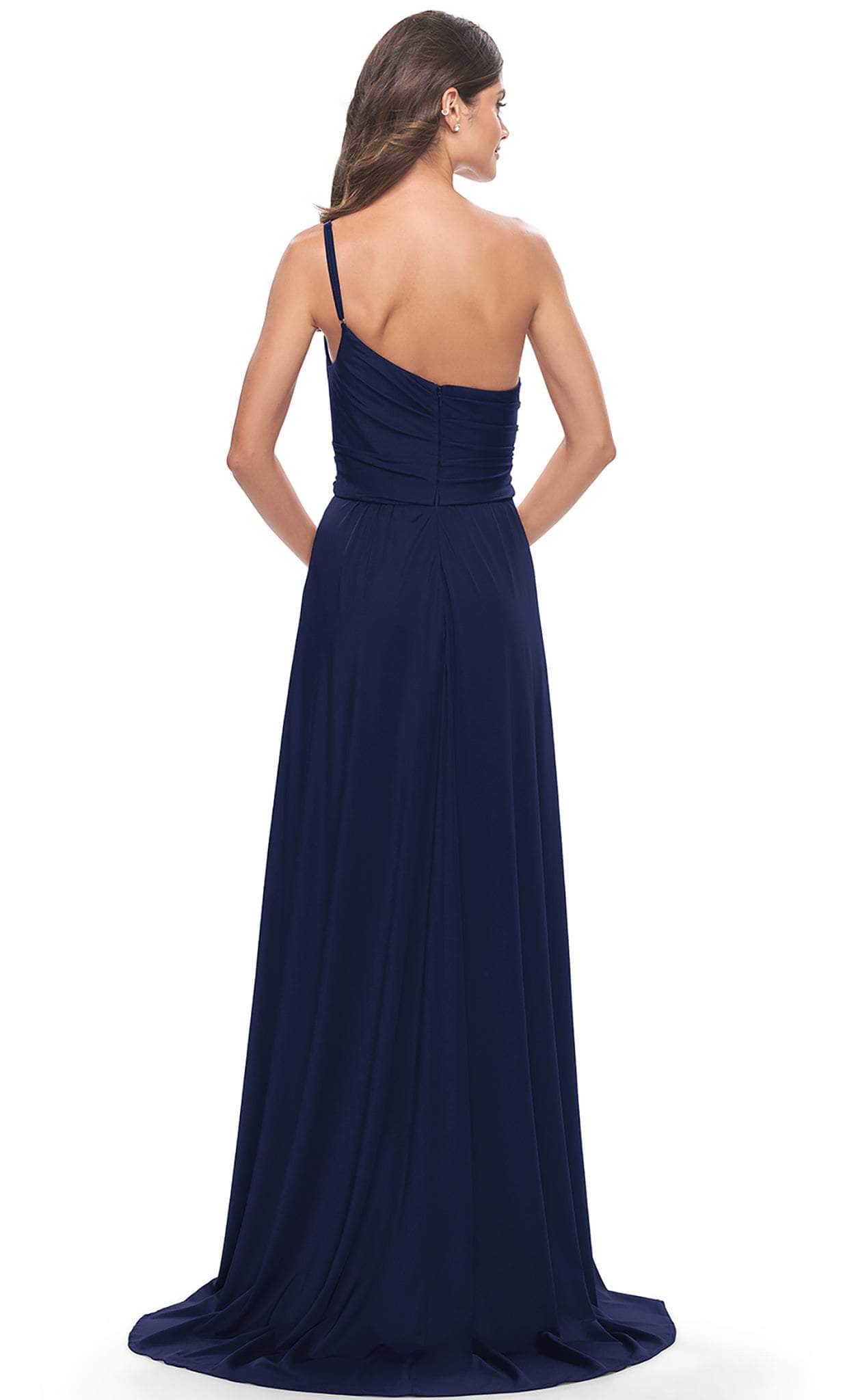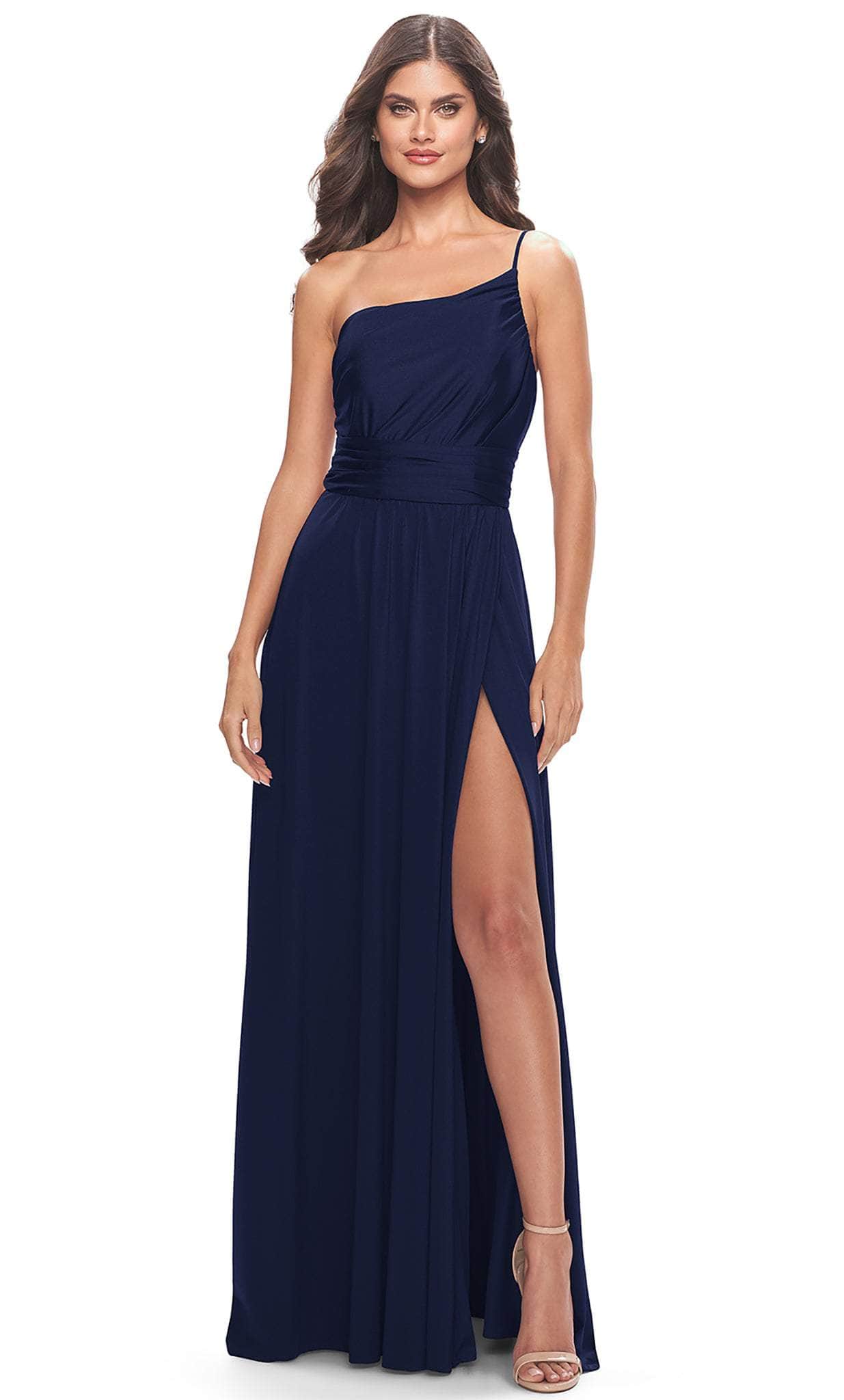 Be destined to shine at your spectacular event in this exceptionally made La Femme 31170 creation. Defined with ruche details gathering along the sleek bodice, this stunner flatters the feminine form with its asymmetrical neckline and spaghetti strap. Revealing a partial open back and a ruched waistband, a high slit reveals those lovely legs as it cascades down to a sweeping denouement. Glow with the utter elegance of a siren in this exceptional La Femme masterpiece. Models are wearing the Dark Berry, Mauve and Navy colors.