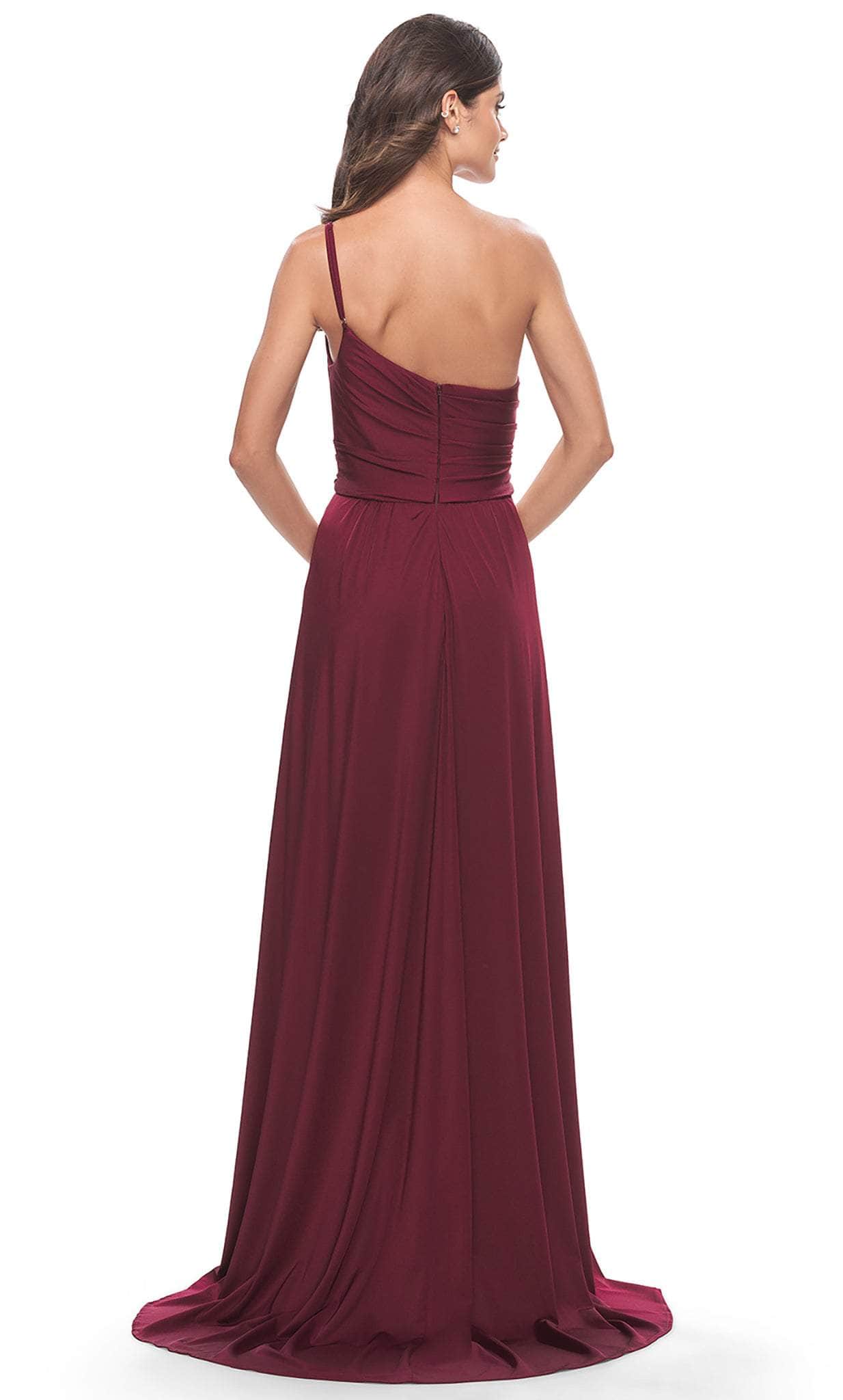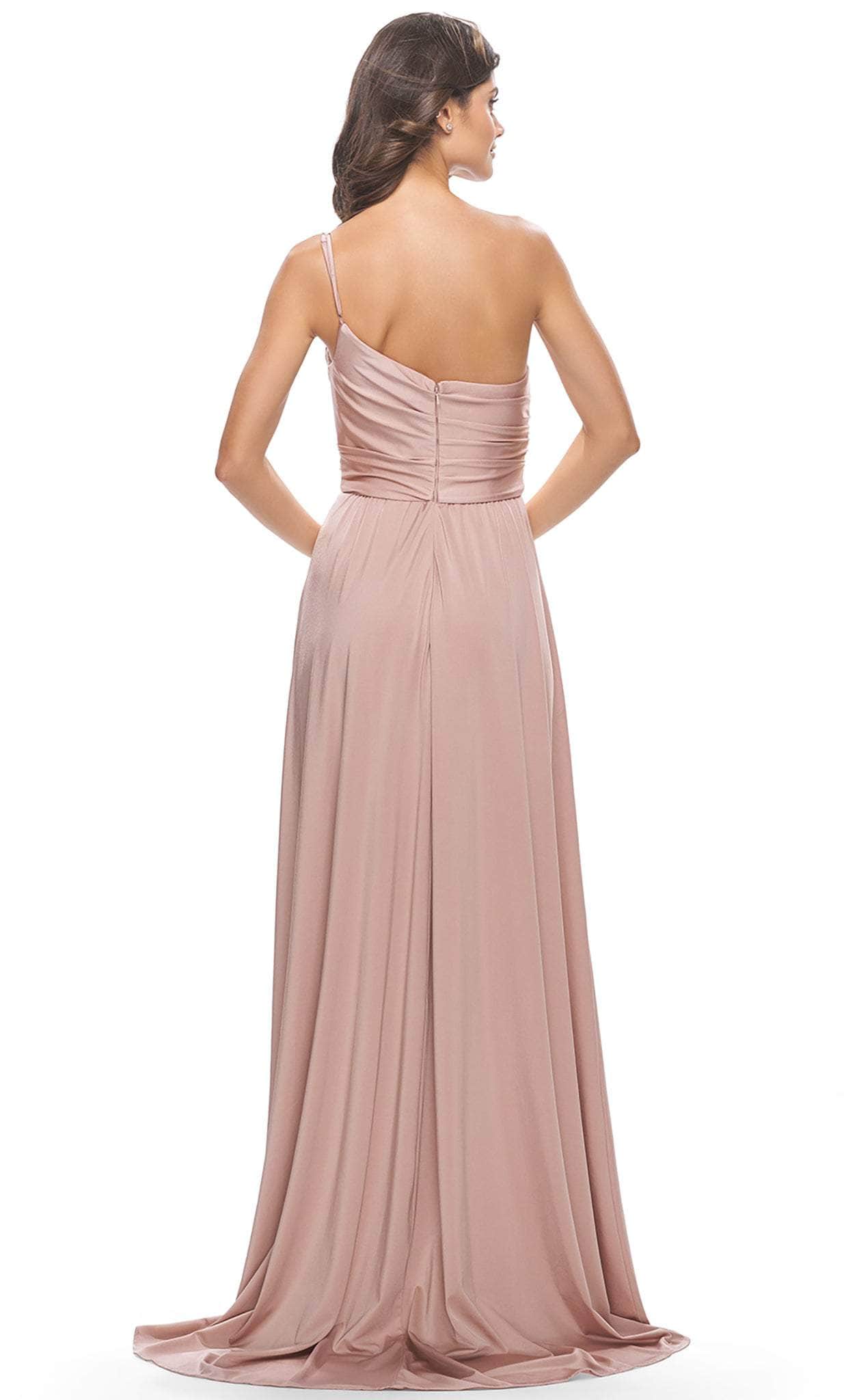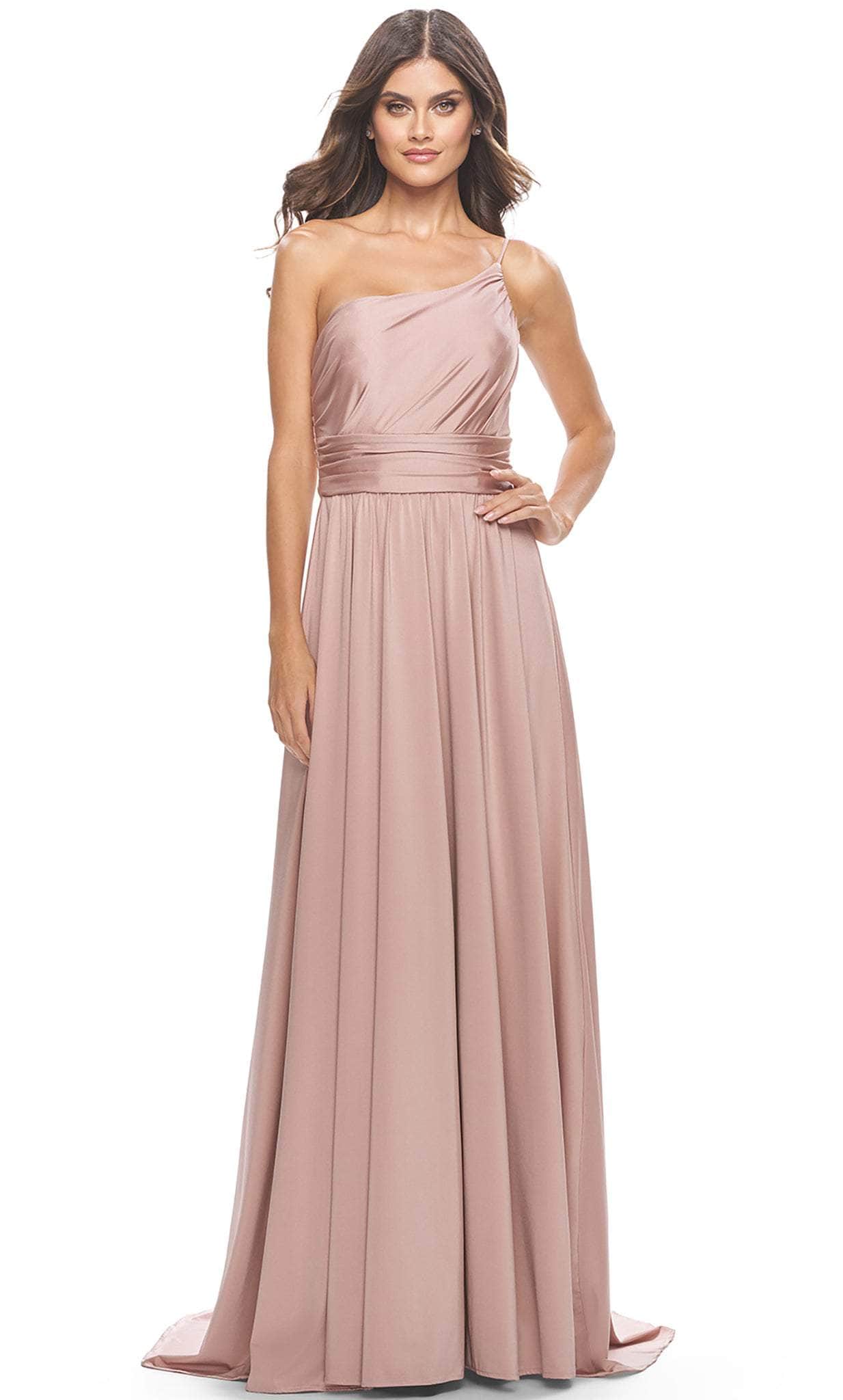 Be destined to shine at your spectacular event in this exceptionally made La Femme 31170 creation. Defined with ruche details gathering along the sleek bodice, this stunner flatters the feminine form with its asymmetrical neckline and spaghetti strap. Revealing a partial open back and a ruched waistband, a high slit reveals those lovely legs as it cascades down to a sweeping denouement. Glow with the utter elegance of a siren in this exceptional La Femme masterpiece. Models are wearing the Dark Berry, Mauve and Navy colors.