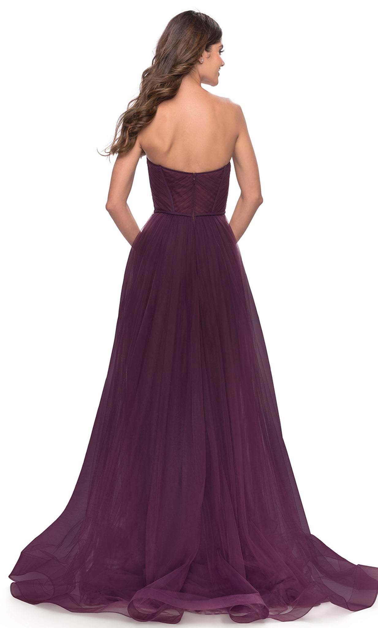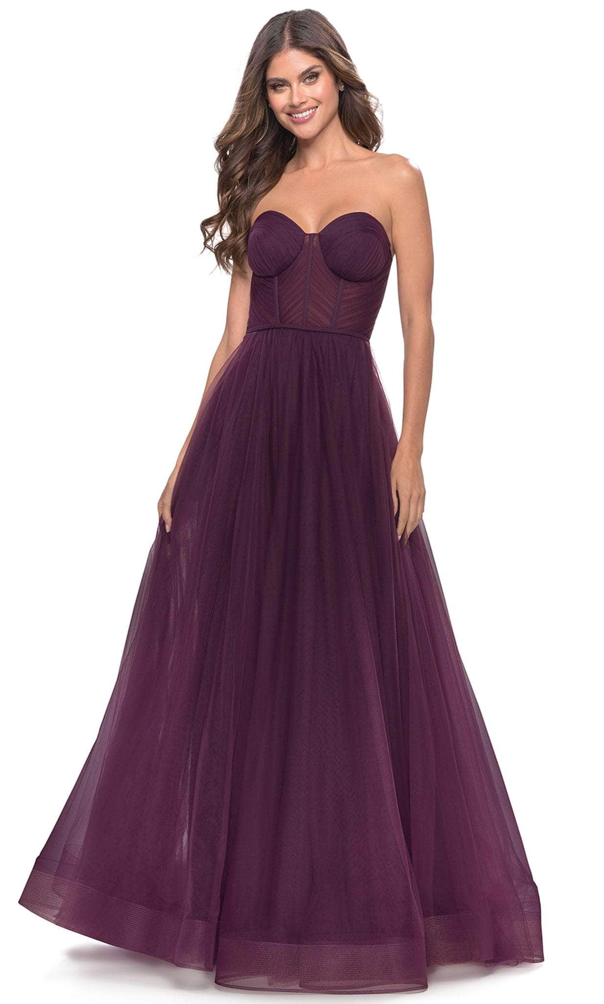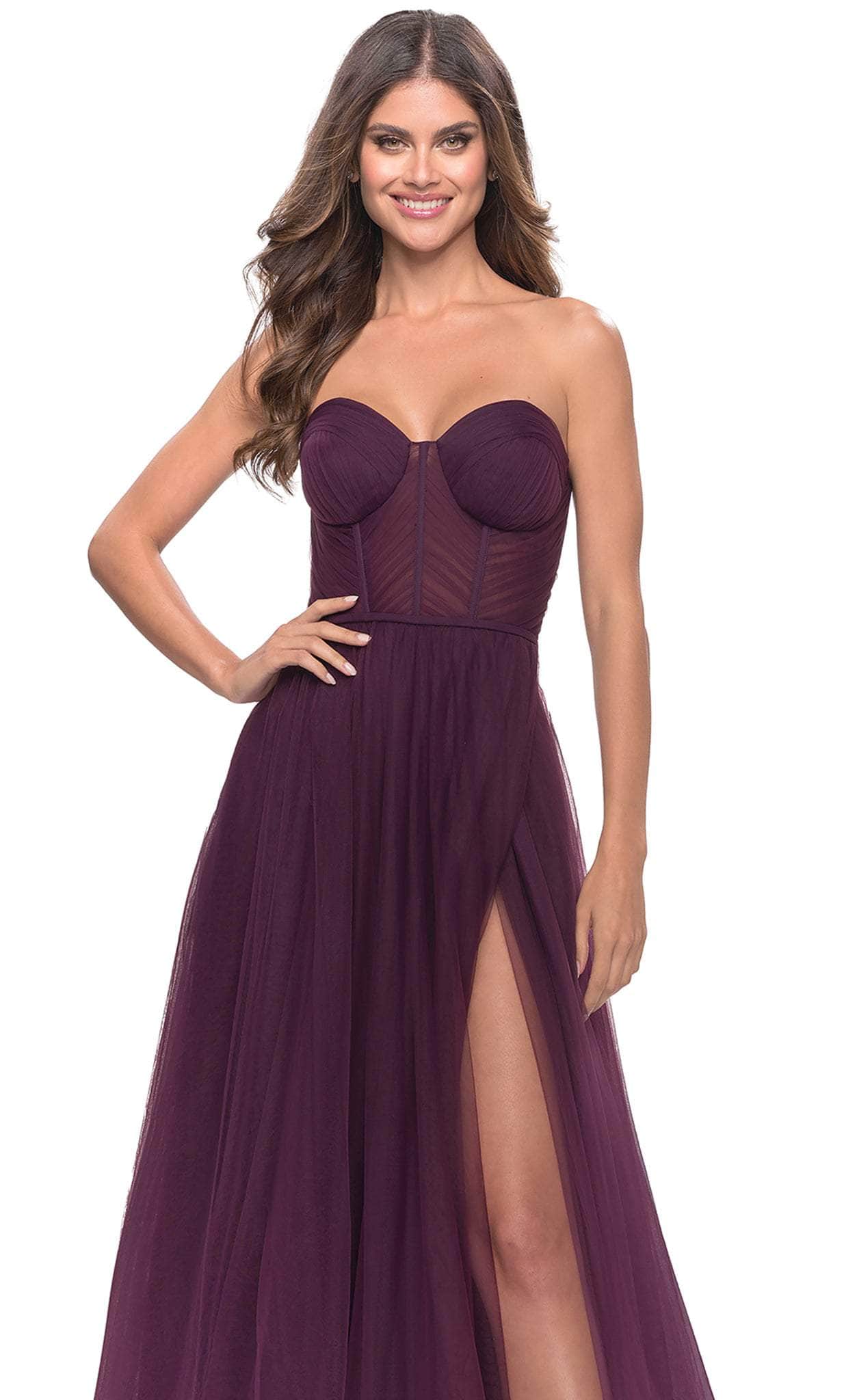 Show off your trendsetting style when you wear this La Femme 31205. This elegant evening dress is tailored with Tulle fabric that features sweetheart neckline, sheer boning details and defined cups. The bodice back has back zipper closure and show some of the skin. The A-line skirt has full-length hemline with train and high side slit that highlight the legs. La Femme 31205 is perfect for a standout style and flawless fit. Models are wearing the Black, Dark Berry, and Dark Emerald colors.