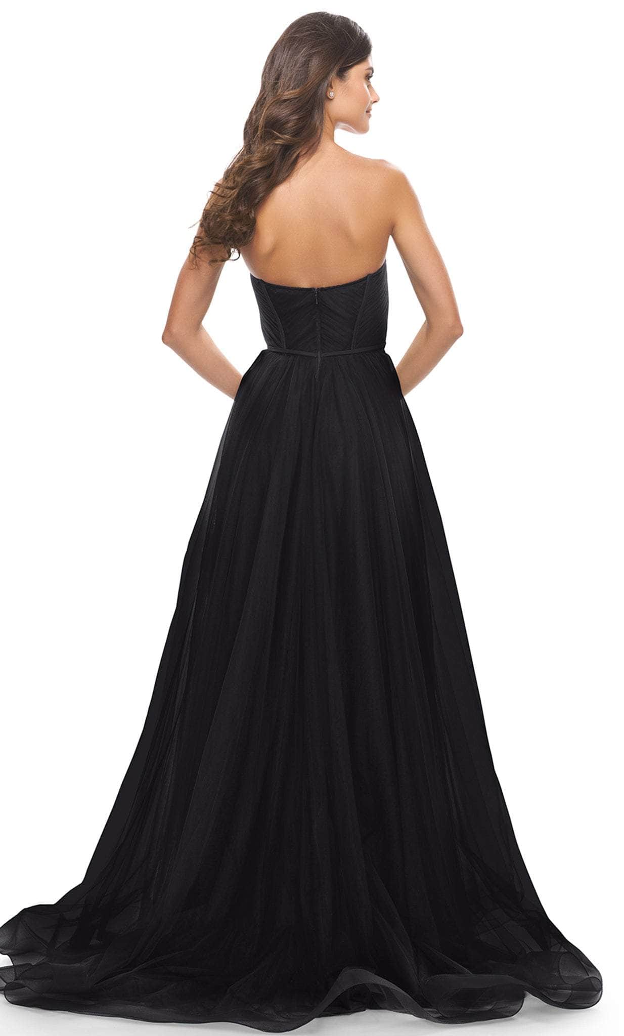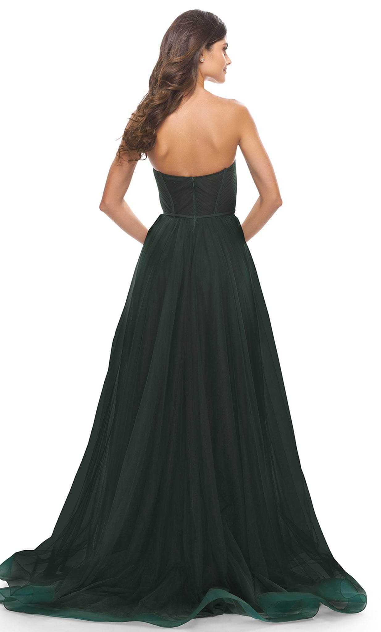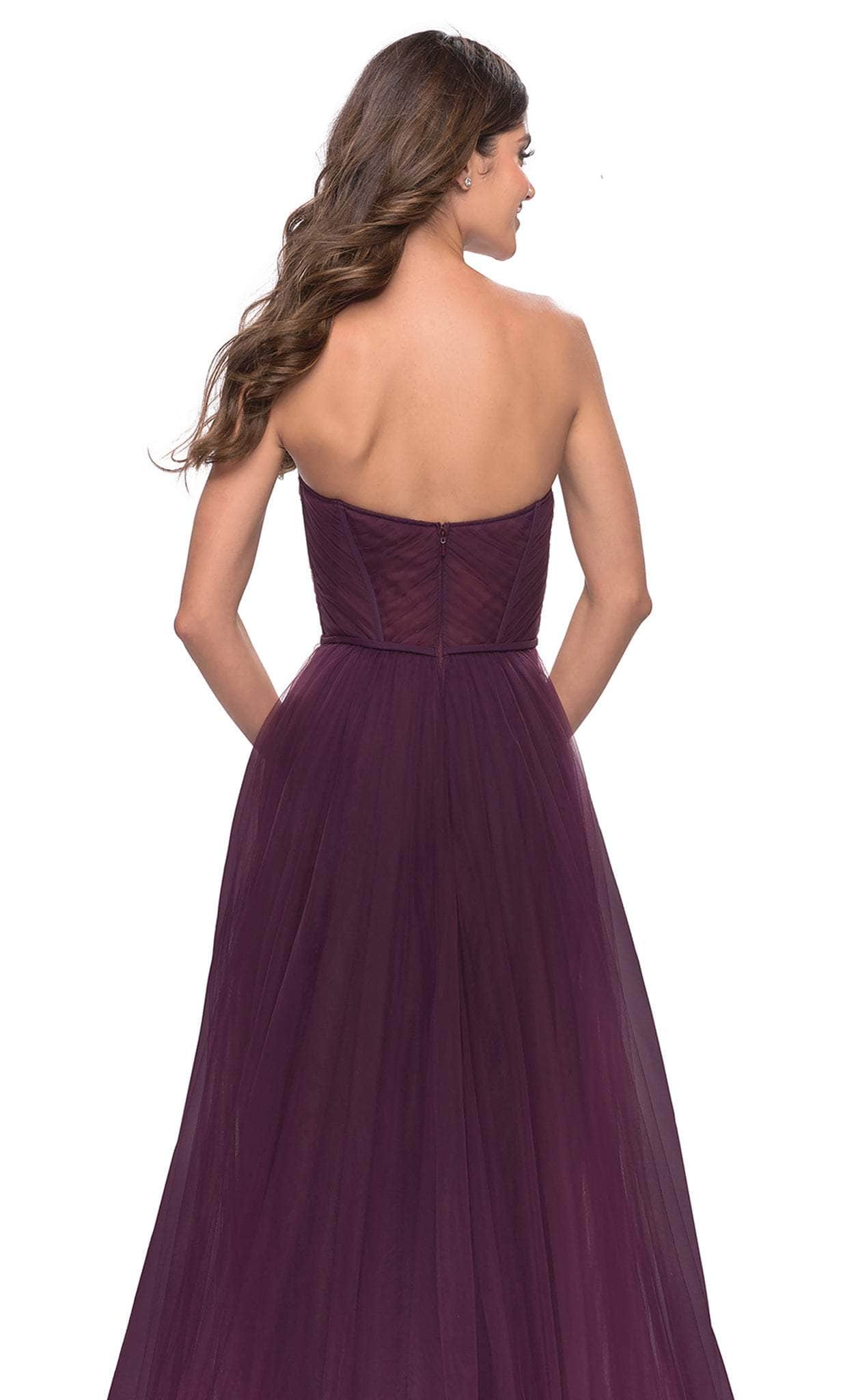 Show off your trendsetting style when you wear this La Femme 31205. This elegant evening dress is tailored with Tulle fabric that features sweetheart neckline, sheer boning details and defined cups. The bodice back has back zipper closure and show some of the skin. The A-line skirt has full-length hemline with train and high side slit that highlight the legs. La Femme 31205 is perfect for a standout style and flawless fit. Models are wearing the Black, Dark Berry, and Dark Emerald colors.