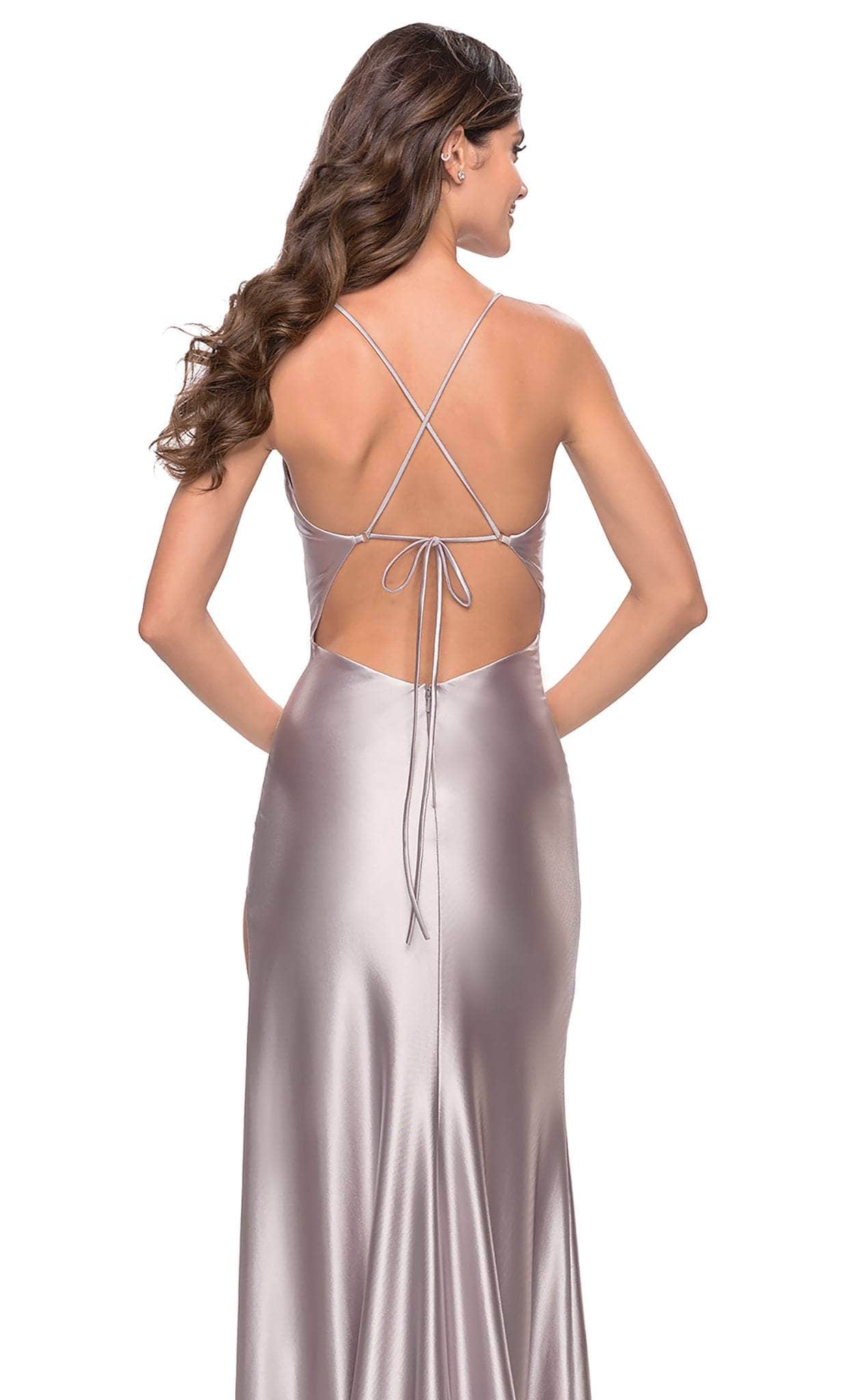 Launch your career as a style star when you arrive in this scintillating La Femme 31208 creation. Sculpted with tailoring lines on a metallic liquid jersey silhouette, this piece flaunts a scoop neckline with thin shoulder straps. Showing off a bandeau lace up open design at the back, a high slit for leg exposure accents the sheath skirt as it trails to the floor with a sweeping denouement. Dance the night away in pure bliss in this La Femme masterpiece. Models are wearing the Bronze, Silver and Teal colors.