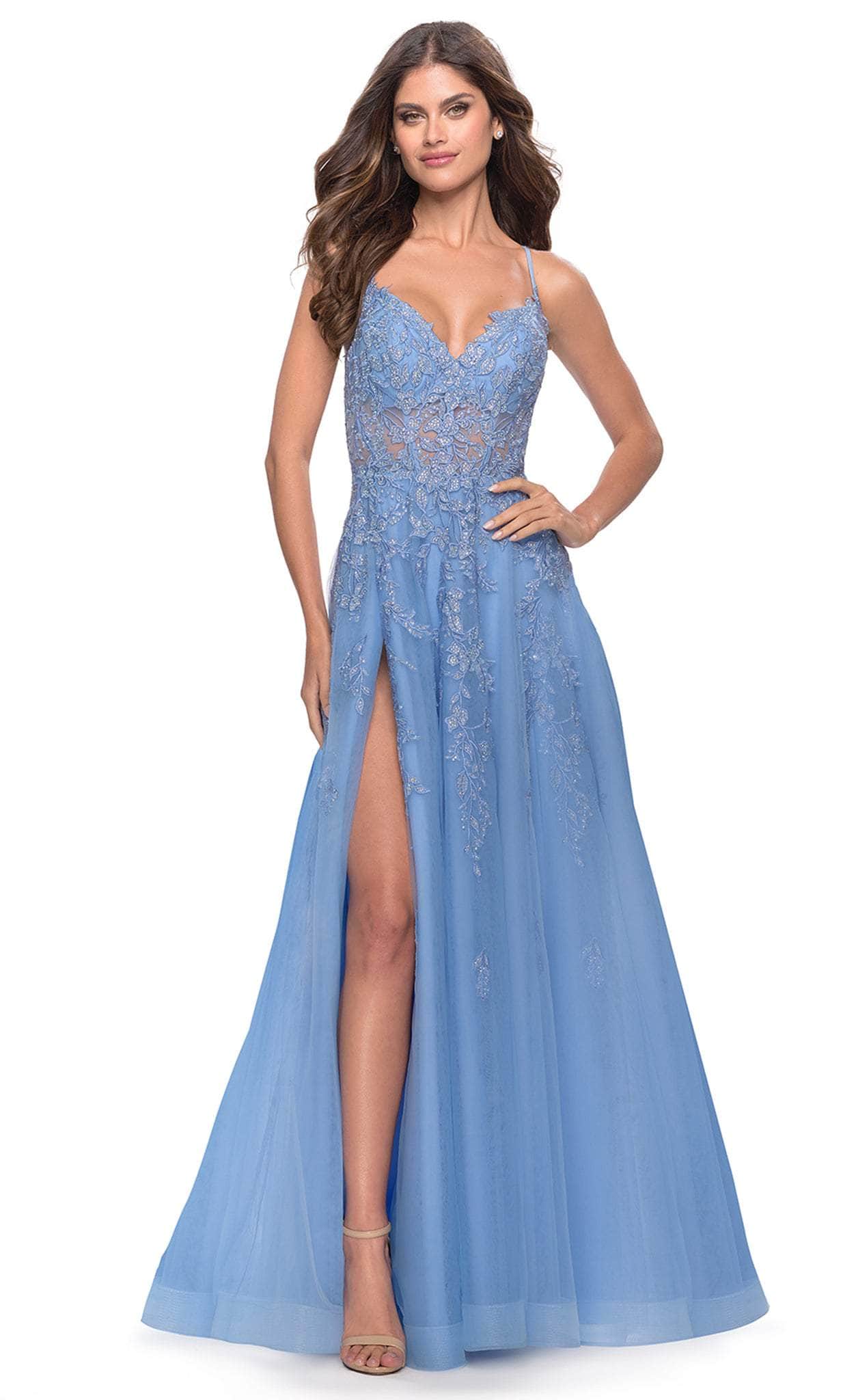 Enter the hall with grace and beauty in La Femme 31284 creation. The embroideries embellished in this gorgeous gown bring an elegant touch. The sleeveless bodice is crowned with a V-neckline and supported by thin straps that lead to a crisscross back with a lace-up back finish. A slit is added to the full-length skirt displaying an A-line silhouette with a sweep train finish. This La Femme 31284 style is a classic look that works for many special occasions. Model is wearing Cloud Blue color.