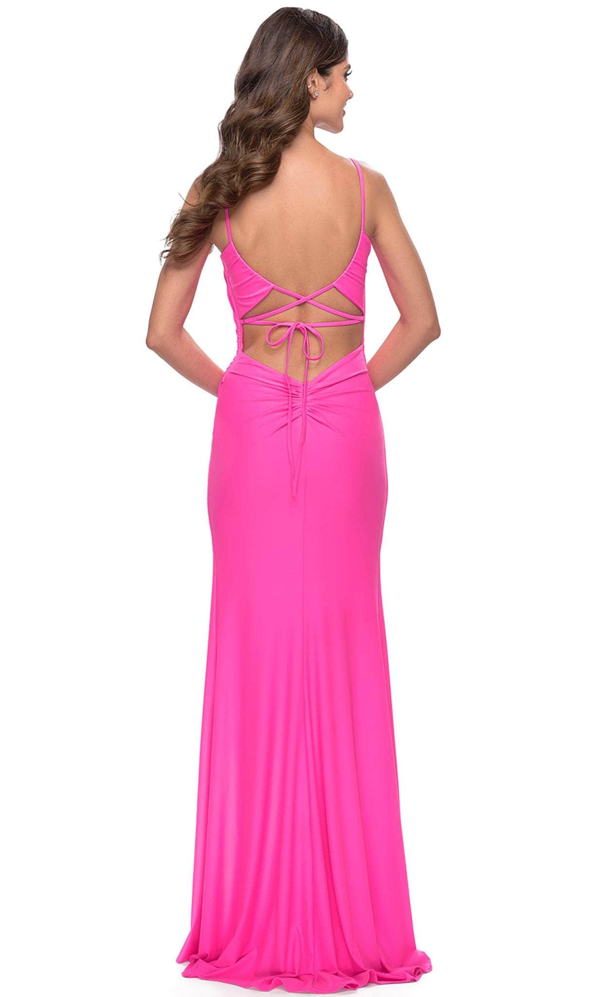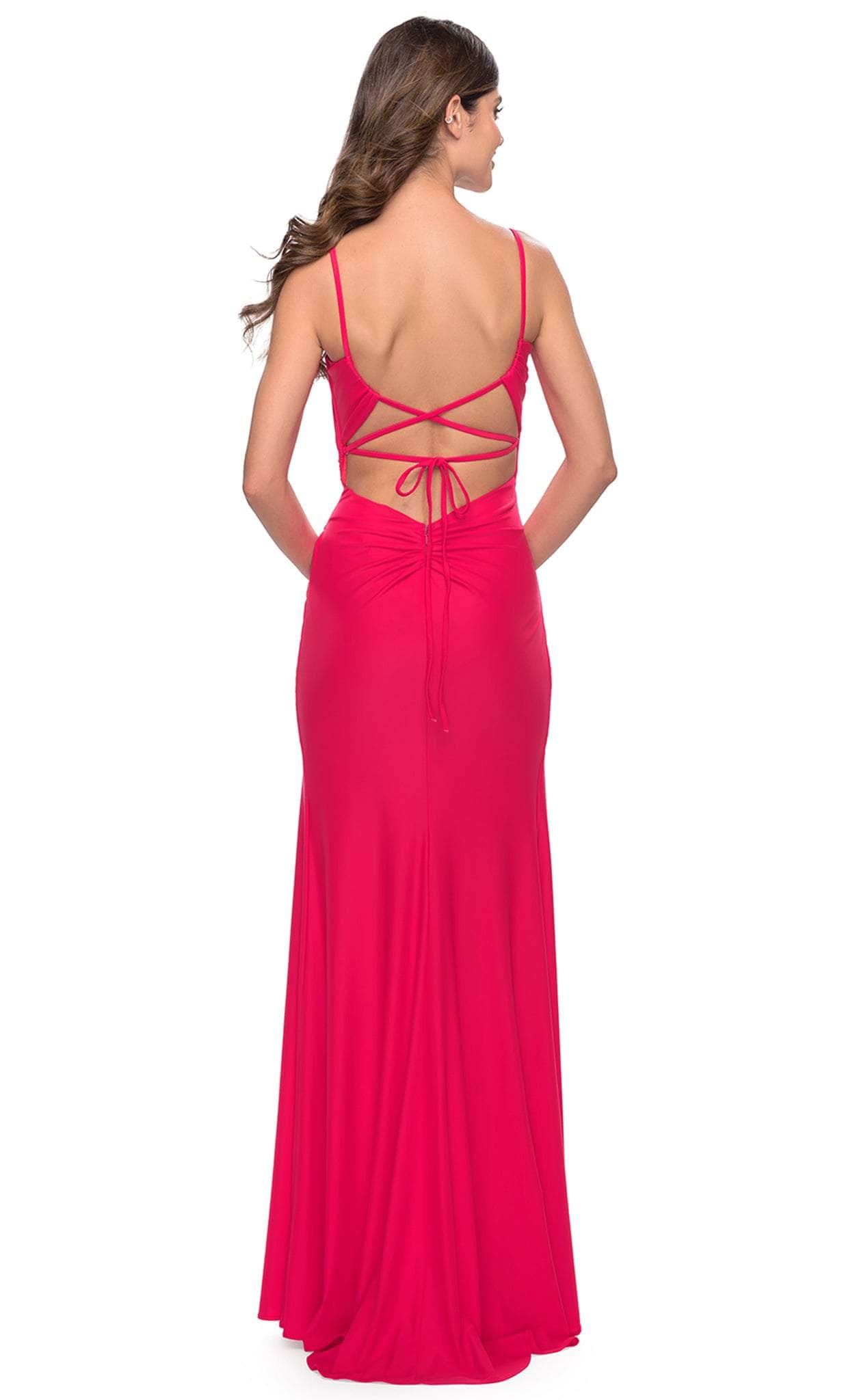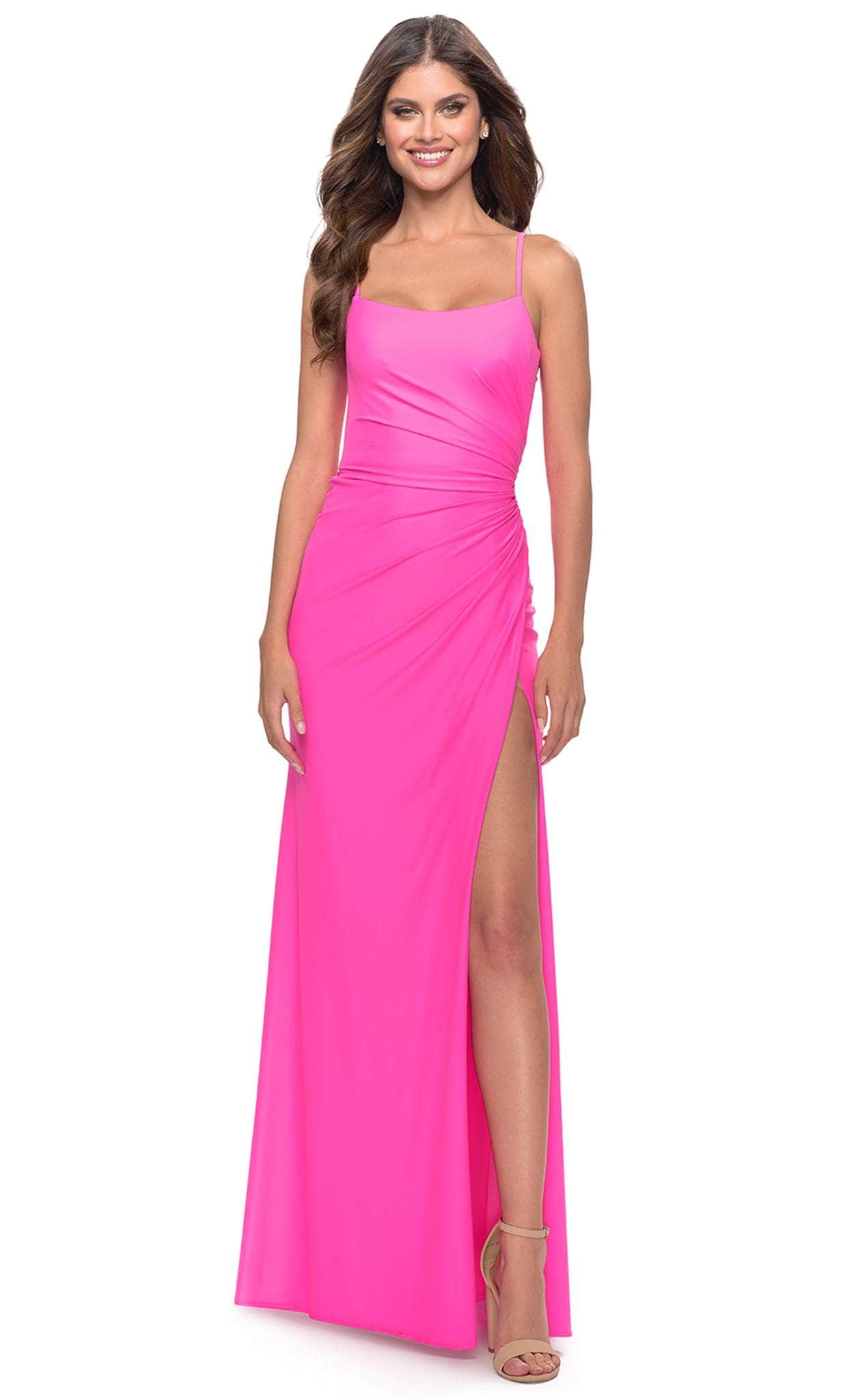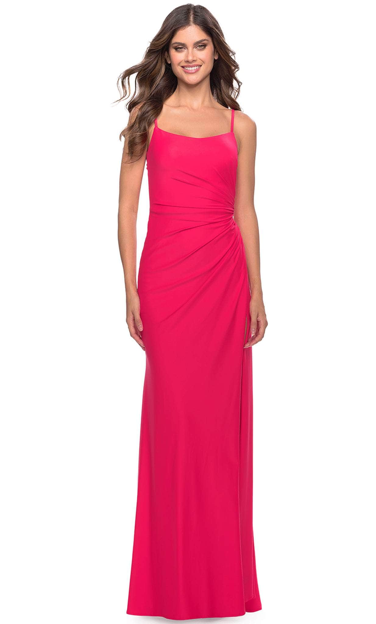 Enhance your visual appeal in this luxurious La Femme 31329 prom dress. This charming dress creation features a square neckline on the bodice secured with spaghetti straps and an open back with adjustable tie strap patterns that also make it look stunning. The dress then follows to the sides that have ruched detailing that bring through a high slit, where the dress finishes with a light train. Flatter your shape with a sculpted gown by La Femme 31329! Model is wearing Hot Coral, and Neon Blue colors