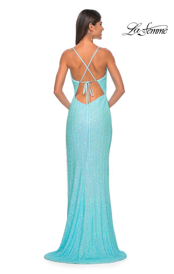 Bring a breathtaking new look to prom night in this stunning La Femme 31444 special occasion dress. This magnificent dress creation features a V neckline with draping fabric secured by spaghetti straps that reach behind the strappy open back with the single tie knot. It is then followed by a back zipper into the sheath silhouette with a fringe beaded high slit and ends with a sweep train. Exude a streamlined yet edgy style as you dance all night long in this alluring La Femme 31444 creation! Models are wearing Light Blue, Periwinkle and Light Pink