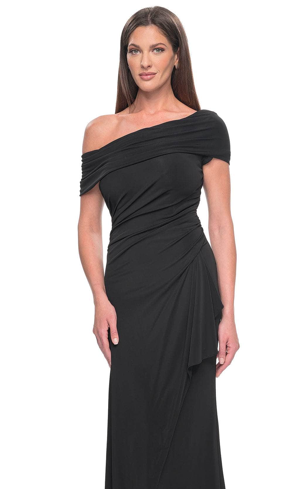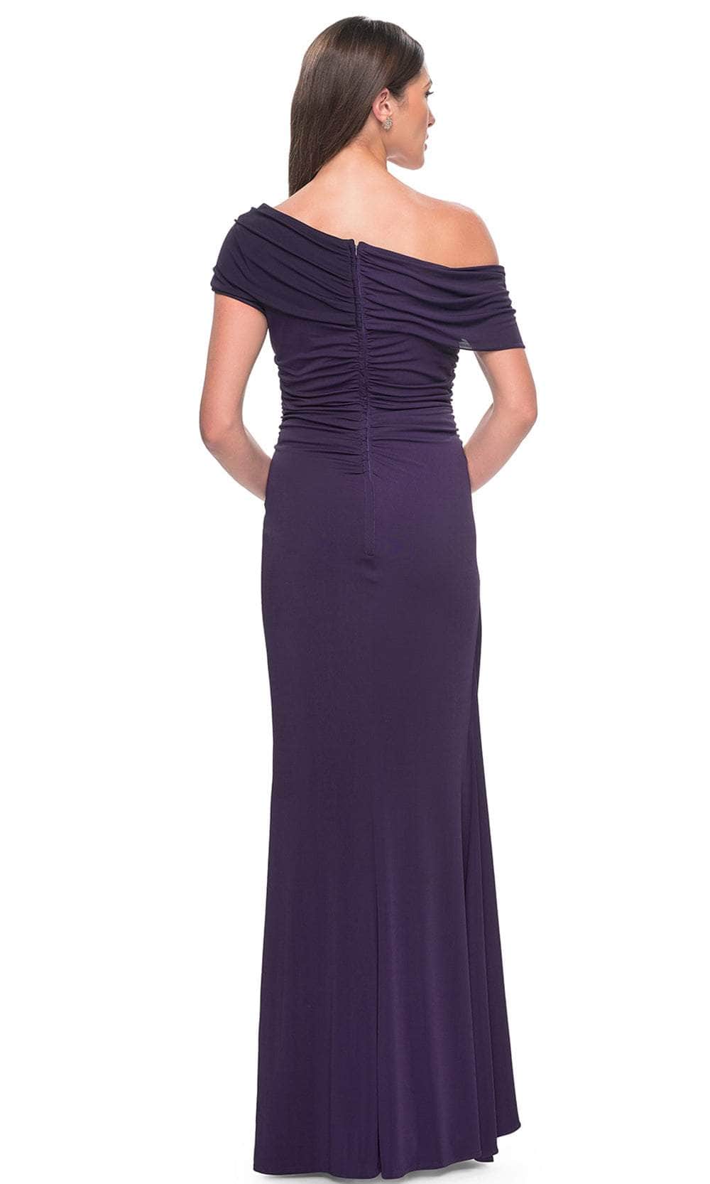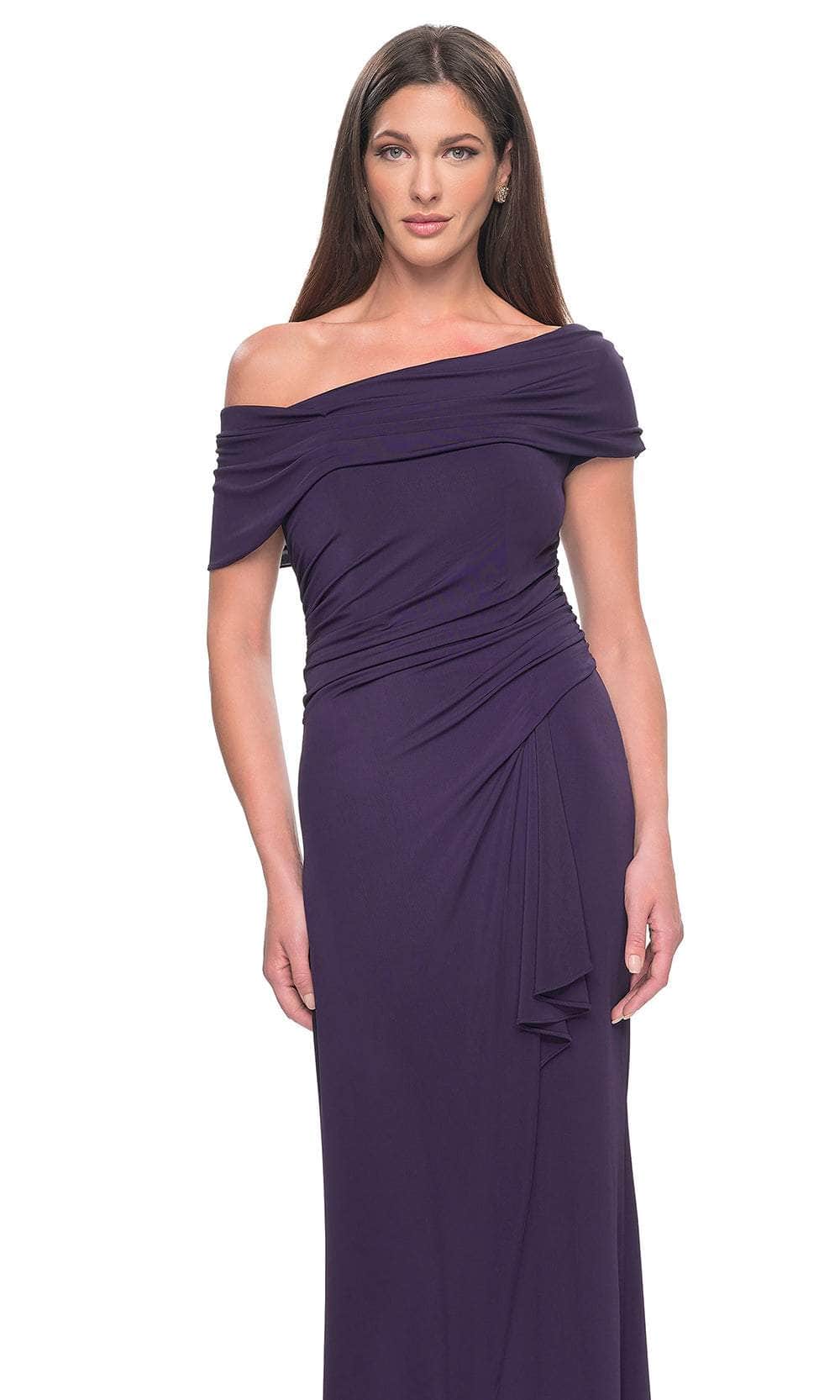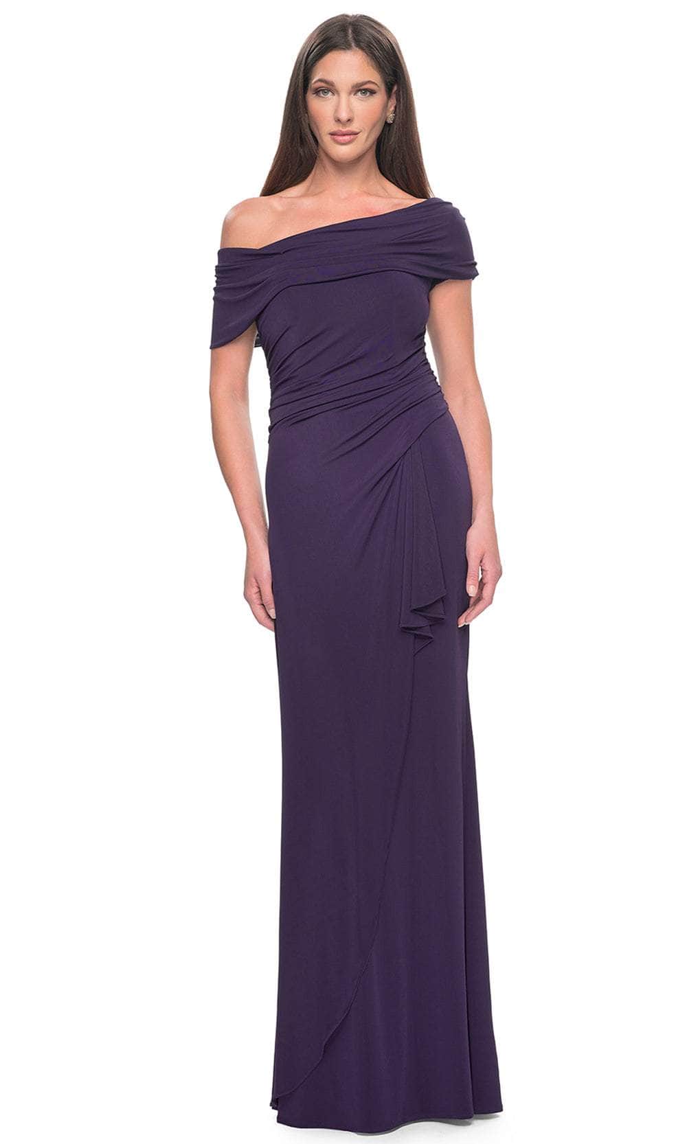 You will draw admiration in the stunning La Femme 31459 formal gown. Featuring an elegant asymmetrical off-shoulder neckline on a flattering bodice, this dress exudes sophistication. The waist displays a draping effect that enhances the overall allure. The back mirrors the asymmetry of the front and is elegantly enclosed by a zipper. Completing the look, a charming ruffle detail graces the full-length sheath skirt. Embrace the essence of simple yet captivating beauty in this masterpiece, La Femme 31459. Models are wearing Black, and Eggplant colors.