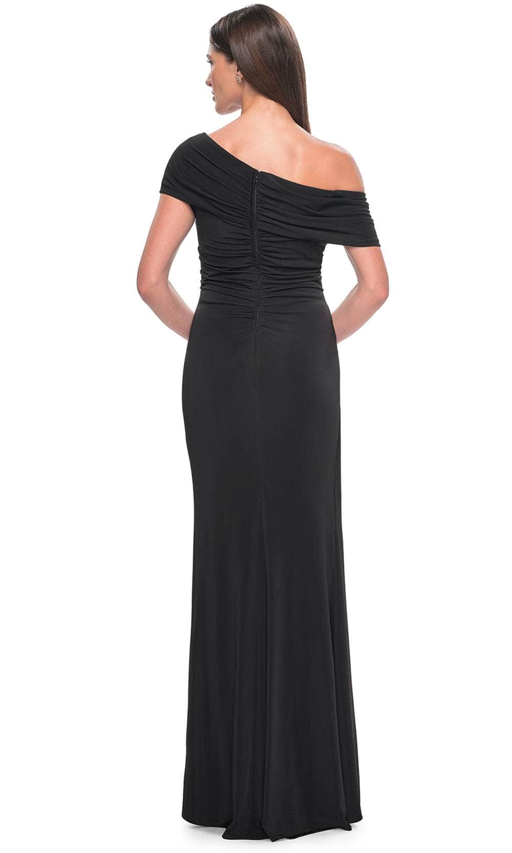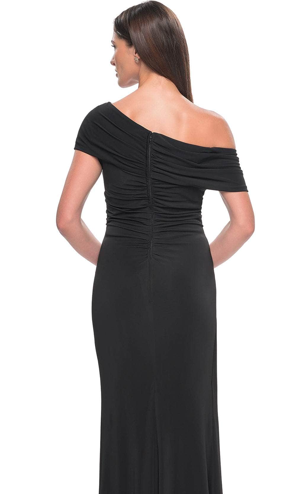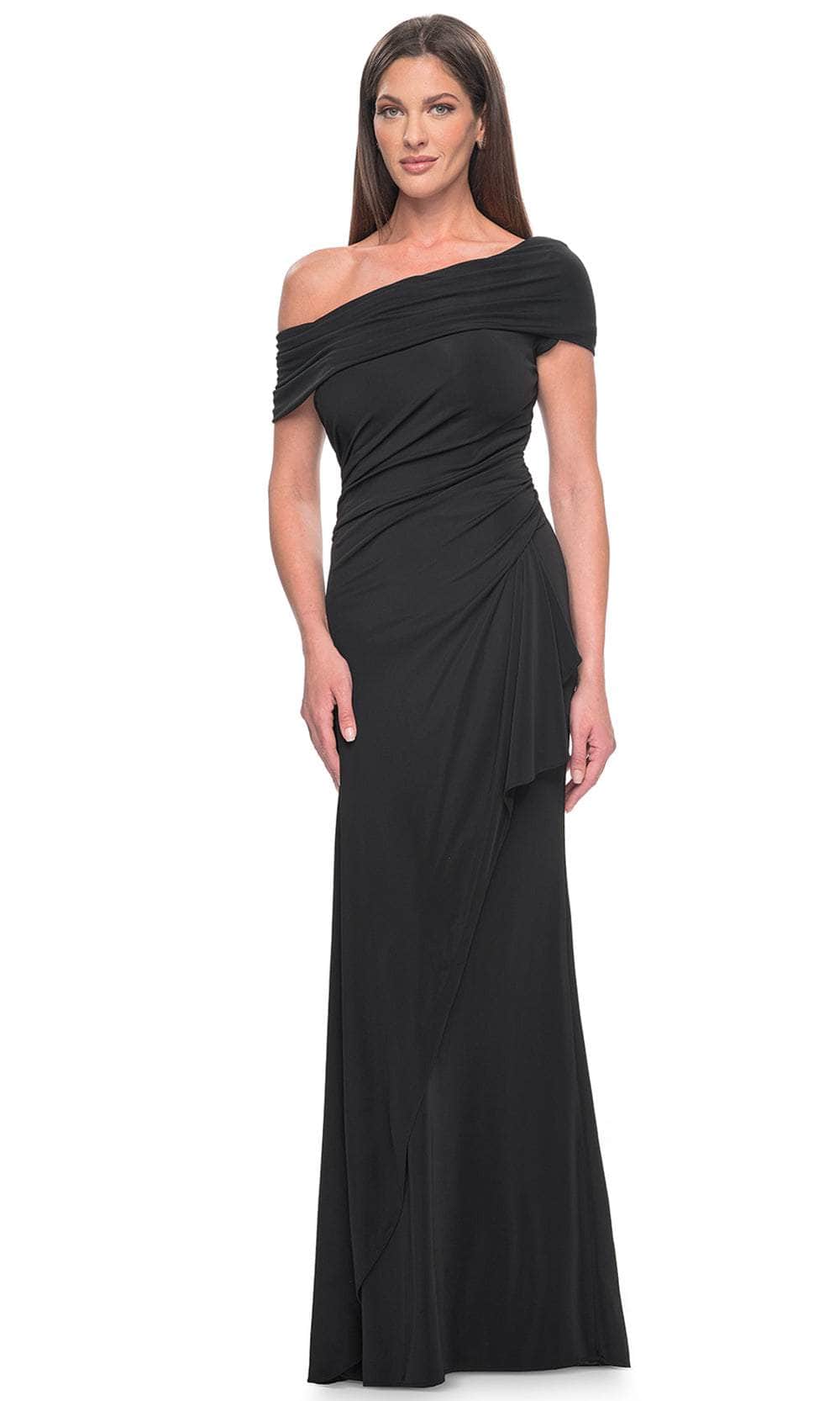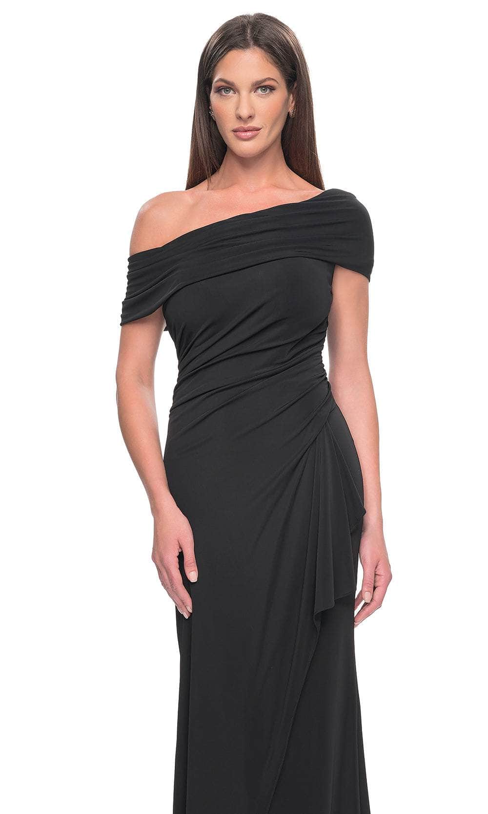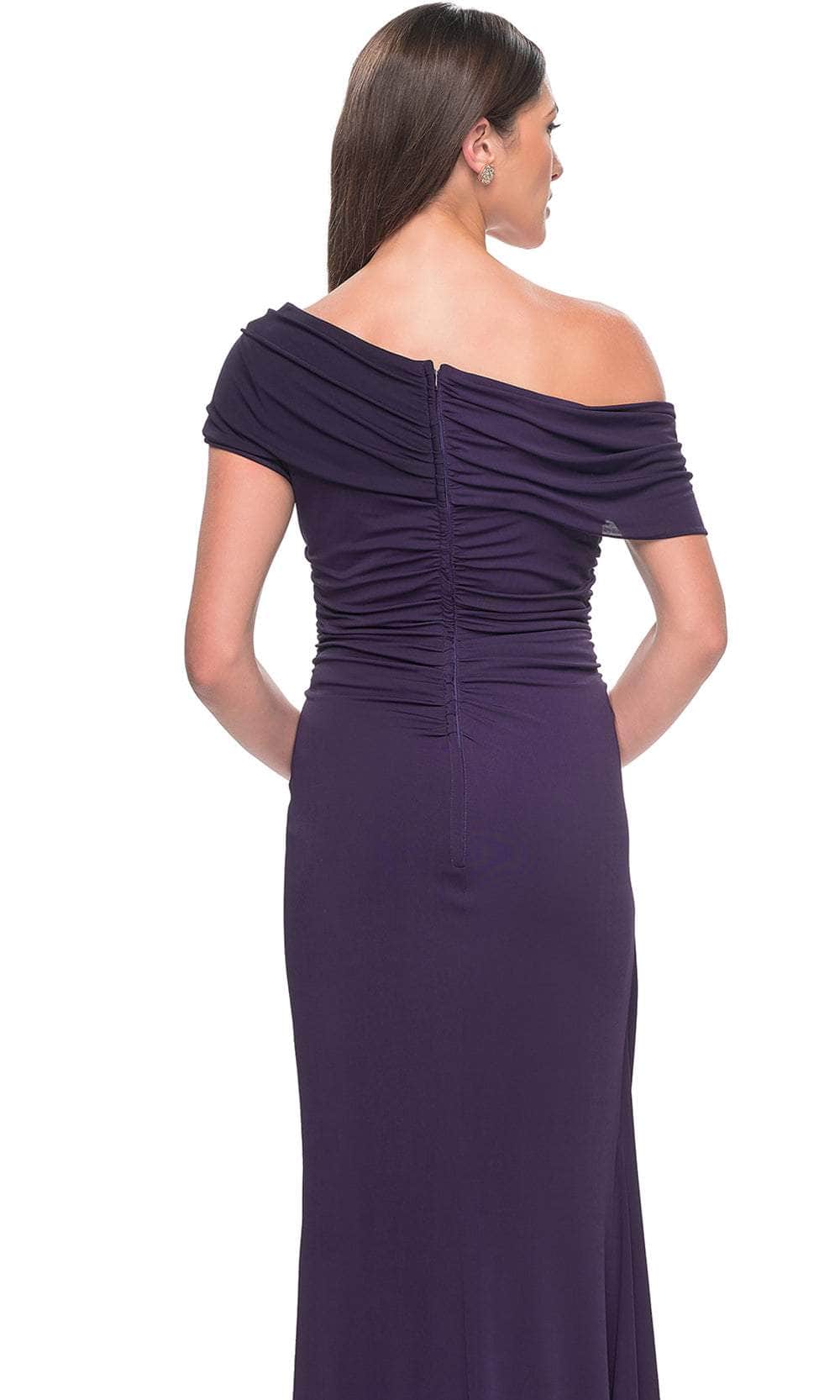 You will draw admiration in the stunning La Femme 31459 formal gown. Featuring an elegant asymmetrical off-shoulder neckline on a flattering bodice, this dress exudes sophistication. The waist displays a draping effect that enhances the overall allure. The back mirrors the asymmetry of the front and is elegantly enclosed by a zipper. Completing the look, a charming ruffle detail graces the full-length sheath skirt. Embrace the essence of simple yet captivating beauty in this masterpiece, La Femme 31459. Models are wearing Black, and Eggplant colors.