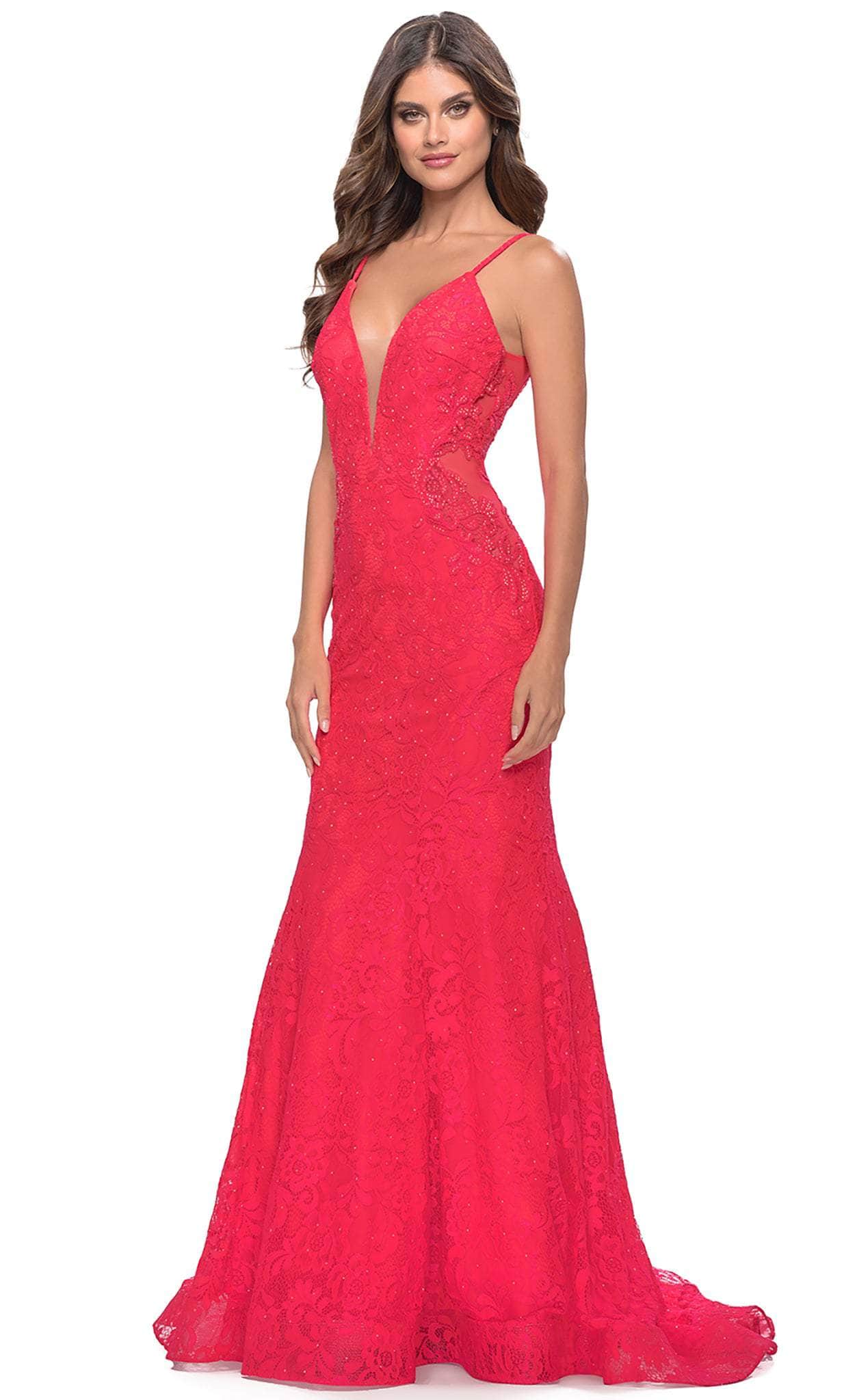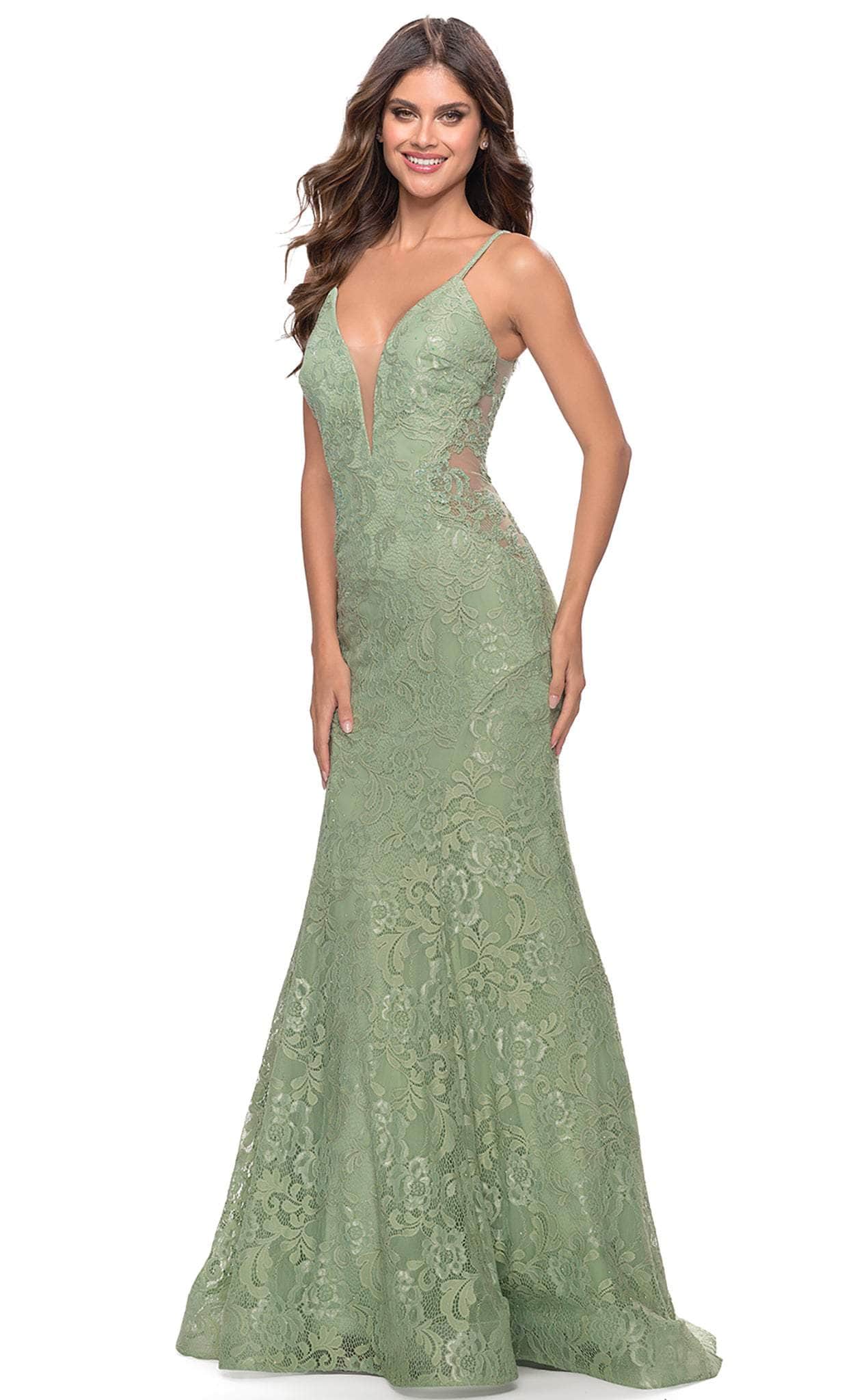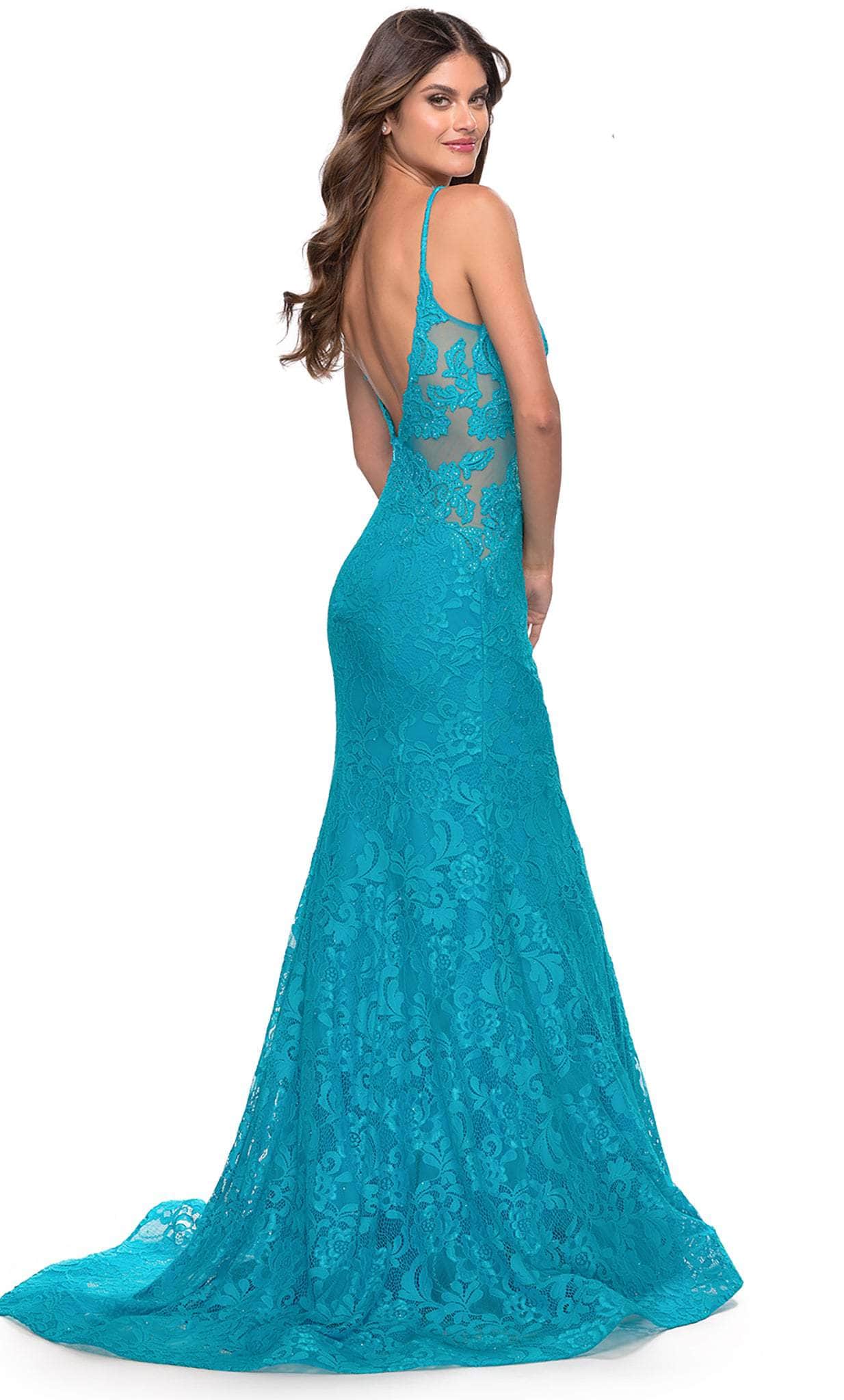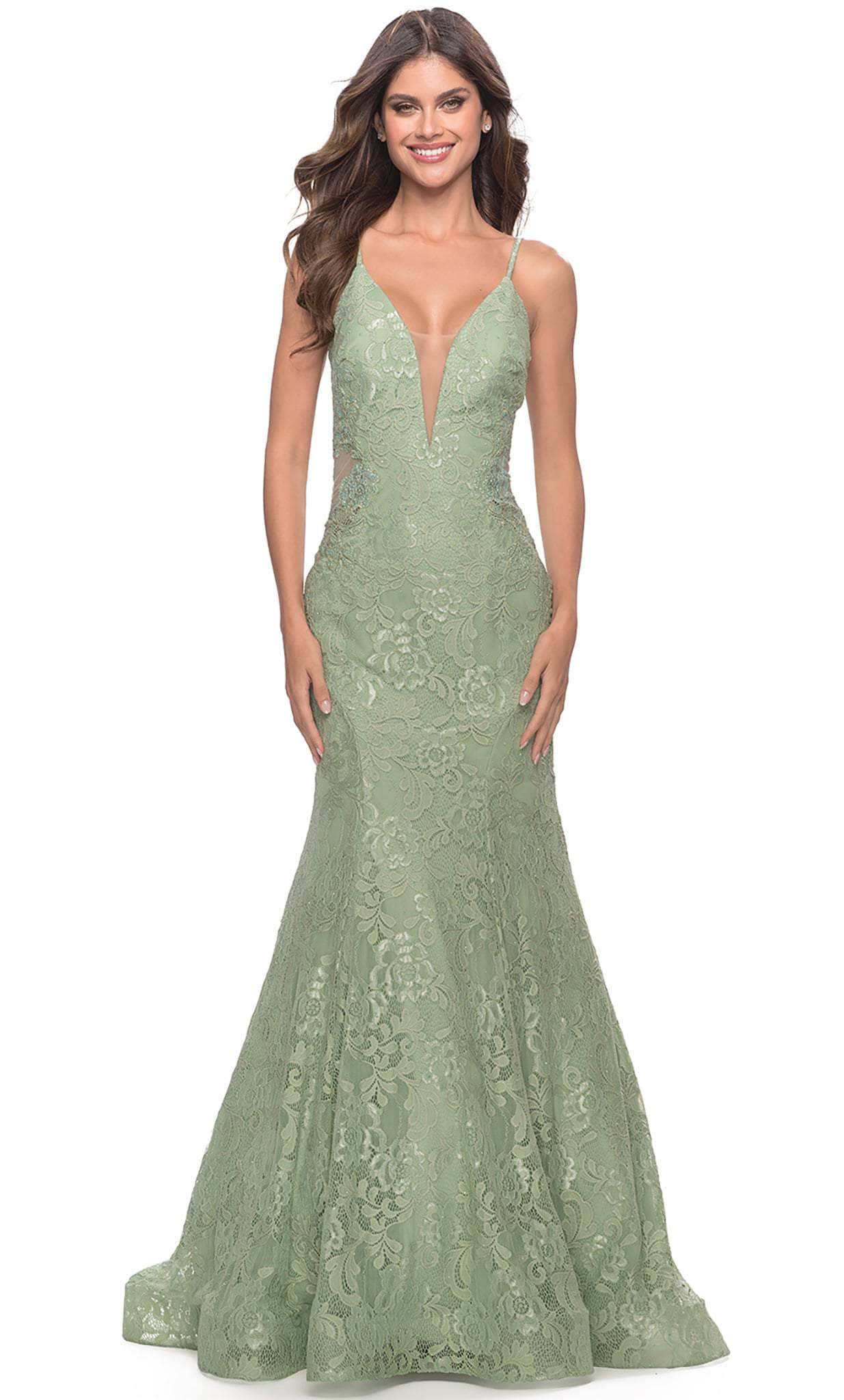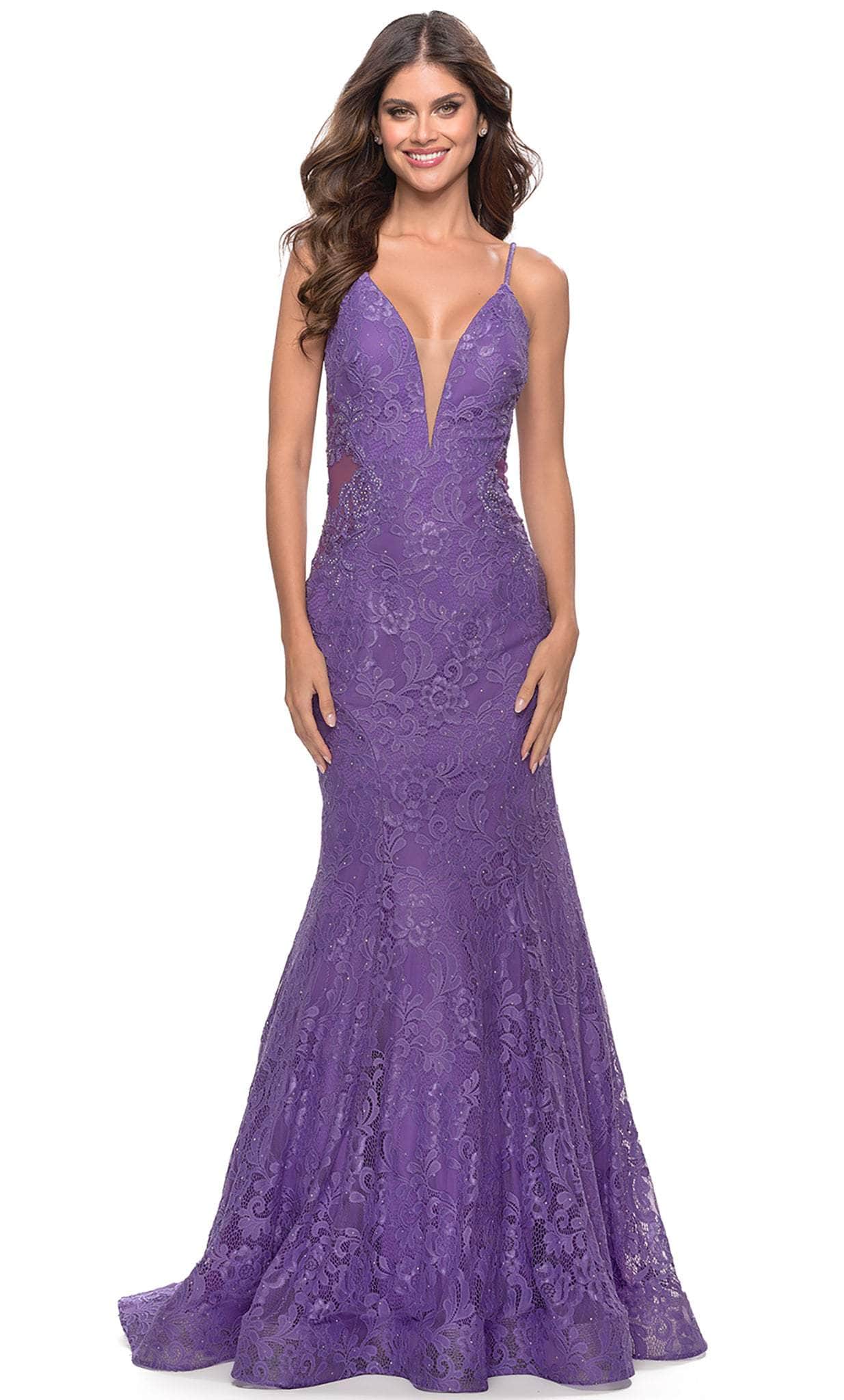 Embellish yourself with opulence and sultry style in this exceptionally crafted La Femme 31512 creation. Shimmering with a galaxy of heat set stones along the floral lace spectacle, this stunner parades a plunging v-neckline with a modesty inset and spaghetti straps. Styled with sheer sides and a deep v-open back, the mermaid skirt fluttering to the floor with a sweeping denouement. Don a style that will completely boost you to the top in this La Femme masterpiece. Models are wearing the Aqua, Hot Coral, Purple and Sage colors.