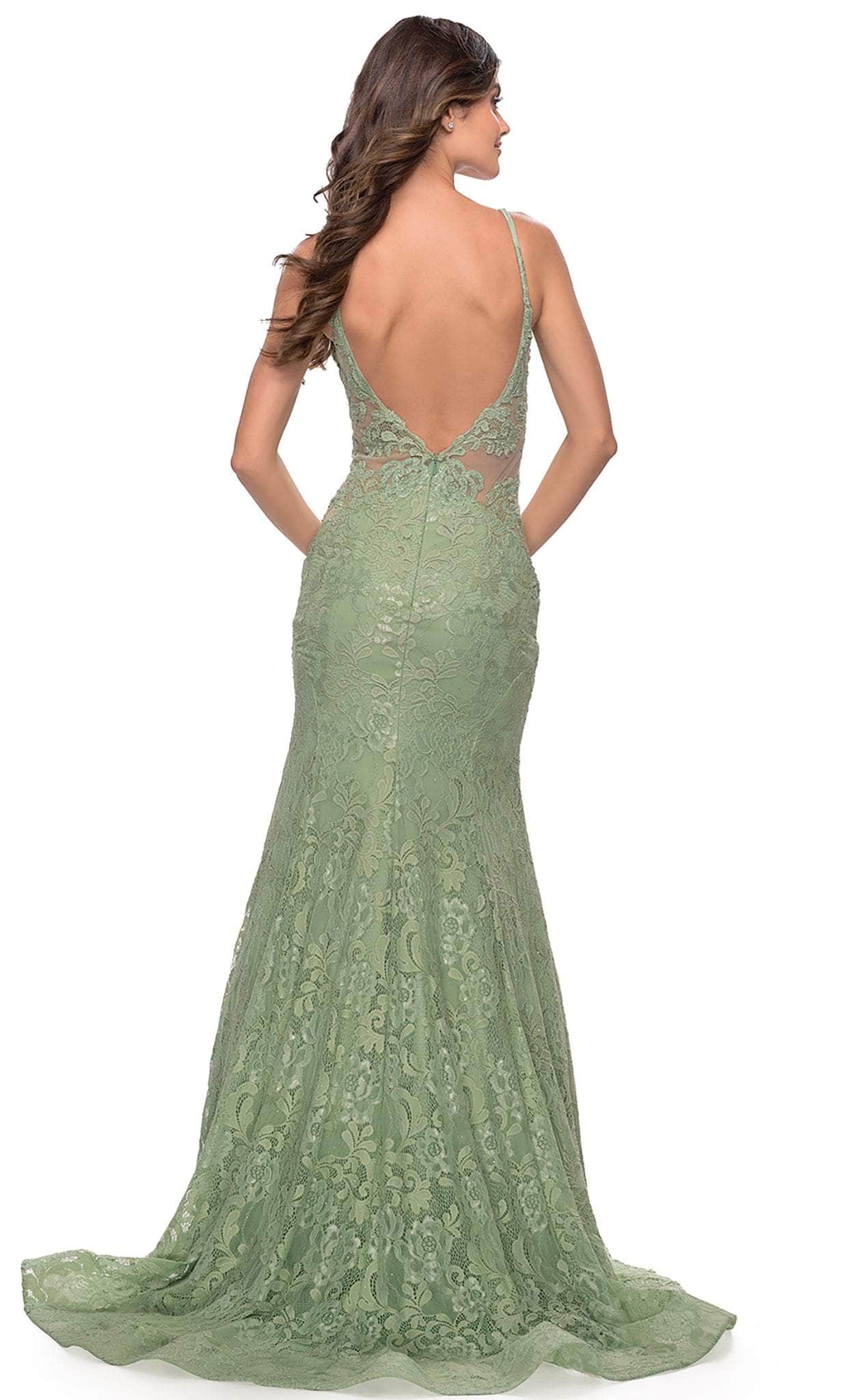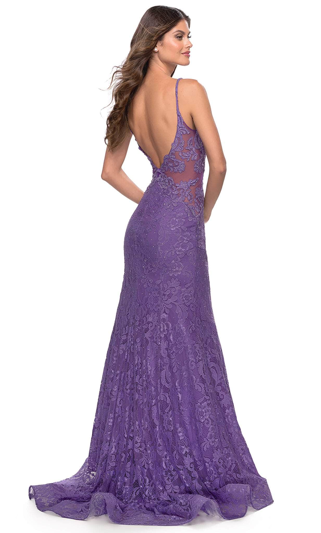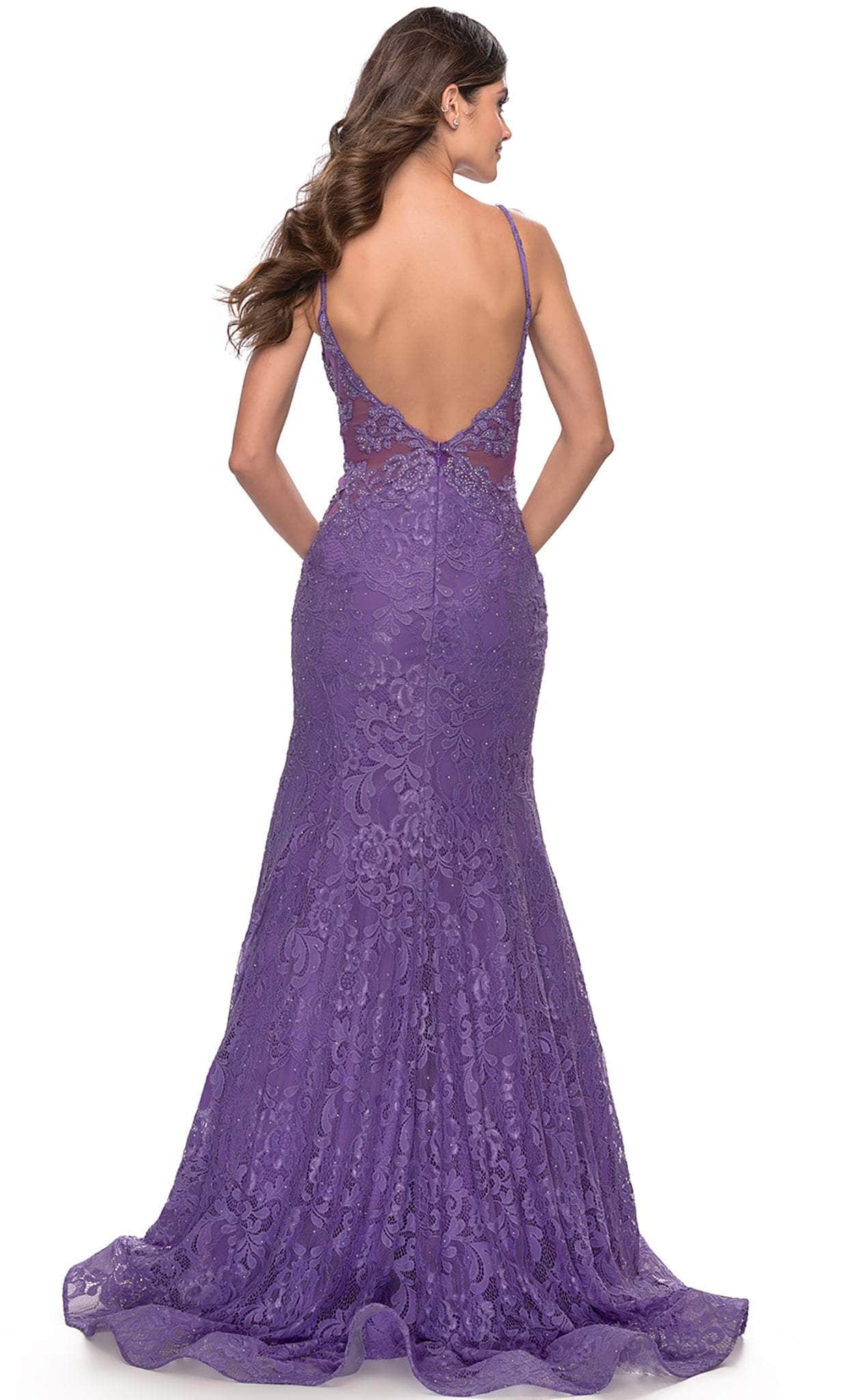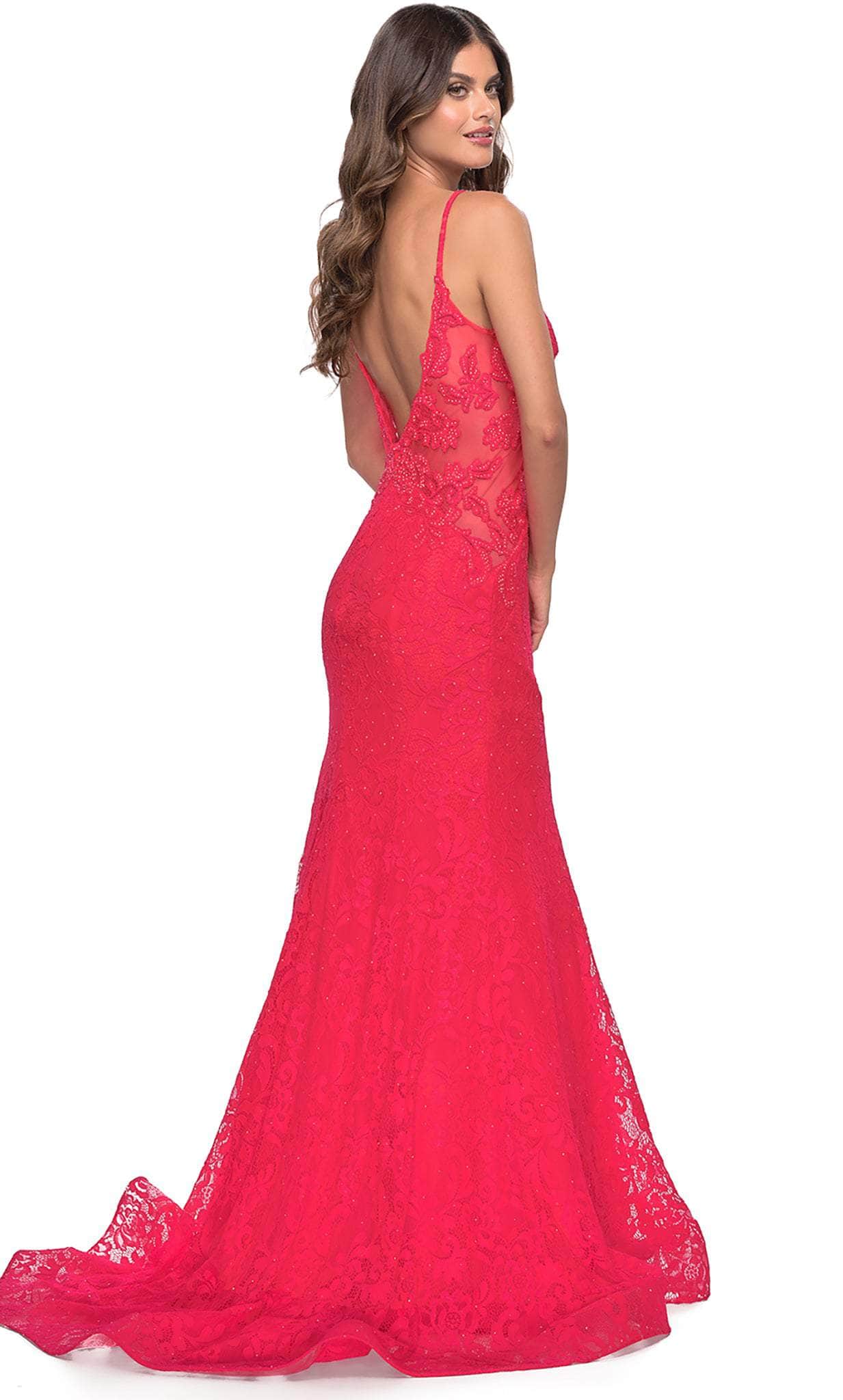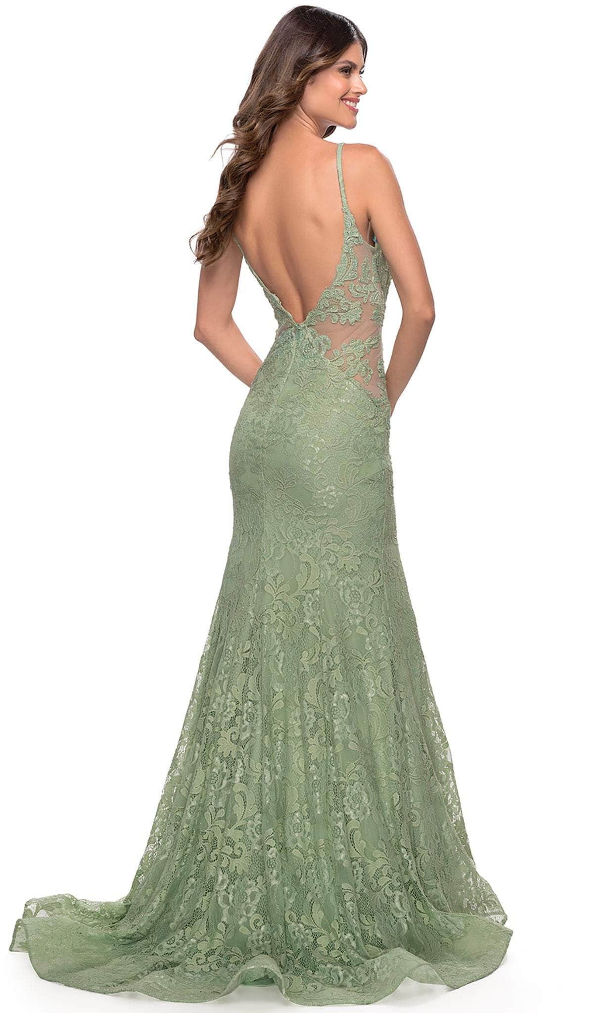 Embellish yourself with opulence and sultry style in this exceptionally crafted La Femme 31512 creation. Shimmering with a galaxy of heat set stones along the floral lace spectacle, this stunner parades a plunging v-neckline with a modesty inset and spaghetti straps. Styled with sheer sides and a deep v-open back, the mermaid skirt fluttering to the floor with a sweeping denouement. Don a style that will completely boost you to the top in this La Femme masterpiece. Models are wearing the Aqua, Hot Coral, Purple and Sage colors.