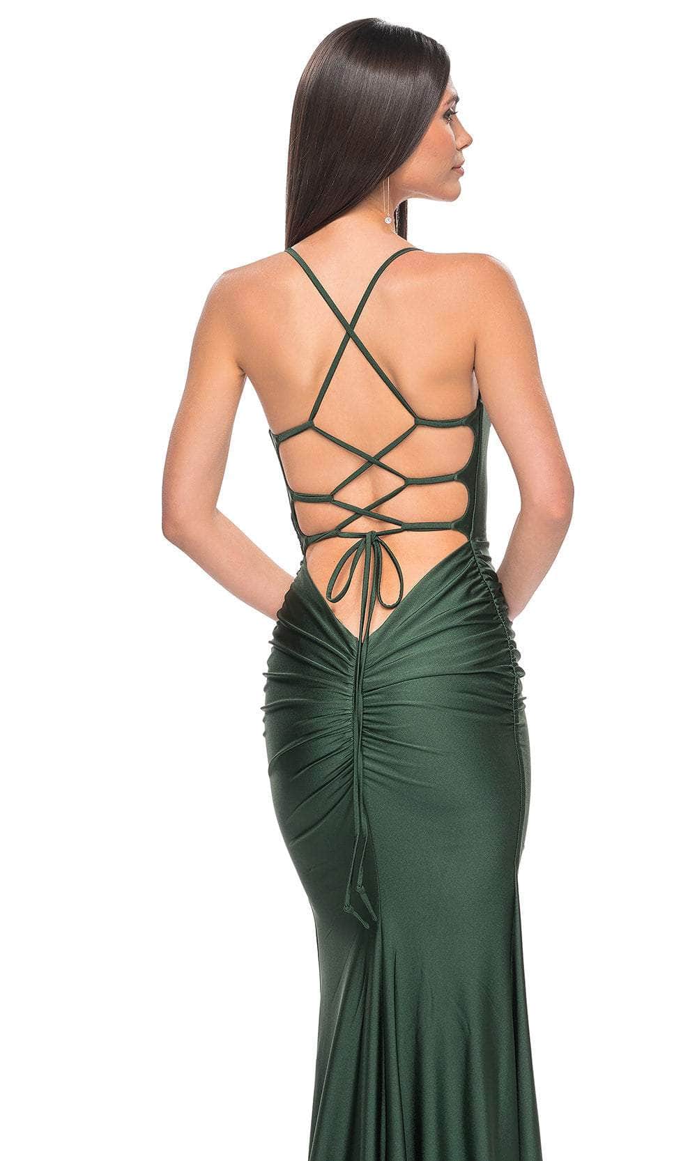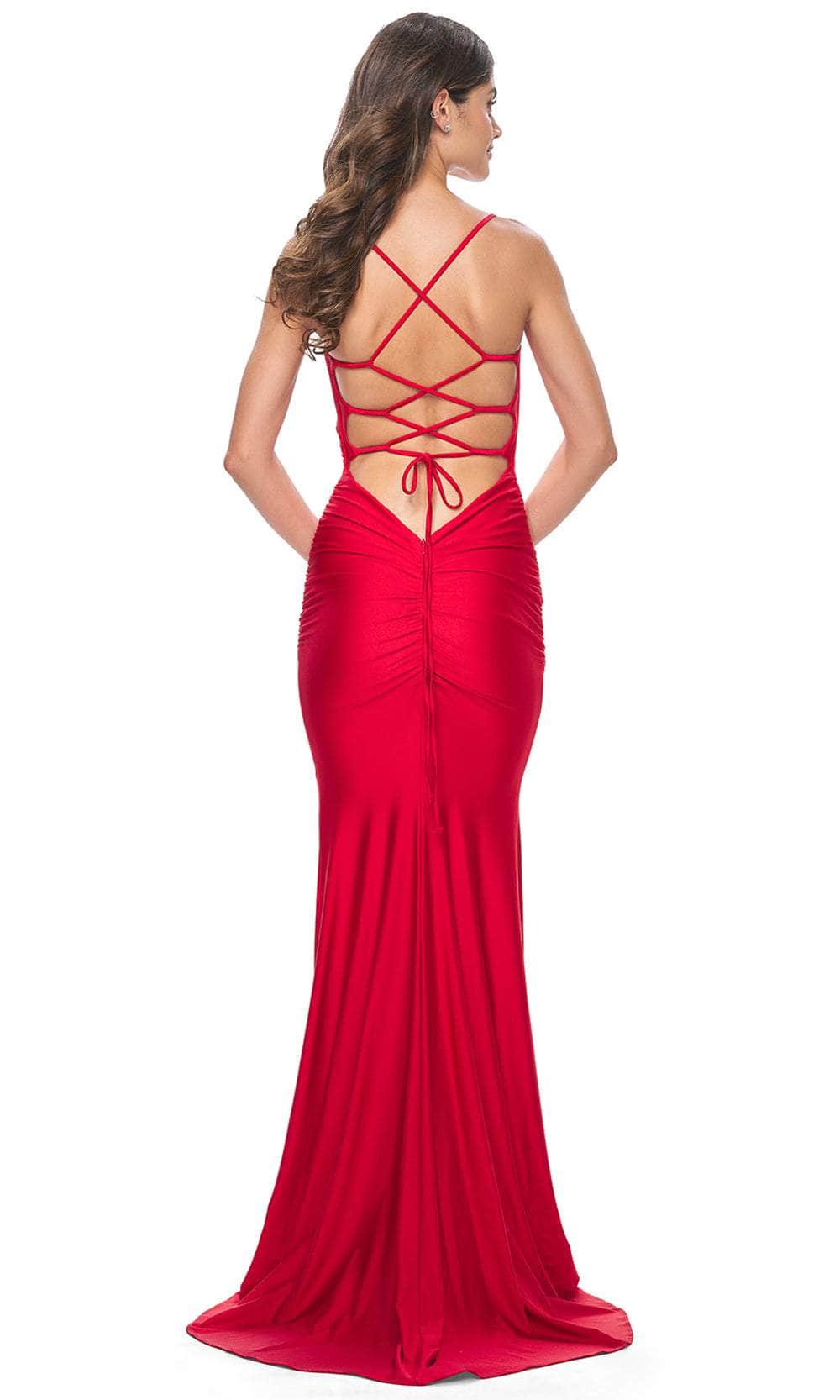 Sashay into the ballroom with grace and elegance in the La Femme 31618 gown, embodying a celestial presence. Its delicate spaghetti straps and ruched jersey fabric on the bodice exude refinement, complemented by a draped V-neckline for added sophistication. The plunging open back, intricately laced with thin straps in a mesmerizing crisscross pattern, offers a tantalizing silhouette. Accentuating the natural waist, the gown gracefully flows into a sheath silhouette, enhanced by a sweeping train. Embrace a style that captivates hearts and leaves onlookers in awe with the enchanting allure of the La Femme 31618 masterpiece. Models are wearing the Black, Emerald, Red, Royal Blue, and Royal Purple colors.