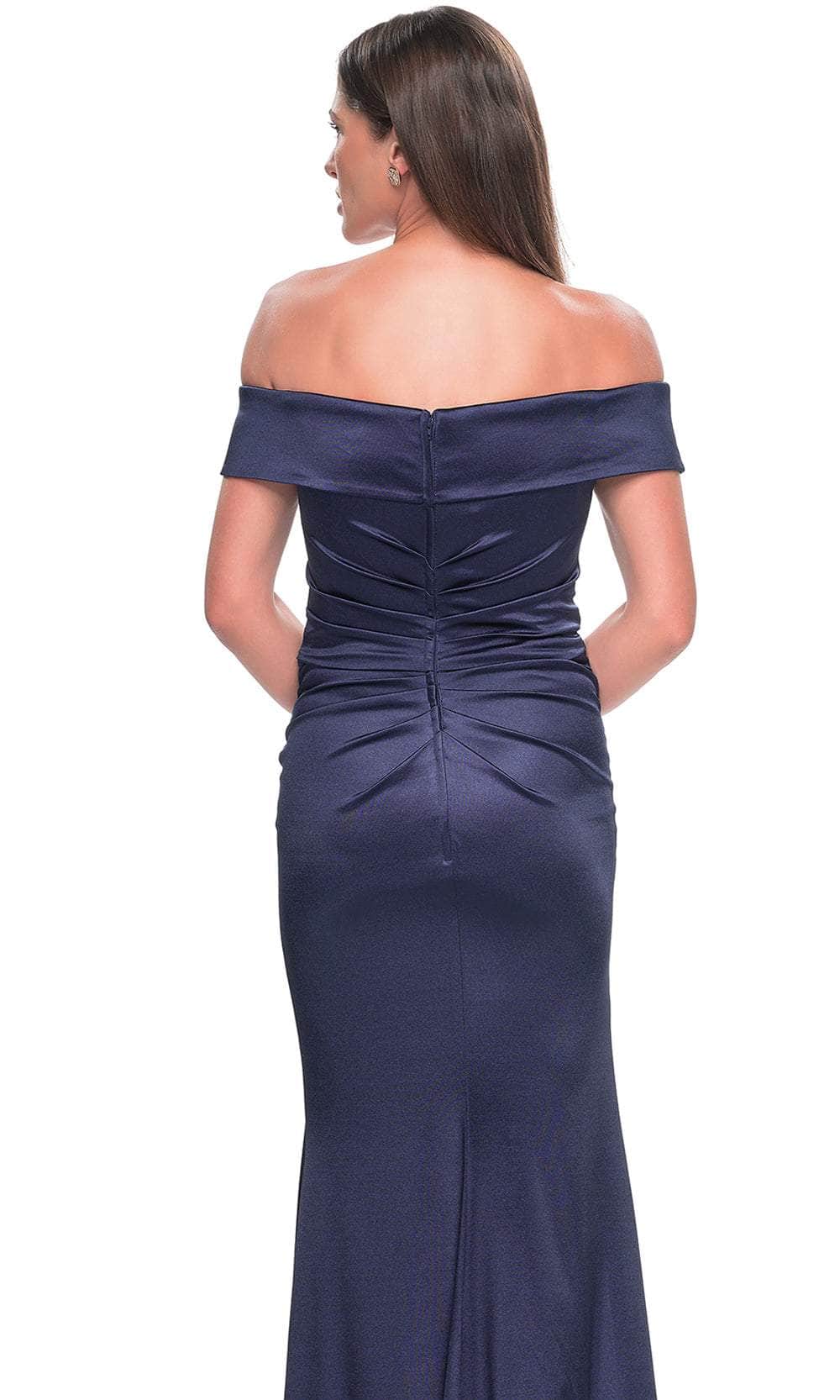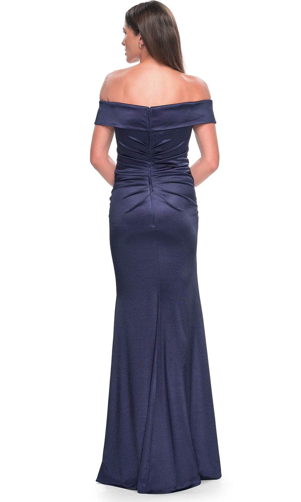 Grace the red carpet wit poise and style wearing this La Femme 31621 creation. Elegantly tailored with precision to accentuate the feminine silhouette, this gown features a sleek satin silhouette adorned with a foldover accent on an off-shoulder neckline. The faux wrap-style bodice is defined by meticulous ruching, creating a flattering and sophisticated look. The midrise back, complemented by a concealed zipper closure, ensures a seamless fit. The mermaid skirt gracefully extends to a floor-length hem, completing the ensemble with a touch of glamour. With its exquisite details and flattering design, this La Femme 31621 gown is a perfect choice for making a statement at any formal event. Model is wearing the Navy color.