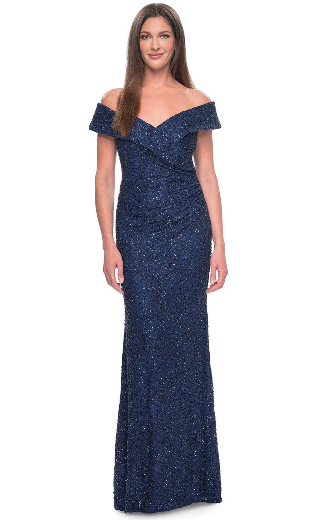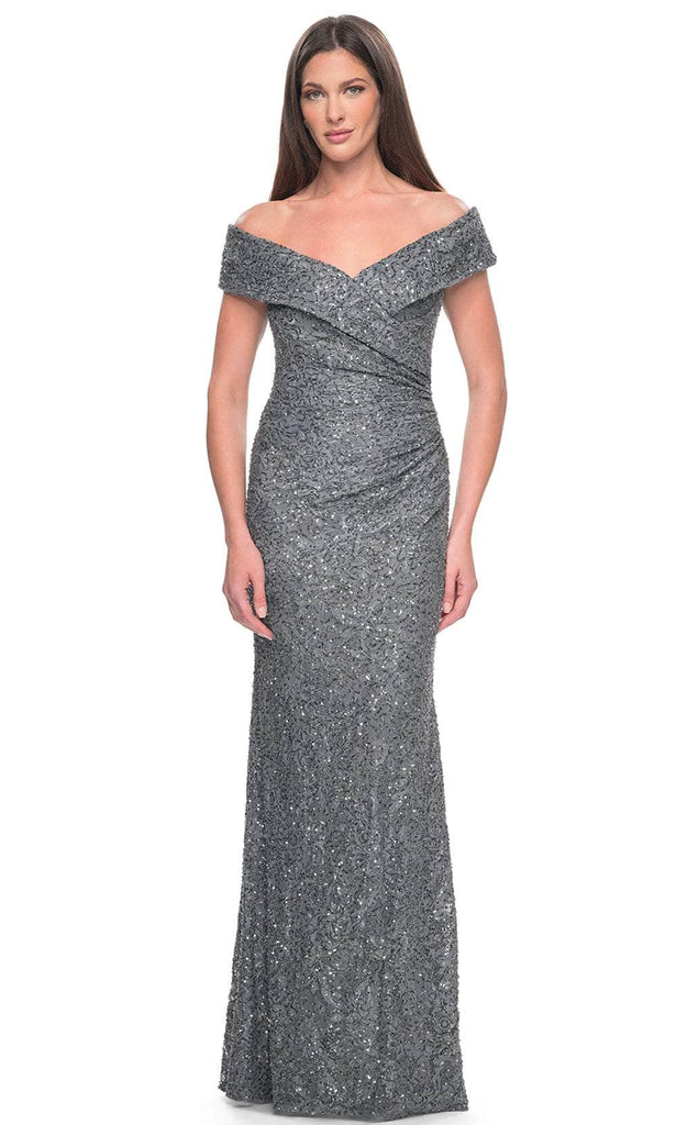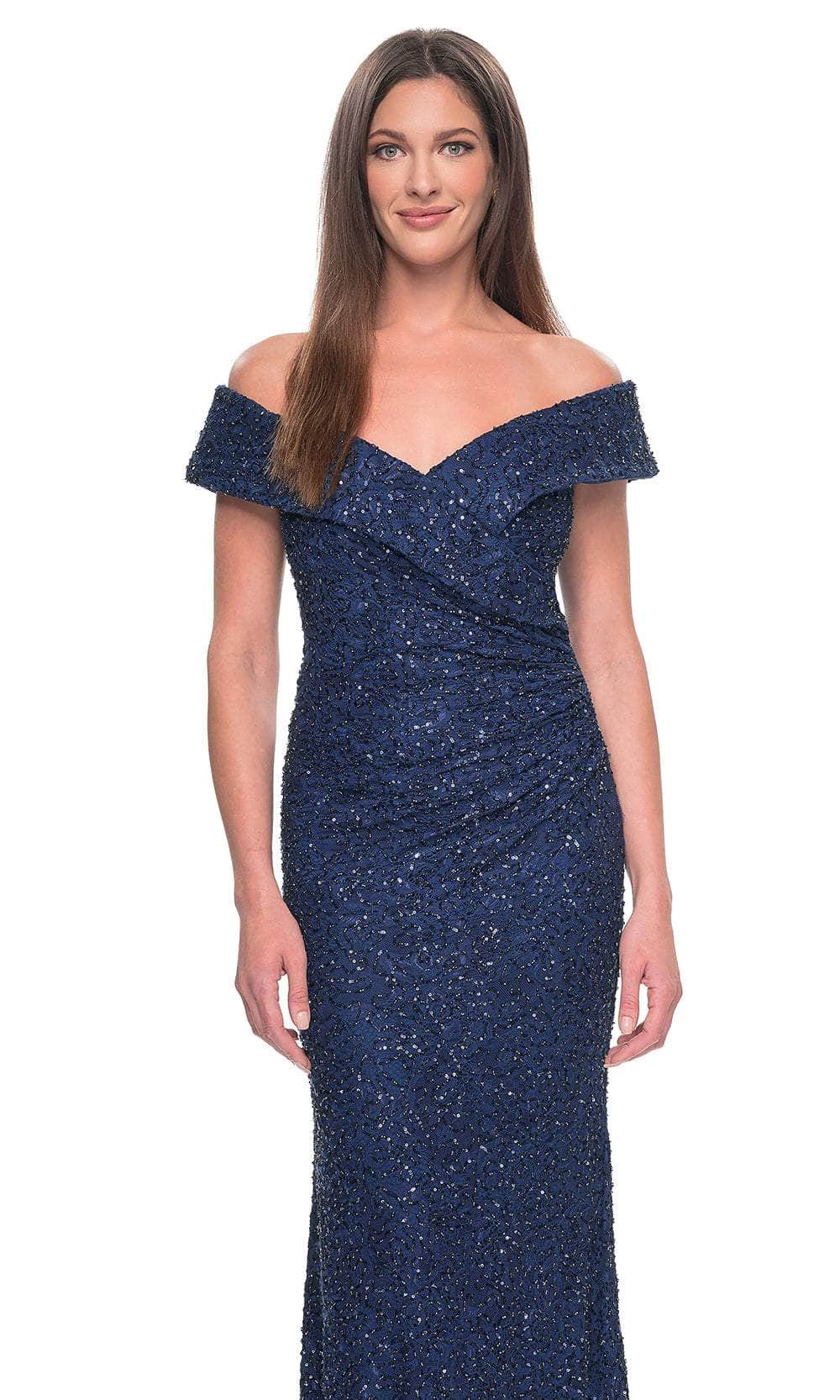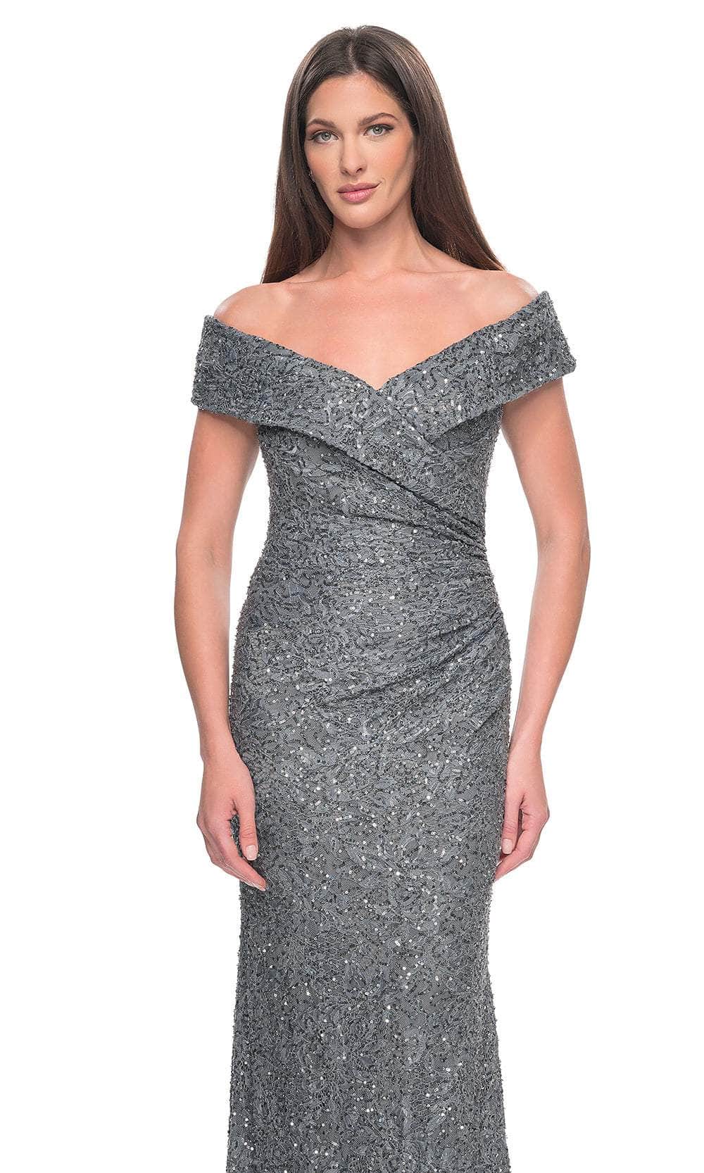 Drape yourself in sophistication with the La Femme 31679 gown, adorned in exquisite lace sprinkled with beaded accents for a touch of opulence. The fold over design creates an off-shoulder neckline, adding a hint of allure to the ensemble. Ruched details grace the faux-wrap bodice, enhancing the visual appeal of the gown. The midrise back, finished with a concealed zipper closure, ensures a seamless fit. The sheath skirt flows gracefully, culminating in a floor-length hem, completing the look with understated elegance. Elevate your style with this La Femme 31679 creation, a perfect fusion of delicate lace and refined design. Models are wearing the Gunmetal and Navy colors.